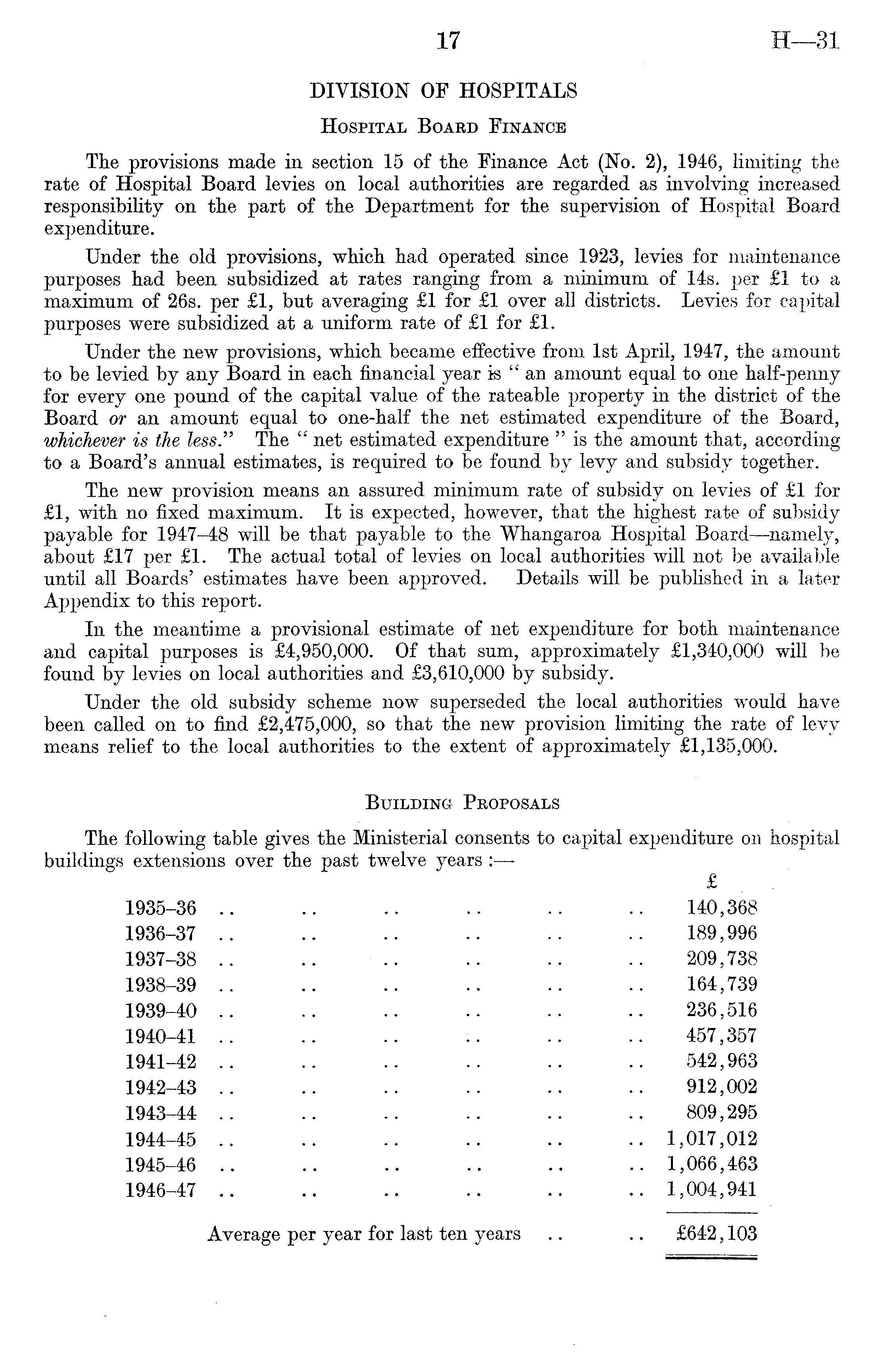 DIVISION OF HOSPITALS Hospital Board Finance The provisions made in section 15 of the Finance Act (No. 2), 1946, limiting the rate of Hospital Board levies on local authorities are regarded as involving increased responsibility on the part of the Department for the supervision of Hospital Board expenditure. Under the old provisions, which had operated since 1923, levies for maintenance purposes had been subsidized at rates ranging from a minimum of 14s. per £1 to a maximum of 265. per £l, but averaging £1 for £1 over all districts. Levies for capital purposes were subsidized at a uniform rate of £1 for £l. Under the new provisions, which became effective from Ist April, 1947, the amount to be levied by any Board in each financial year is " an amount equal to one half-penny for every one pound of the capital value of the rateable property in the district of the Board or an amount equal to one-half the net estimated expenditure of the Board, whichever is the less." The " net estimated expenditure "is the amount that, according to a Board's annual estimates, is required to be found by levy and subsidy together. The new provision means an assured minimum rate of subsidy on levies of £1 for £l, with no fixed maximum. It is expected, however, that the highest rate of subsidy payable for 1947-48 will be that payable to the Whangaroa Hospital Board —namely, about £l7 per £l. The actual total of levies on local authorities will not be available until all Boards' estimates have been approved. Details will be published in a later Appendix to this report. In the meantime a provisional estimate of net expenditure for both maintenance and capital purposes is £4,950,000. Of that sum, approximately £1,340,000 will be found by levies on local authorities and £3,610,000 by subsidy. Under the old subsidy scheme now superseded the local authorities would have been called on to find £2,475,000, so that the new provision limiting the rate of levy means relief to the local authorities to the extent of approximately £1,135,000.. Building Proposals The following table gives the Ministerial consents to capital expenditure on hospital buildings extensions over the past twelve years : £ 1935-36 .. .. .. .. .. .. 140,368 1936-37 .. .. .. .. .. .. 189,996 1937-38 .. .. .. .. .. .. 209,738 1938-39 .. .. .. .. .. .. 164,739 1939-40 .. .. .. .. .. .. 236,516 1940-41 .. .. .. .. .. 457,357 1941-42 .. .. .. .. .. .. 542,963 1942-43 .. .. .. .. .. .. 912,002 1943-44 .. .. .. .. .. .. 809,295 1944-45 .. .. .. .. .. .. 1,017,012 1945-46 .. .. .. .. .. .. 1,066,463 1946-47 .. .. .. 1,004,941 Average per year for last ten years .. .. £642,103
