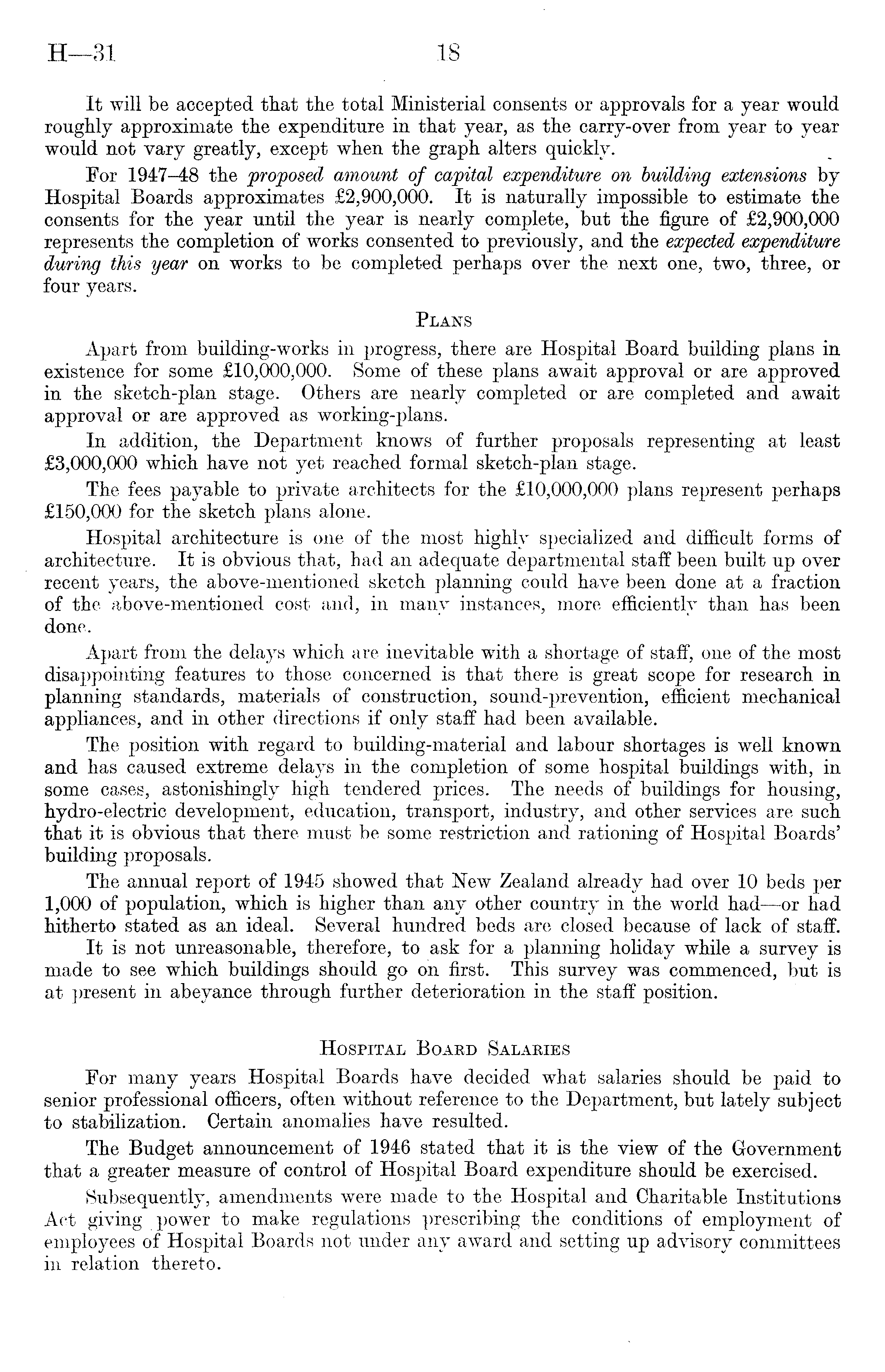 It will be accepted that the total Ministerial consents or approvals for a year would roughly approximate the expenditure in that year, as the carry-over from year to year would not vary greatly, except when the graph alters quickly. For 1947-48 the 'proposed amount of capital expenditure on building extensions by Hospital Boards approximates £2,900,000. It is naturally impossible to estimate the consents for the year until the year is nearly complete, but the figure of £2,900,000 represents the completion of works consented to previously, and the expected expenditure during this year on works to be completed perhaps over the next one, two, three, or four years. Plans Apart from building-works in progress, there are Hospital Board building plans in existence for some £10,000,000. Some of these plans await approval or are approved in the sketch-plan stage. Others are nearly completed or are completed and await approval or are approved as working-plans. In addition, the Department knows of further proposals representing at least £3,000,000 which have not yet reached formal sketch-plan stage. The fees payable to private architects for the £10,000,000 plans represent perhaps £150,000 for the sketch plans alone. Hospital architecture is one of the most highly specialized and difficult forms of architecture. It is obvious that, had an adequate departmental staff been built up over recent years, the above-mentioned sketch planning could have been done at a fraction of the above-mentioned cost and, in many instances, more efficiently than has been done. Apart from the delays which are inevitable with a shortage of staff, one of the most disappointing features to those concerned is that there is great scope for research in planning standards, materials of construction, sound-prevention, efficient mechanical appliances, and in other directions if only staff had been available. The position with regard to building-material and labour shortages is well known and has caused extreme delays in the completion of some hospital buildings with, in some cases, astonishingly high tendered prices. The needs of buildings for housing, hydro-electric development, education, transport, industry, and other services are such that it is obvious that there must be some restriction and rationing of Hospital Boards' building proposals. The annual report of 1945 showed that New Zealand already had over 10 beds per 1,000 of population, which is higher than any other country in the world had —or had hitherto stated as an ideal. Several hundred beds are closed because of lack of staff. It is not unreasonable, therefore, to ask for a planning holiday while a survey is made to see which buildings should go on first. This survey was commenced, but is at present in abeyance through further deterioration in the staff position. Hospital Board Salaries For many years Hospital Boards have decided what salaries should be paid to senior professional officers, often without reference to the Department, but lately subject to stabilization. Certain anomalies have resulted. The Budget announcement of 1946 stated that it is the view of the Government that a greater measure of control of Hospital Board expenditure should be exercised. Subsequently, amendments were made to the Hospital and Charitable Institutions Act giving power to make regulations prescribing the conditions of employment of employees of Hospital Boards not under any award and setting up advisory committees in relation thereto.