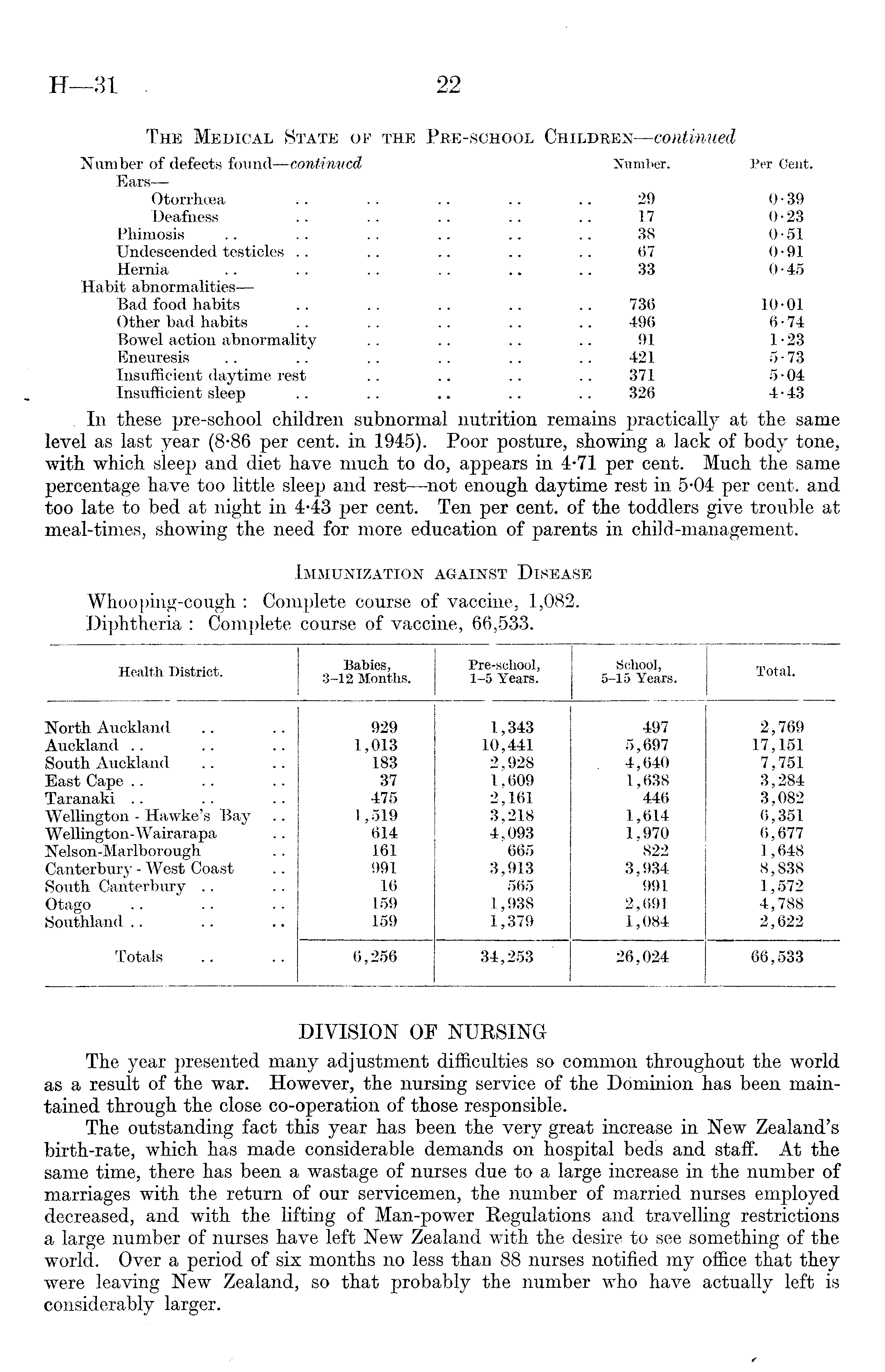 DIVISION OF NURSING The year presented many adjustment difficulties so common throughout the world as a result of the war. However, the nursing service of the Dominion has been maintained through the close co-operation of those responsible. The outstanding fact this year has been the very great increase in New Zealand's birth-rate, which has made considerable demands on hospital beds and staff. At the same time, there has been a wastage of nurses due to a large increase in the number of marriages with the return of our servicemen, the number of married nurses employed decreased, and with the lifting of Man-power Regulations and travelling restrictions a large number of nurses have left New Zealand with the desire to see something of the world. Over a period of six months no less than 88 nurses notified my office that they were leaving New Zealand, so that probably the number who have actually left is considerably larger.