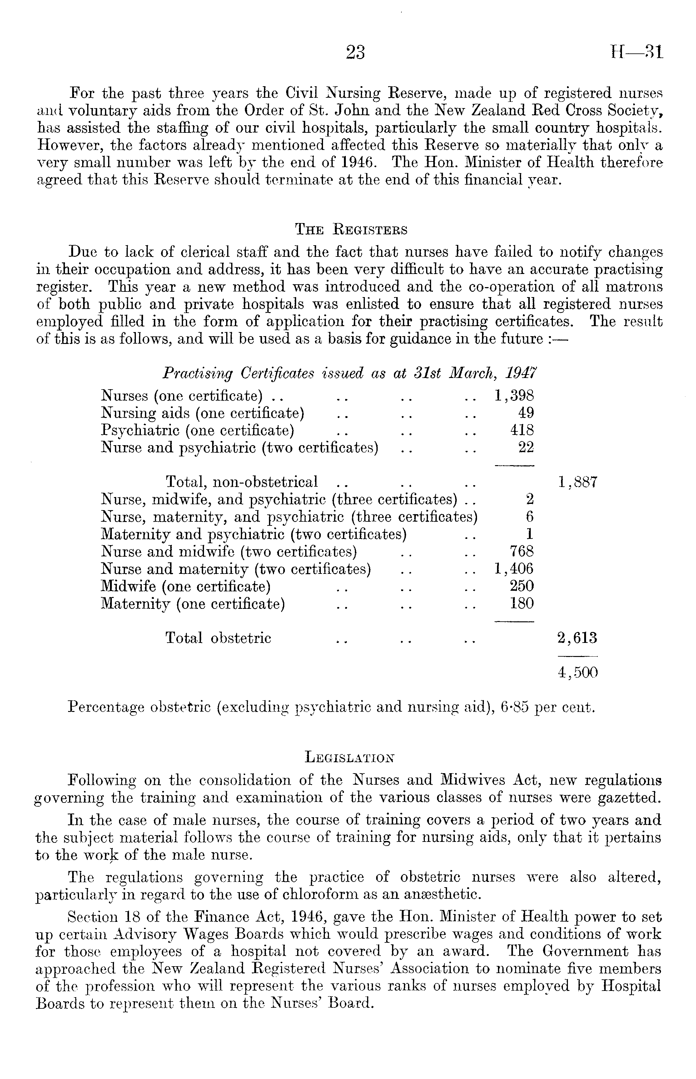 For the past three years the Civil Nursing Reserve, made up of registered nurses and voluntary aids from the Order of St. John and the New Zealand Red Cross Society, has assisted the staffing of our civil hospitals, particularly the small country hospitals. However, the factors already mentioned affected this Reserve so materially that only a very small number was left by the end of 1946. The Hon. Minister of Health therefore agreed that this Reserve should terminate at the end of this financial year. The Registers Due to lack of clerical staff and the fact that nurses have failed to notify changes in their occupation and address, it has been very difficult to have an accurate practising register. This year a new method was introduced and the co-operation of all matrons of both public and private hospitals was enlisted to ensure that all registered nurses employed filled in the form of application for their practising certificates. The result of this is as follows, and will be used as a basis for guidance in the future : Practising Certificates issued as at 31st March, 1947 Nurses (one certificate) .. .. .. 1,398 Nursing aids (one certificate) .. .. .. 49 Psychiatric (one certificate) .. .. .. 418 Nurse and psychiatric (two certificates) .. .. 22 Total, non-obstetrical .. .. .. 1,887 Nurse, midwife, and psychiatric (three certificates) .. 2 Nurse, maternity, and psychiatric (three certificates) 6 Maternity and psychiatric (two certificates) .. 1 Nurse and midwife (two certificates) .. .. 768 Nurse and maternity (two certificates) .. .. 1,406 Midwife (one certificate) .. .. .. 250 Maternity (one certificate) .. .. .. 180 Total obstetric .. .. .. 2,613 4,500 Percentage obstetric (excluding psychiatric and nursing aid), 6*85 per cent. Legislation Following on the consolidation of the Nurses and Midwives Act, new regulations governing the training and examination of the various classes of nurses were gazetted. In the case of male nurses, the course of training covers a period of two years and the subject material follows the course of training for nursing aids, only that it pertains to the worjc of the male nurse. The regulations governing the practice of obstetric nurses were also altered, particularly in regard to the use of chloroform as an anaesthetic. Section 18 of the Finance Act, 1946, gave the Hon. Minister of Health power to set up certain Advisory Wages Boards which would prescribe wages and conditions of work for those employees of a hospital not covered by an award. The Government has approached the New Zealand Registered Nurses' Association to nominate five members of the profession who will represent the various ranks of nurses employed by Hospital Boards to represent them on the Nurses' Board.