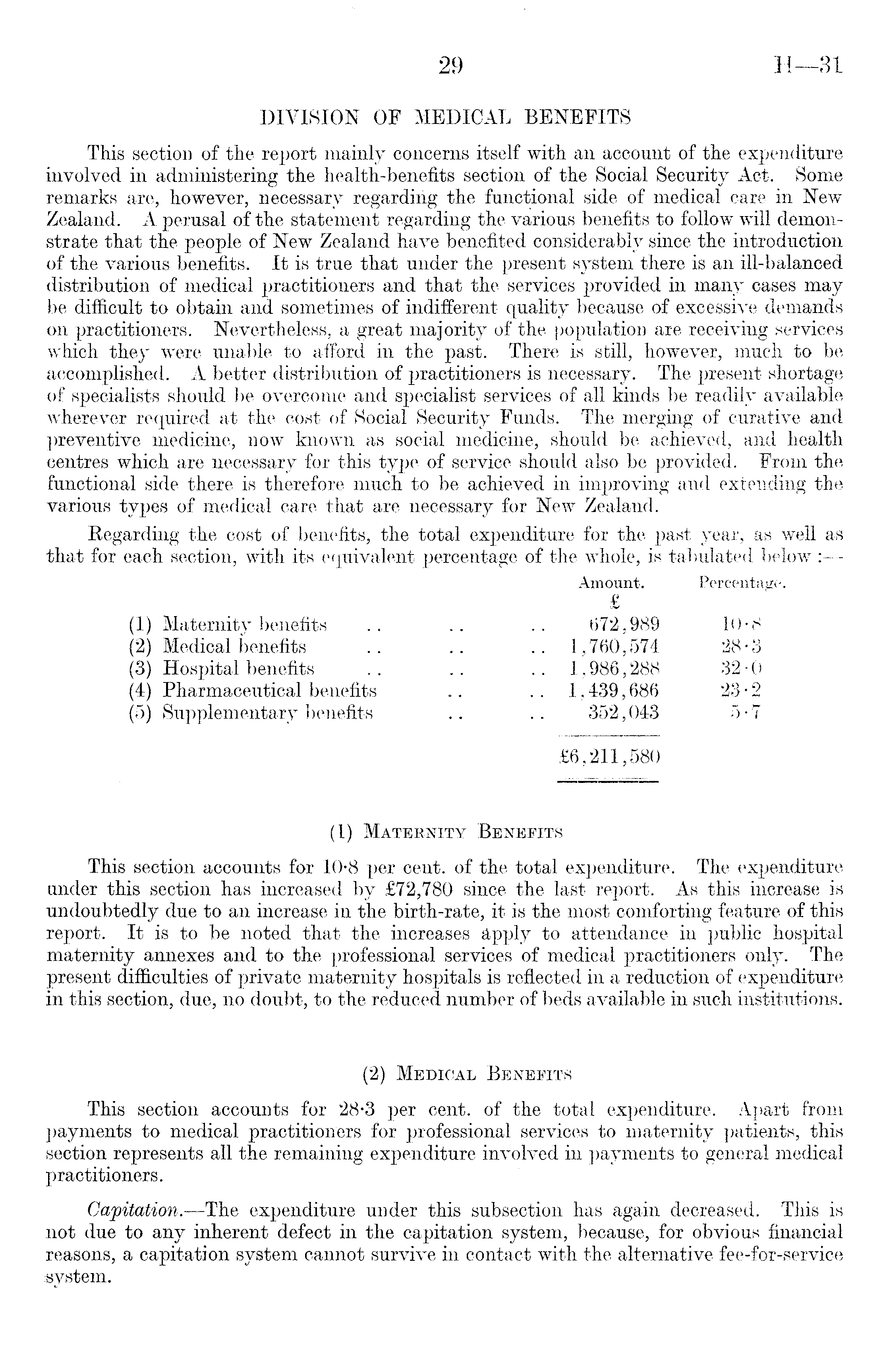 DIVISION OF MEDICAL BENEFITS This section of the report mainly concerns itself with an account of the expenditure involved in administering the health-benefits section of the Social Security Act. Some remarks are, however, necessary regarding the functional side of medical care in New Zealand. A perusal of the statement regarding the various benefits to follow will demonstrate that the people of New Zealand have benefited considerably since the introduction of the various benefits. It is true that under the present system there is an ill-balanced distribution of medical practitioners and that the services provided in many cases may be difficult to obtain and sometimes of indifferent quality because of excessive demands on practitioners. Nevertheless, a great majority of the population are receiving services which they were unable to afford in the past. There is still, however, much to be accomplished. A better distribution of practitioners is necessary. The present shortage of specialists should be overcome and specialist services of all kinds be readily available wherever required at the cost of Social Security Funds. The merging of curative and preventive medicine, now known as social medicine, should be achieved, and health centres which are necessary for this type of service should also be provided. From the functional side there is therefore much to be achieved in improving and extending the various types of medical care that are necessary for New Zealand. Regarding the cost of benefits, the total expenditure for the past year, as well as that for each section, with its equivalent percentage of the whole, is tabulated below : Amount. Percentage. £ (1) Maternity benefits .. .. .. 672,989 10*8 (2) Medical benefits .. .. .. 1,760,574 28-3-(3) Hospital benefits .. .. 1,986,288 32 • 0 (4) Pharmaceutical benefits .. .. 1,439,686 23 • 2 (5) Supplementary benefits .. .. 352,043 5• 7 £6,211,580 (1) Maternity Benefits This section accounts for 10-8 per cent, of the total expenditure. The expenditure under this section has increased by £72,780 since the last report. As this increase is undoubtedly due to an increase in the birth-rate, it is the most comforting feature of this report. It is to be noted that the increases Apply to attendance in public hospital maternity annexes and to the professional services of medical practitioners only. The present difficulties of private maternity hospitals is reflected in a reduction of expenditure in this section, due, no doubt, to the reduced number of beds available in such institutions. (2) Medical Benefits This section accounts for 28-3 per cent, of the total expenditure. Apart from payments to medical practition'ers for professional services to maternity patients, this section represents all the remaining expenditure involved in payments to general medical practitioners. Capitation.—The expenditure under this subsection has again decreased. This is not due to any inherent defect in the capitation system, because, for obvious financial reasons, a capitation system cannot survive in contact with the alternative fee-for-service system.