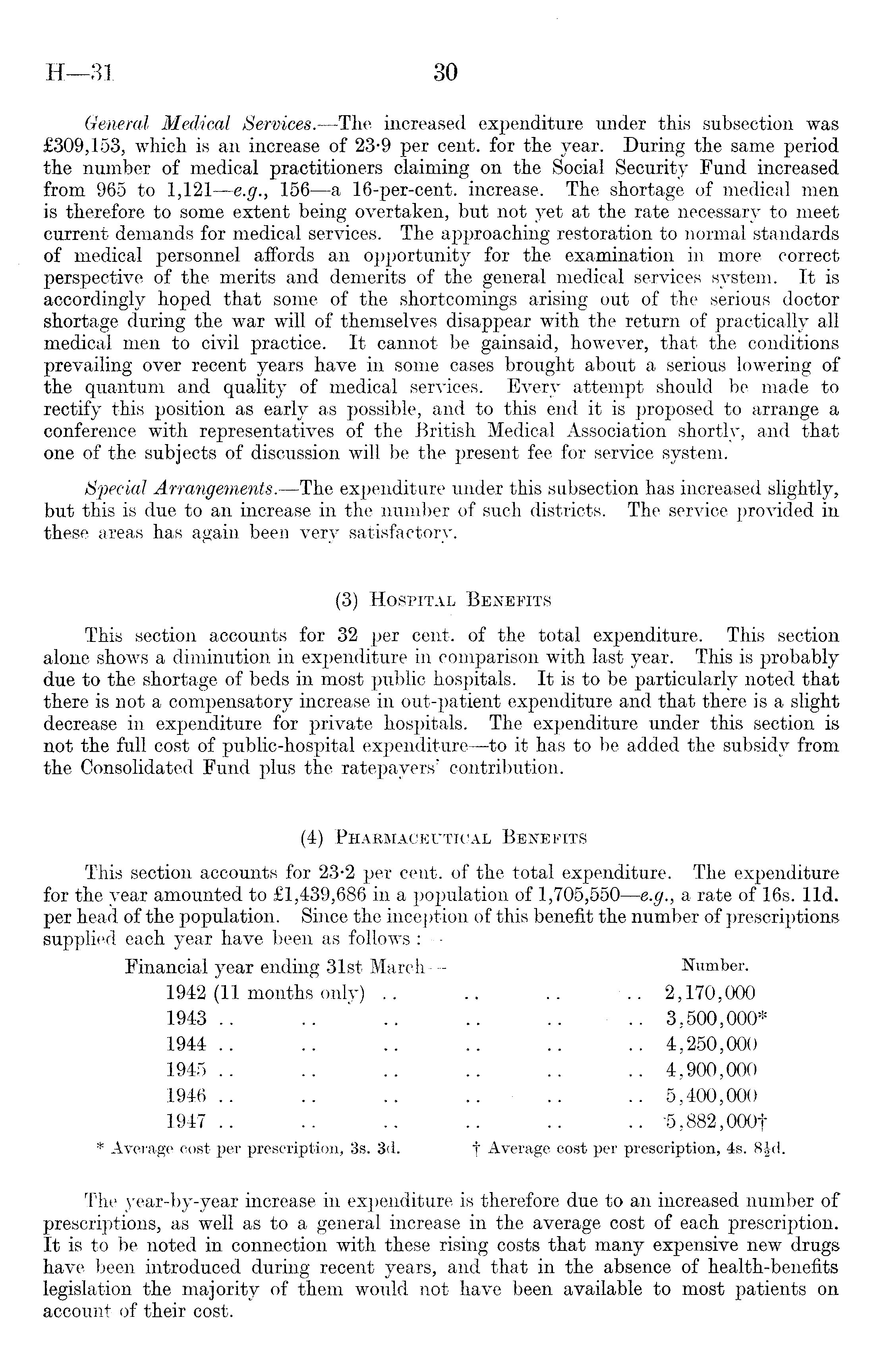 General Medical Services. —The increased expenditure under this subsection was £309,153, which, is an increase of 23-9 per cent, for the year. During the same period the number of medical practitioners claiming on the Social Security Fund increased from 965 to 1,121 —e.g., 156—a 16-per-cent. increase. The shortage of medical men is therefore to some extent being overtaken, but not yet at the rate necessary to meet current demands for medical services. The approaching restoration to normal standards of medical personnel affords an opportunity for the examination in more correct perspective of the merits and demerits of the general medical services system. It is accordingly hoped that some of the shortcomings arising out of the serious doctor shortage during the war will of themselves disappear with the return of practically all medical men to civil practice. It cannot be gainsaid, however, that the conditions prevailing over recent years have in some cases brought about a serious lowering of the quantum and quality of medical services. Every attempt should be made to rectify this position as early as possible, and to this end it is proposed to arrange a conference with representatives of the British Medical Association shortly, and that one of the subjects of discussion will be the present fee for service system. Special Arrangements.—The expenditure under this subsection has increased slightly, but this is due to an increase in the number of such districts. The service provided in these areas has again been very satisfactory. (3) Hospital Benefits This section accounts for 32 per cent, of the total expenditure. This section alone shows a diminution in expenditure in comparison with last year. This is probably due to the shortage of beds in most public hospitals. It is to be particularly noted that there is not a compensatory increase in out-patient expenditure and that there is a slight decrease in expenditure for private hospitals. The expenditure under this section is not the full cost of public-hospital expenditure —to it has to be added the subsidy from the Consolidated Fund plus the ratepayers' contribution. (4) Pharmaceutical Benefits This section accounts for 23-2 per cent, of the total expenditure. The expenditure for the year amounted to £1,439,686 in a population of 1,705,550—e.g., a rate of 16s. lid. per head of the population. Since the inception of this benefit the number of prescriptions supplied each year have been as follows : Financial year ending 31st March — ' Number. 1942 (11 months only) .. .. .. .. 2,170,000 1943 .. .... .. .. .. 3,500,000* 1944 .. .. .. .. .. .. 4,250,000 1945 .. .. .. .. .. .. 4,900,000 1946 .. .. .. .... .. 5,400,000 1947 .. .. .. .. .. .. -5,882,000f * Average cost per prescription, 3s. 3d. j Average cost per prescription, 4s. 8 Jkl. The year-by-year increase in expenditure is therefore due to an increased number of prescriptions, as well as to a general increase in the average cost of each prescription. It is to be noted in connection with these rising costs that many expensive new drugs have been introduced during recent years, and that in the absence of health-benefits legislation the majority of them would not have been available to most patients on account of their cost.