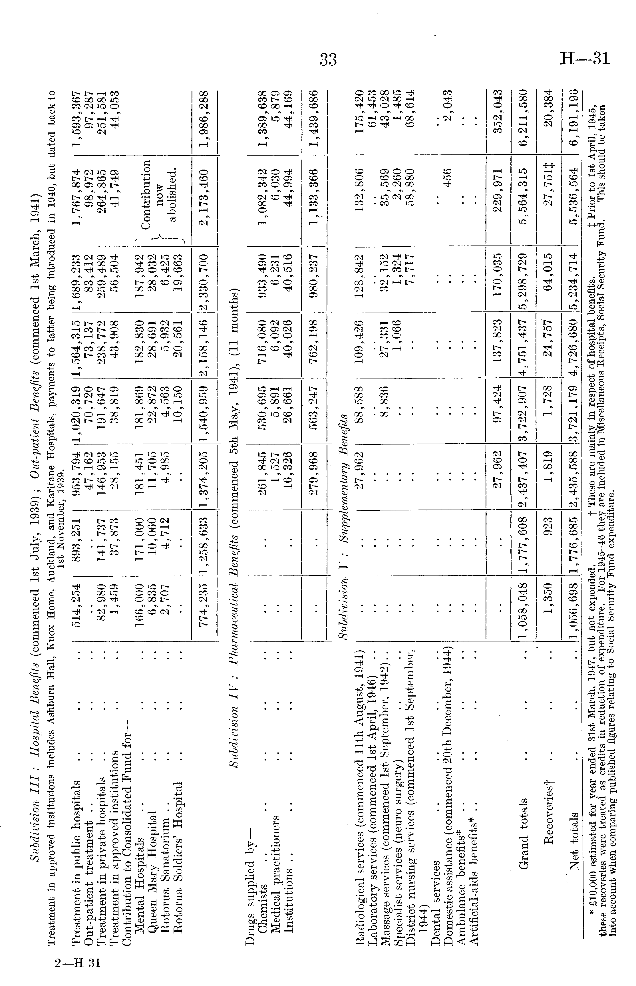 Subdivision III: Hospital Benefits (commenced 1st July, 1939); Out-patient Benefits (commenced 1st March, 1941) Treatment in approved institutions includes Ashburn Hall, Knox Home, Auckland, and Karitane Hospitals, payments to latter being introduced in 1940, but dated back to 1st-November, 1939.