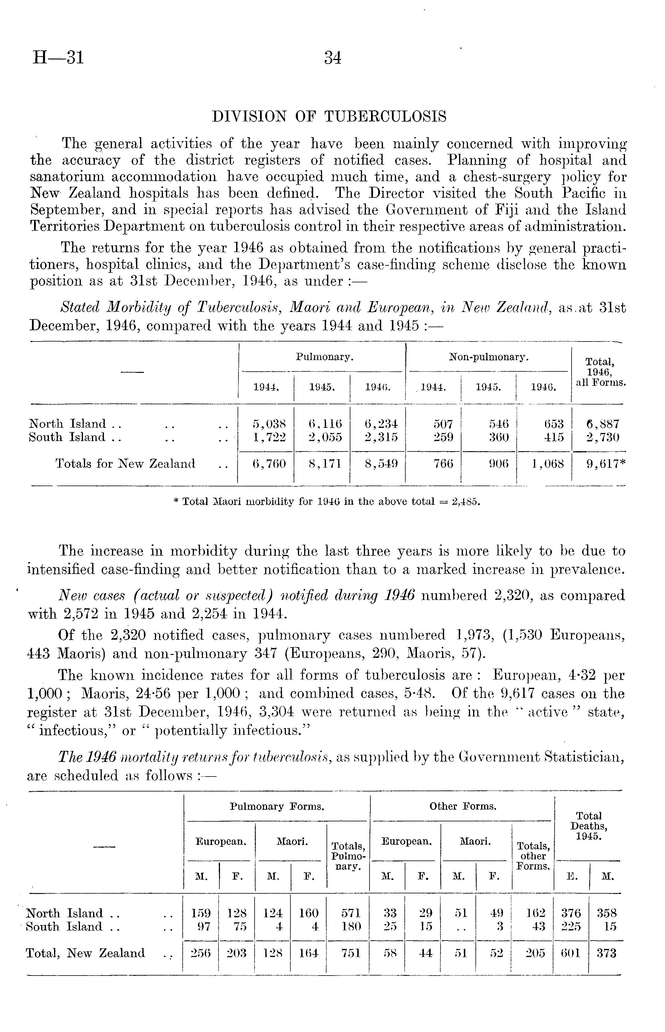 The increase in morbidity during the last three years is more likely to be due to intensified case-finding and better notification than to a marked increase in prevalence. New cases (actual or suspected) notified during 1946 numbered 2,320, as compared with 2,572 in 1945 and 2,254 in 1944. Of the 2,320 notified cases, pulmonary cases numbered 1,973, (1,530 Europeans, 443 Maoris) and non-pulmonary 347 (Europeans, 290, Maoris, 57). The known incidence rates for all forms of tuberculosis are : European, 4-32 per 1,000 ; Maoris, 24-56 per 1,000 ; and combined cases, 5-48. Of the 9,617 cases on the register at 31st December, 1946, 3,304 were returned as being in the " active " state, " infectious," or " potentially infectious." The 1946 mortality returns for tuberculosis, as supplied by the Government Statistician, are scheduled as follows