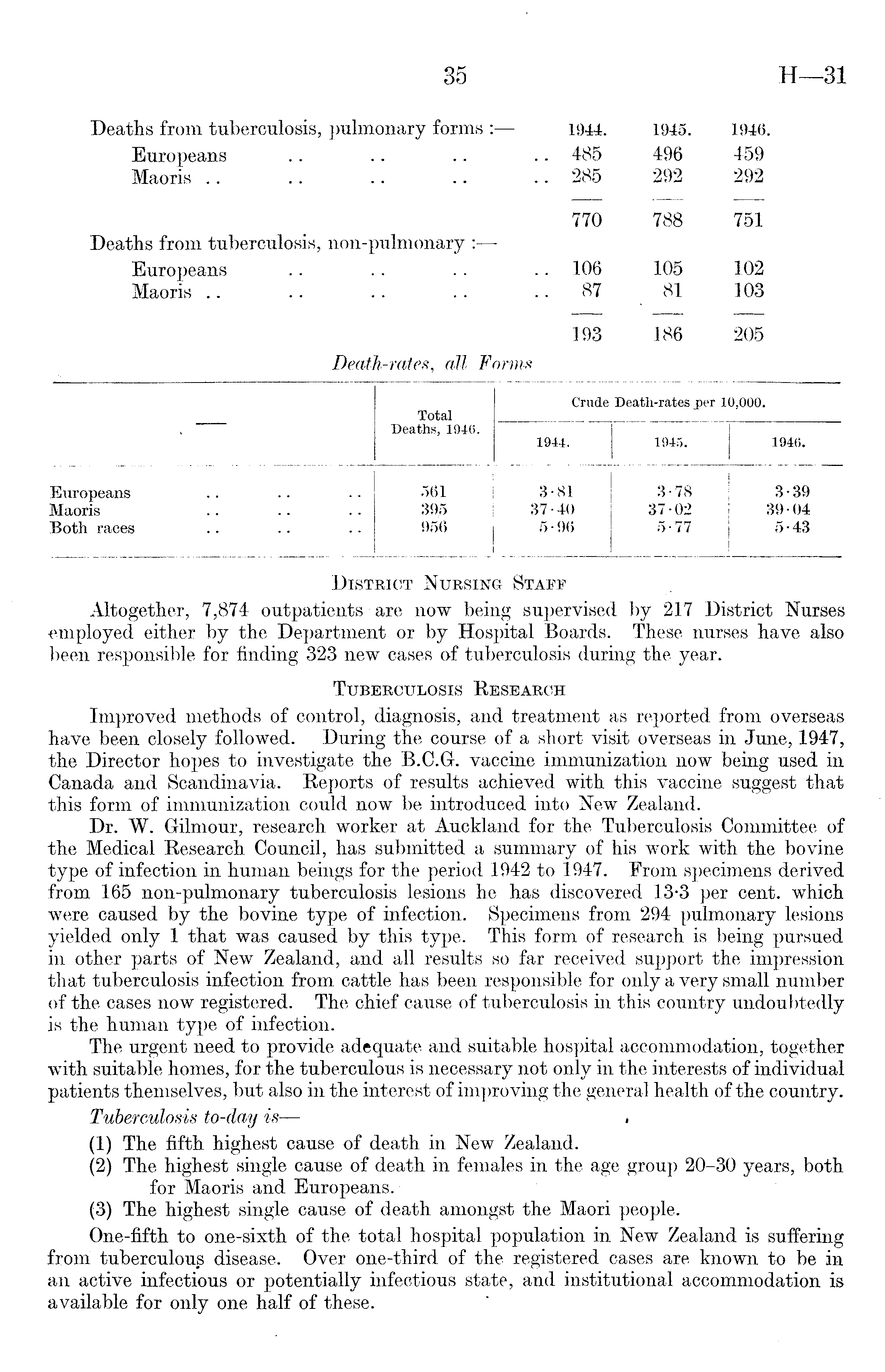 Deaths from tuberculosis, pulmonary forms : 1944. 1945. 1946. Europeans .. .. .. .. 485 496 459 Maoris .. .. .. .. ..285 292 292 770 788 751 Deaths from tuberculosis, non-pulmonary : Europeans .. .. .. .. 106 105 102 Maoris .. .. .. .. 87 81 103 193 186 205 Death-rates, all Forms