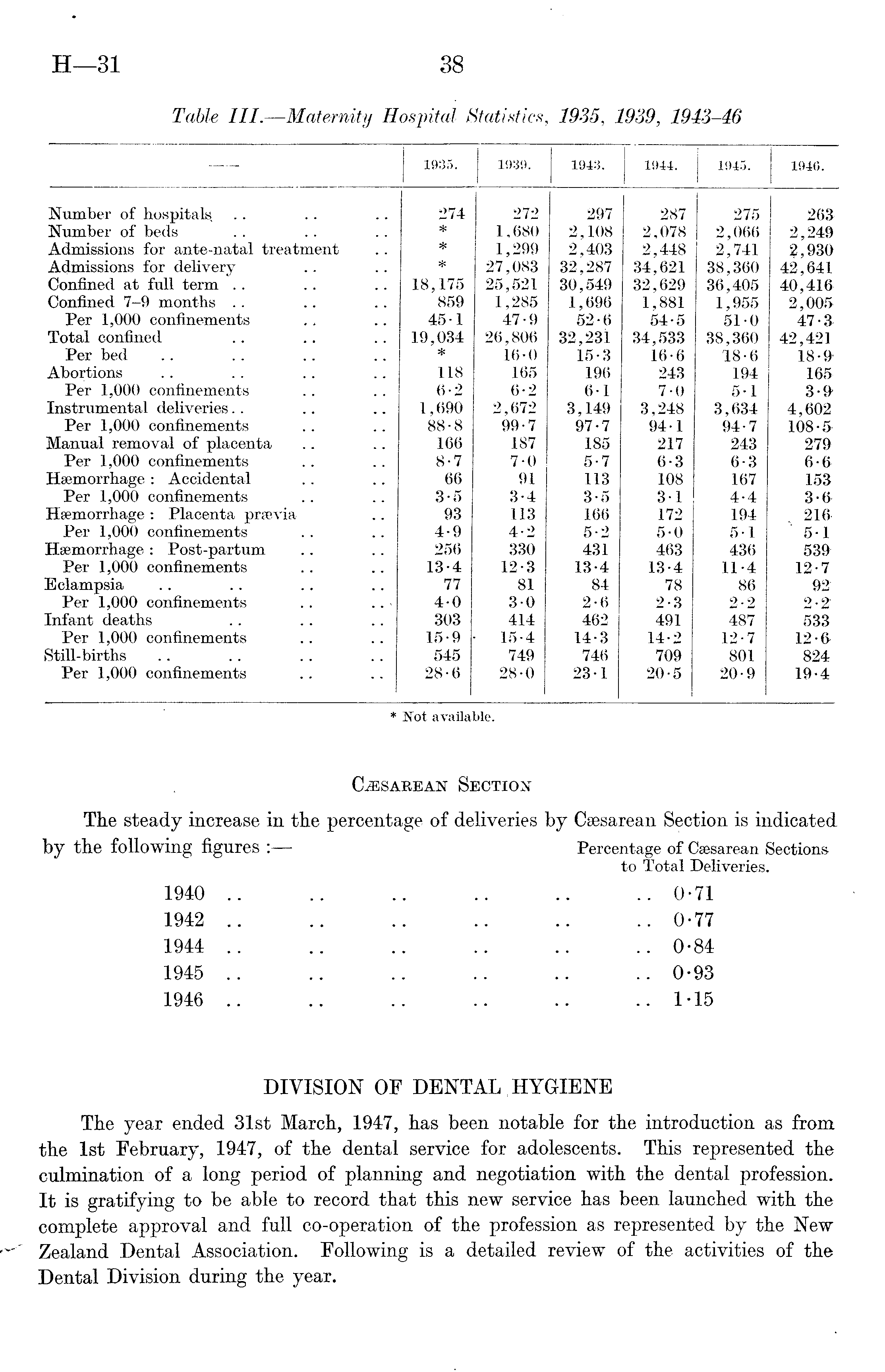 Cesarean Section The steady increase in the percentage of deliveries by Csesarean Section is indicated by the following figures : Percentage of Csesarean Sections to Total Deliveries. 1940 .. ... .. .. .. .. 0-71 1942 .. .. .. .. .. .. 0-77 1944 .. .. .. .. .. .. 0-84 1945 .. .. .. .. .. .. 0-93 1946 .. .. .. .. .. ..1-15 DIVISION OF DENTAL HYGIENE The year ended 31st March, 1947, has been notable for the introduction as from the Ist February, 1947, of the dental service for adolescents. This represented the culmination of a long period of planning and negotiation with the dental profession. It is gratifying tp be able to record that this new service has been launched with the complete approval and full co-operation of the profession as represented by the New Zealand Dental Association. Following is a detailed review of the • activities of the Dental Division during the year.