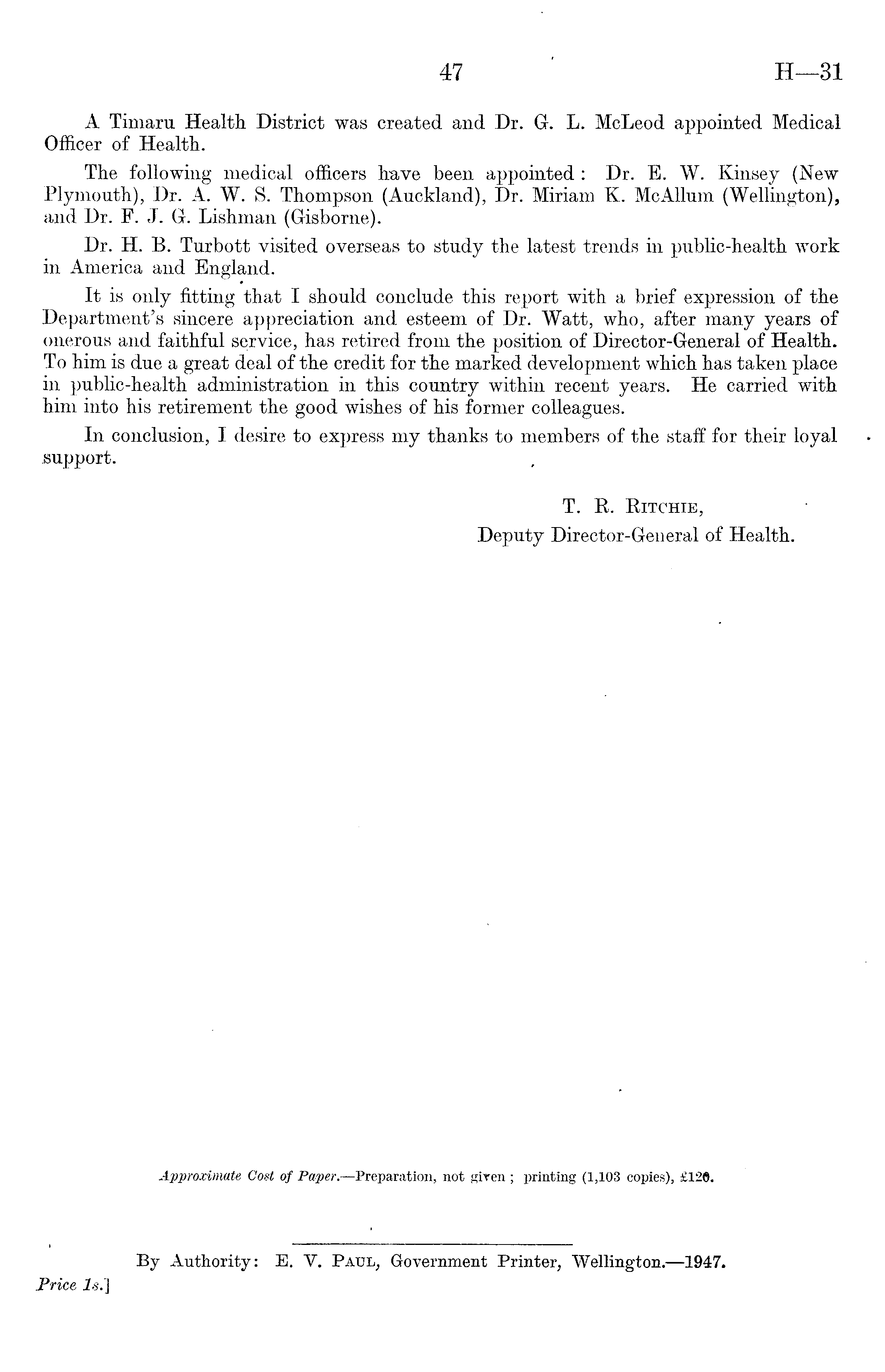 A Timaru Health District was created and Dr. G. L. McLeod appointed Medical Officer of Health. The following medical officers have been appointed : Dr. E. W. Kinsey (New Plymouth), Dr. A. W. S. Thompson (Auckland), Dr. Miriam K. McAllum (Wellington), and Dr. F. J. G. Lishman (Gisborne). Dr. H. B. Turbott visited overseas to study the latest trends in public-health work in America and England. It is only fitting that I should conclude this report with a brief expression of the Department's sincere appreciation and esteem of Dr. Watt, who, after many years of onerous and faithful service, has retired from the position of Director-General of Health. To him is due a great deal of the credit for the marked development which has taken place in public-health administration in this country within recent years. He carried with him into his retirement the good wishes of his former,colleagues. In conclusion, I desire to express my thanks to members of the staff for their loyal support. T. R. Ritchie, Deputy Director-General of Health.