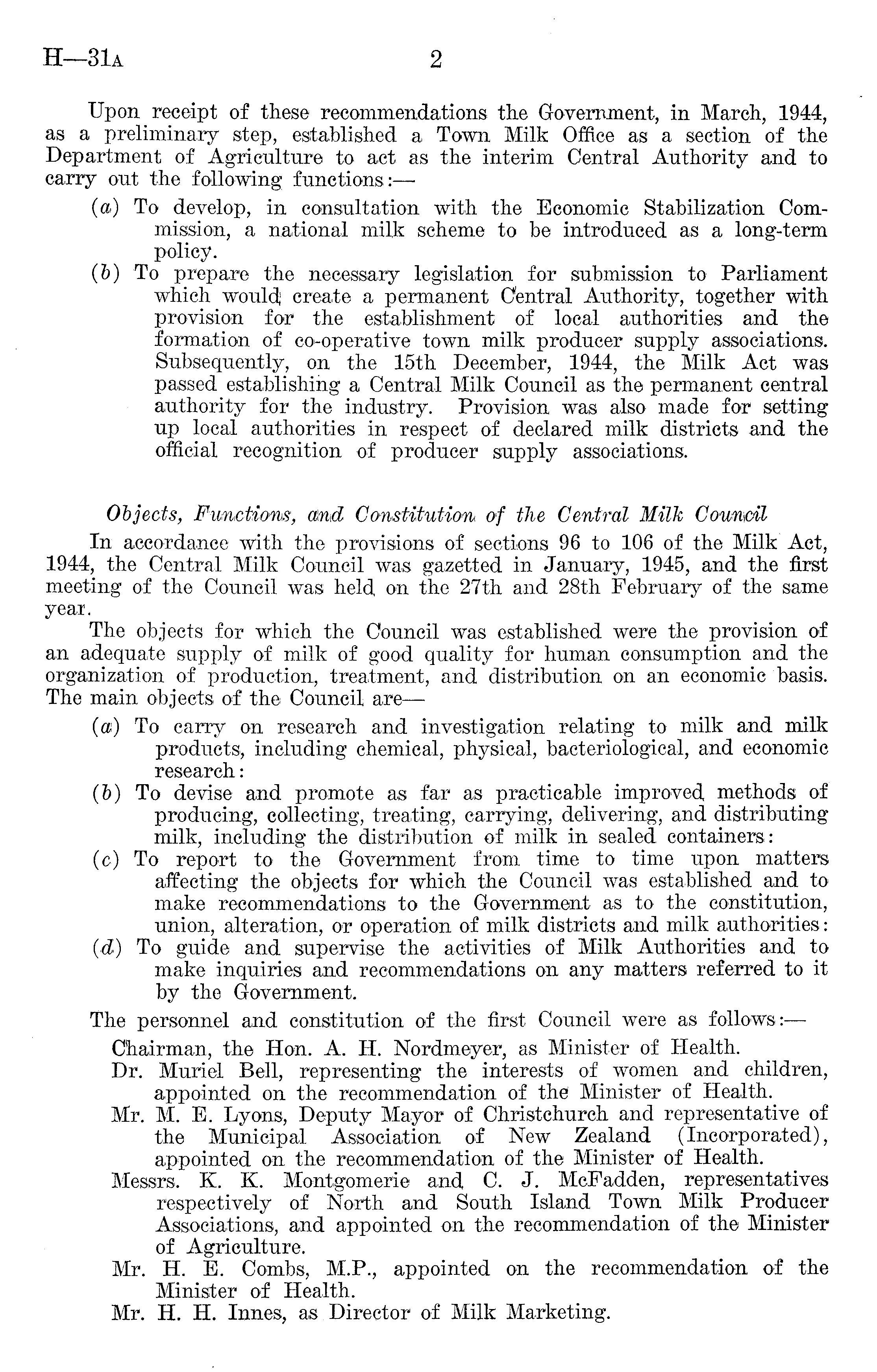 Upon receipt of these recommendations the Government, in March, 1944, as a preliminary step, established a Town Milk Office as a section of the Department of Agriculture to act as the interim Central Authority and to carry out the following functions: — (a) To develop, in consultation with the Economic Stabilization Commission, a national milk scheme to be introduced as a long-term policy. (&) To prepare the necessary legislation for submission to Parliament which would; create a permanent Central Authority, together with provision for the establishment of local authorities and the formation of co-operative town milk producer supply associations. Subsequently, on the 15th December, 1944, the Milk Act was passed establishing a Central Milk Council as the permanent central authority for the industry. Provision was also made for setting up local authorities in respect of declared milk districts and the official recognition of producer supply associations. Objects, Fimctio<7bs, amd Constitution of the Central Milk Council In accordance with the provisions of sections 96 to 106 of the Milk Act, 1944, the Central Milk Council was gazetted in January, 1945, and the first meeting of the Council was held on the 27th and 28th February of the same year. The objects for which the Council was established were the provision of an adequate supply of milk of good quality for human consumption and the organization of production, treatment, and distribution on an economic basis. The main objects of the Council are—(a) To carry on research and investigation relating to milk and milk products, including chemical, physical, bacteriological, and economic research: (&) To devise and promote as far as practicable improved, methods of producing, collecting, treating, carrying, delivering, and distributing milk, including the distribution of milk in sealed containers: (c) To report to the Government from time to time upon matters affecting the objects for which the Council was established and to make recommendations to the Government as to the constitution, union, alteration, or operation of milk districts and milk authorities: (d) To guide and supervise the activities of Milk Authorities and to make inquiries and recommendations on any matters referred to it by the Government. The personnel and constitution of the first Council were as follows: Chairman, the Hon. A. H. Nordmeyer, as Minister of Health. Dr. Muriel Bell, representing the interests of women and children, appointed on the recommendation of the Minister of Health. Mr. M. E. Lyons, Deputy Mayor of Christchurch and representative of the Municipal Association of New Zealand (Incorporated), appointed on the recommendation of the Minister of Health. Messrs. K. K. Montgomerie and C. J. McFadden, representatives respectively of North and South Island Town Milk Producer Associations, and appointed on the recommendation of the Minister of Agriculture. Mr. H. E. Combs, M.P., appointed on the recommendation of the Minister of Health. Mr. H. H. Innes, as Director of Milk Marketing.