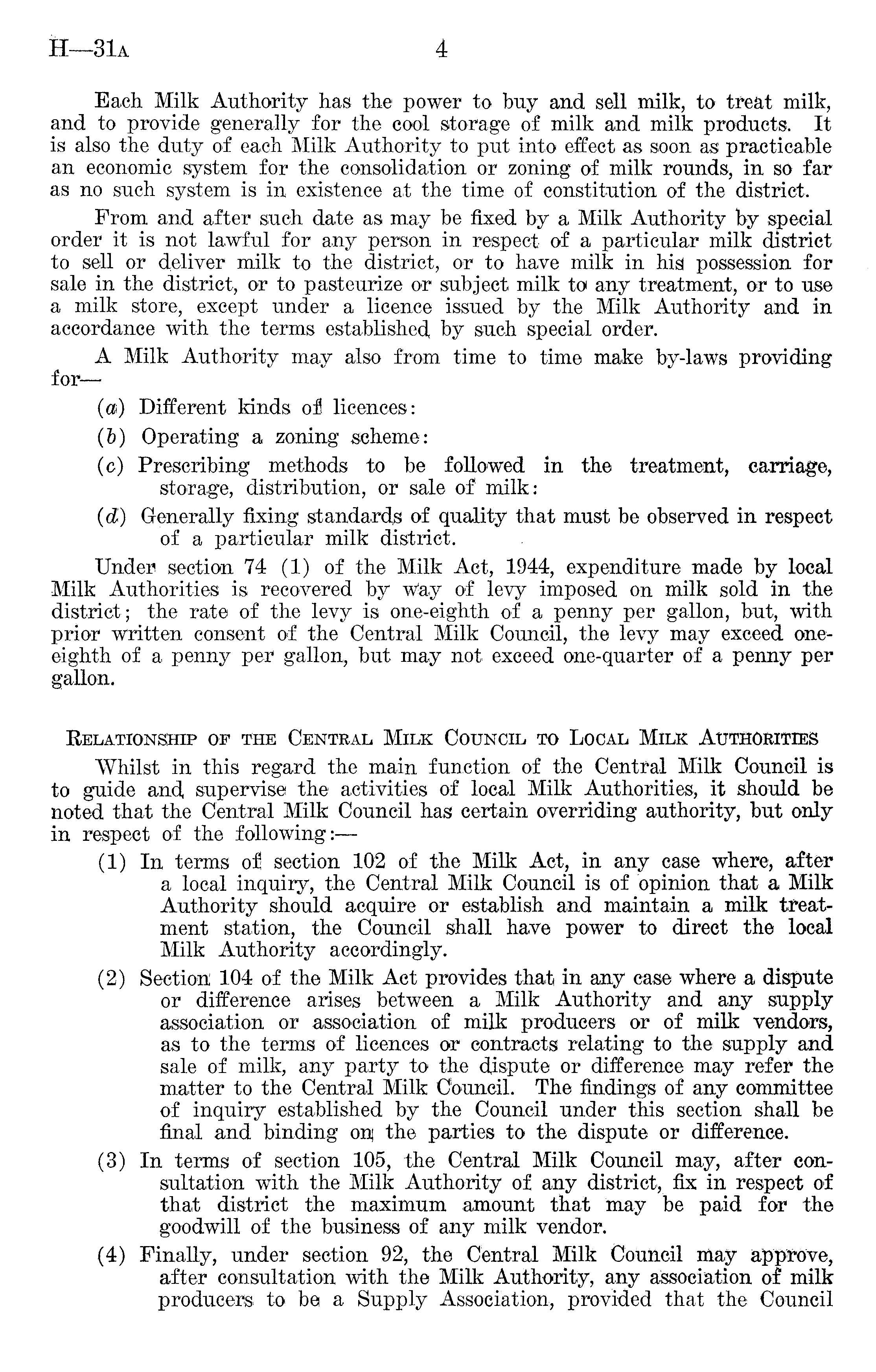 Each Milk Authority has the power to buy and sell milk, to treat milk, and to provide generally for the cool storage of milk and milk products. It is also the duty of each Milk Authority to put into effect as soon as practicable an economic system for the consolidation or zoning of milk rounds, in so far as no such system is in existence at the time of constitution of the district, From and after such date as may be fixed by a Milk Authority by special order it is not lawful for any person in respect of a particular milk district to sell or deliver milk to the district, or to have milk in his: possession for sale in the district, or to pasteurize or subject milk to any treatment, or to use a milk store, except under a licence issued by the Milk Authority and in accordance with the terms established, by such special order. A Milk Authority may also from time to time make by-laws providing for—(a) Different kinds of licences: (&) Operating a zoning scheme: (c) Prescribing methods to be followed in the treatment, carriage, storage, distribution, or sale of milk: (d) Generally fixing standards of quality that must be observed in respect of a particular milk district. Under section 74 (1) of the Milk Act, 1944, expenditure made by local Milk Authorities is recovered by way of levy imposed on milk sold in the district; the rate of the levy is one-eighth of a penny per gallon, but, with prior written consent of the Central Milk Council, the levy may exceed oneeighth of a penny per gallon, but may not exceed one-quarter of a penny per gallon. Relationship of the Central Milk Council to Local Milk Authorities Whilst in this regard the main function of the Central Milk Council is to guide and, supervise the activities of local Milk Authorities, it should be noted that the Central Milk Council has certain overriding authority, but only in respect of the following:— (1) In terms of! section 102 of the Milk Act, in any case where, after a local inquiry, the Central Milk Council is of opinion that a Milk Authority should acquire or establish and maintain a milk treatment station, the Council shall have power to direct the local Milk Authority accordingly. (2) Section 104 of the Milk Act provides that in any case where a dispute or difference arises between a Milk Authority and any supply association or association of milk producers or of milk vendors, as to the terms of licences or contracts relating to the supply and sale of milk, any party to the dispute or difference may refer the matter to the Central Milk Council. The findings of any committee of inquiry established by the Council under this section shall be final and binding on) the parties to the dispute or difference. (3) In terms of section 105, the Central Milk Council may, after consultation with the Milk Authority of any district, fix in respect of that district the maximum amount that may be paid for the goodwill of the business of any milk vendor. (4) Finally, under section 92, the Central Milk Council may approve, after consultation with the Milk Authority, any association of milk producers! to be a Supply Association, provided that the Council