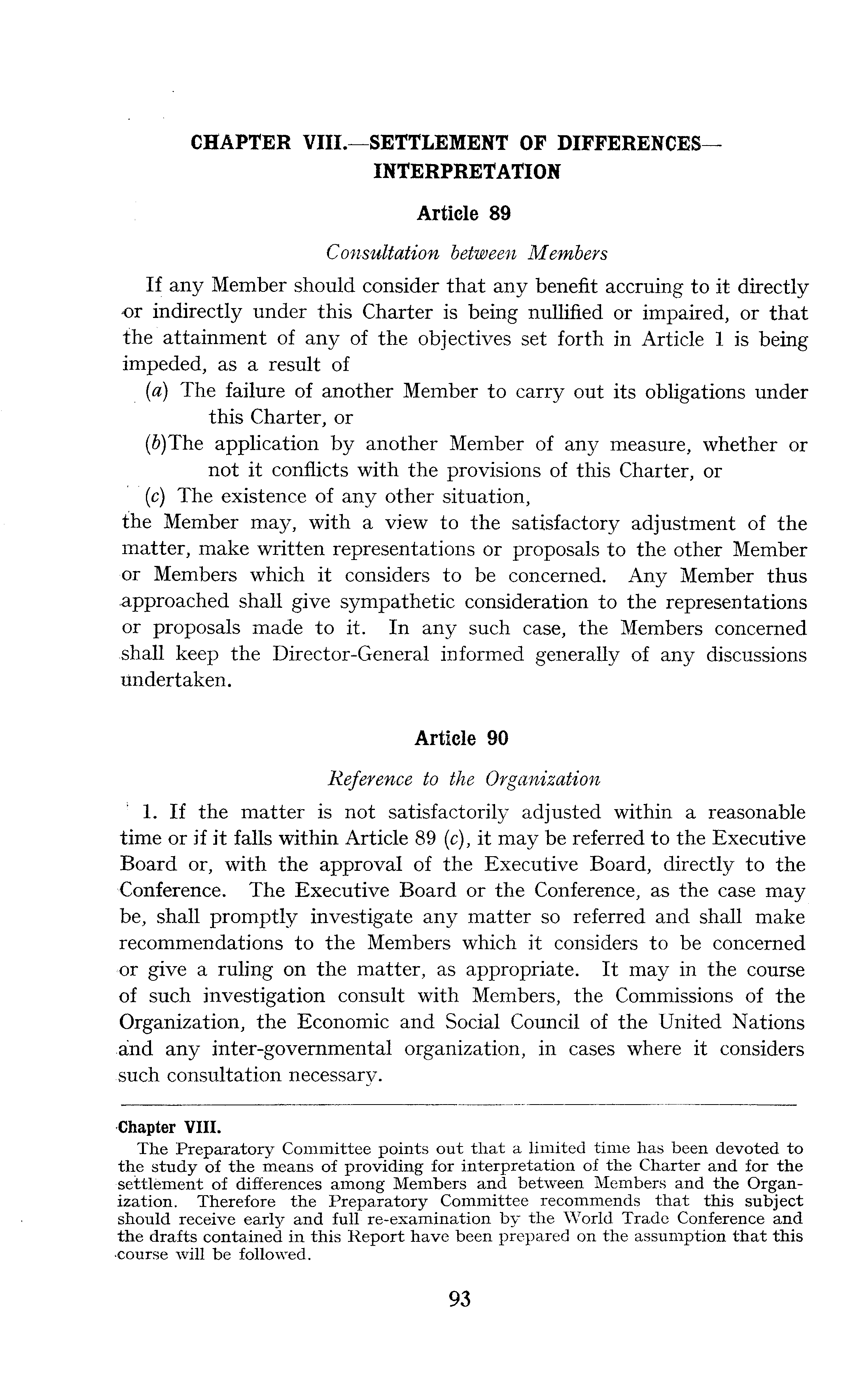 Chapter VIII. The Preparatory Committee points out that a limited time has been devoted to the study of the means of providing for interpretation of the Charter and for the settlement of differences among Members and between Members and the Organization. Therefore the Preparatory Committee recommends that this subject should receive early and full re-examination by the World Trade Conference and the drafts contained in this Report have been prepared on the assumption that this •course will be followed.
