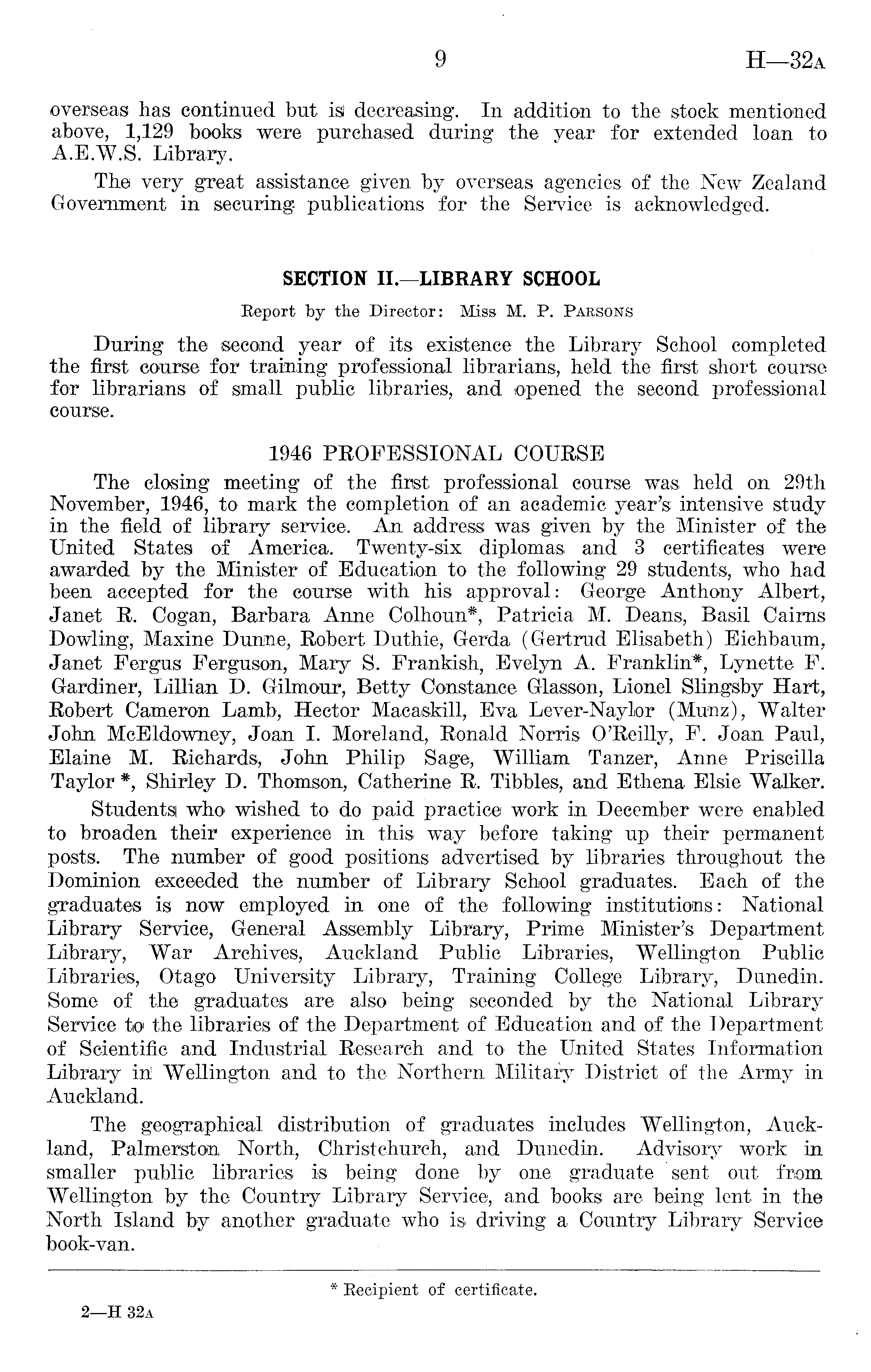 overseas has continued but isi decreasing. In addition to the stock mentioned above, 1,129 books were purchased during the year for extended loan to A.E.W.S. Library. The very great assistance given by overseas agencies of the New Zealand Government in securing- publications for the Service is acknowledged. SECTION lI.—LIBRARY SCHOOL Report by the Director: Miss M. P. Parsons During the second year of its existence the Library School completed the first course for training professional librarians, held the first short course for librarians of small public libraries, and opened the second professional course. 1946 PROFESSIONAL COURSE The closing meeting of the first professional course was held on 29th November, 1946, to mark the completion of an academic year's intensive study in the field of library service. An address was given by the Minister of the United States of America. Twenty-six diplomas and 3 certificates were awarded by the Minister of Education to the following 29 students, who had been accepted for the course with his approval: George Anthony Albert, Janet R. Cogan, Barbara Anne Colhoun*, Patricia M. Deans, Basil Cairns Dowling, Maxine Dunne, Robert Duthie, Gerda (Gertrud Elisabeth) Eichbaum, Janet Fergus Ferguson, Mary S. Frankish, Evelyn A. Franklin*, Lynette F. Gardiner, Lillian D. Gilmour, Betty Constance Glasson, Lionel Slingsby Hart, Robert Cameron Lamb, Hector Macaskill, Eva Lever-Naylor (Munz), Walter John McEldowney, Joan I. Moreland, Ronald Norris O'Reilly, F. Joan Paul, Elaine M. Richards, John Philip Sage, William Tanzer, Anne Priscilla Taylor *, Shirley D. Thomson, Catherine R. Tibbies, and Ethena Elsie Walker. Students who wished to do paid practice work in December were enabled to broaden their experience in this way before taking up their permanent posts. The number of good positions advertised by libraries throughout the Dominion exceeded the number of Library School graduates. Each of the graduates is now employed in one of the following institutions: National Library Service, General Assembly Library, Prime Minister's Department Library, War Archives, Auckland Public Libraries, Wellington Public Libraries, Otago University Library, Training College Library, Dunedin. Some of the graduates are also being seconded by the National Library Service to the libraries of the Department of Education and of the Department of Scientific and Industrial Research and to the United States Information Library in Wellington and to the Northern Military District of the Army in Auckland. The geographical distribution of graduates includes Wellington, Auckland, Palmerston North, Christchurch, and Dunedin. Advisory work in smaller public libraries is being done by one graduate sent out from Wellington by the Country Library Service, and books are being lent in the North Island by another graduate who is driving a Country Library Service book-van.