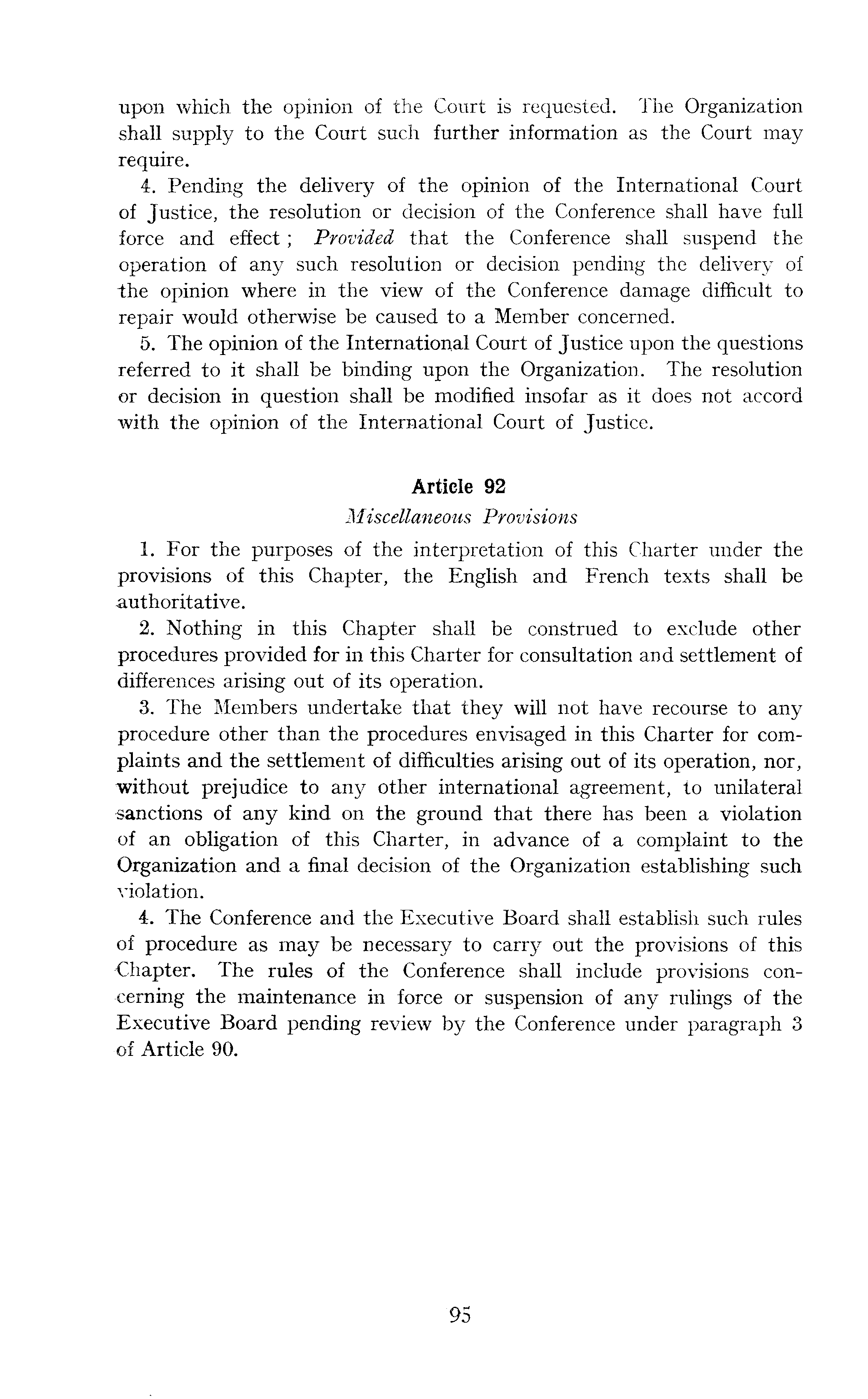 upon which the opinion of the Court is requested. The Organization shall supply to the Court such further information as the Court may require. 4. Pending the deliver of the opinion of the International Court of Justice, the resolution or decision of the Conference shall have full force and effect; Provided that the Conference shall suspend the operation of any such resolution or decision pending the delivery of the opinion where in the view of the Conference damage difficult to repair would otherwise be caused to a Member concerned. 5. The opinion of the International Court of Justice upon the questions referred to it shall be binding upon the Organization. The resolution or decision in question shall be modified insofar as it does not accord with the opinion of the International Court of Justice. Article 92 Miscellaneous Provisions 1. For the purposes of the interpretation of this Charter under the provisions of this Chapter, the English and French texts shall be authoritative. 2. Nothing in this Chapter shall be construed to exclude other procedures provided for in this Charter for consultation and settlement of differences arising out of its operation. 3. The Members undertake that they will not have recourse to any procedure other than the procedures envisaged in this Charter for complaints and the settlement of difficulties arising out of its operation, nor, without prejudice to any other international agreement, to unilateral -sanctions of any kind on the ground that there has been a violation •of an obligation of this Charter, in advance of a complaint to the Organization and a final decision of the Organization establishing such violation. 4. The Conference and the Executive Board shall establish such rules of procedure as may be necessary to carry out the provisions of this -Chapter. The rules of the Conference shall include provisions concerning the maintenance in force or suspension of any rulings of the Executive Board pending review by the Conference under paragraph 3 of Article 90.