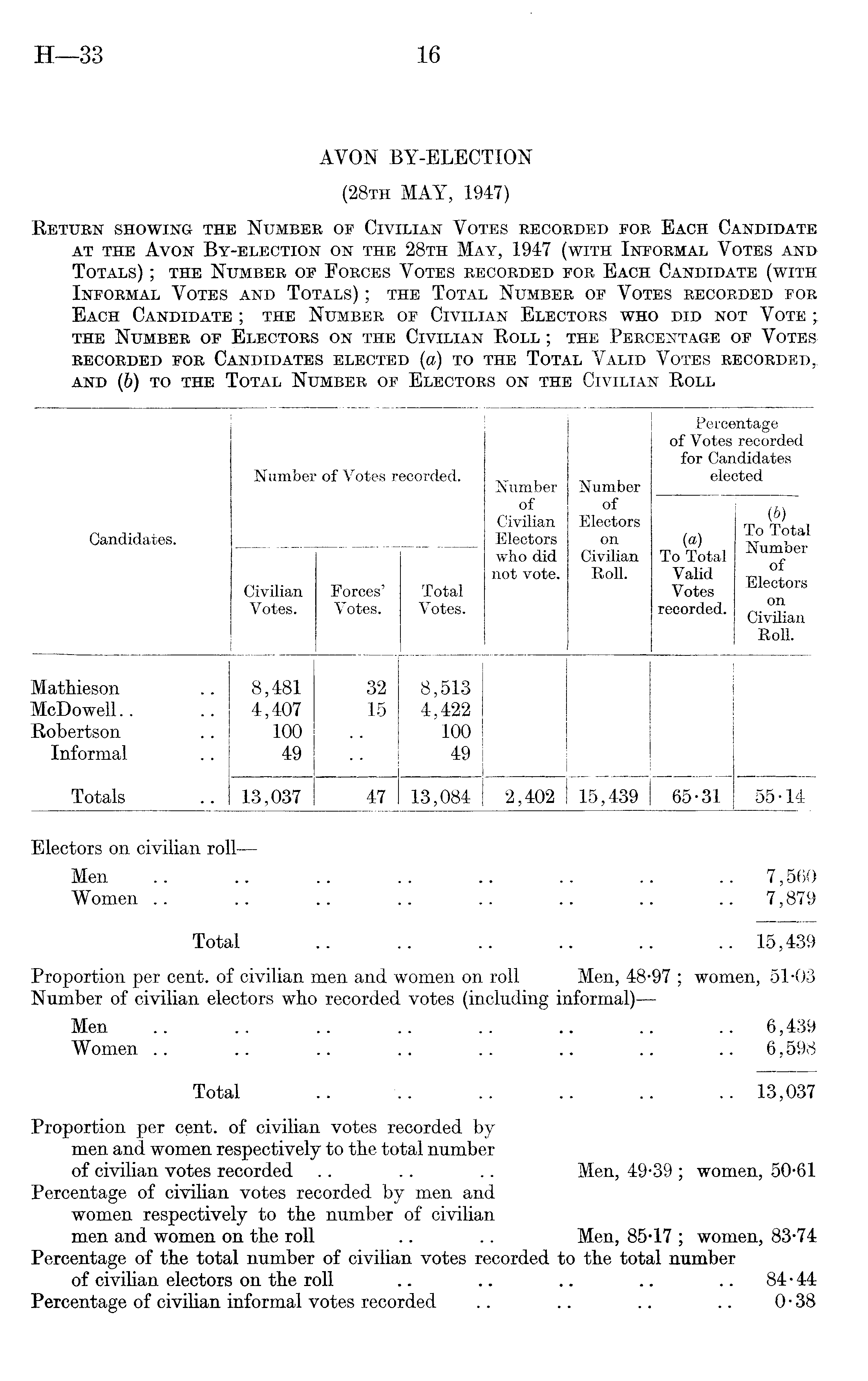 Return showing the Number of Civilian Votes recorded for Each Candidate at the Avon By-election on the 28th May, 1947 (with Informal Votes and Totals); the Number of Forces Votes recorded for Each Candidate (with Informal Votes and Totals); the Total Number of Votes recorded for Each Candidate; the Number of Civilian Electors who did not Vote; the Number of Electors on the Civilian Roll; the Percentage of Votes recorded for Candidates elected (a) to the Total Valid Votes recorded,, and (b) to the Total Number of Electors on the Civilian Roll