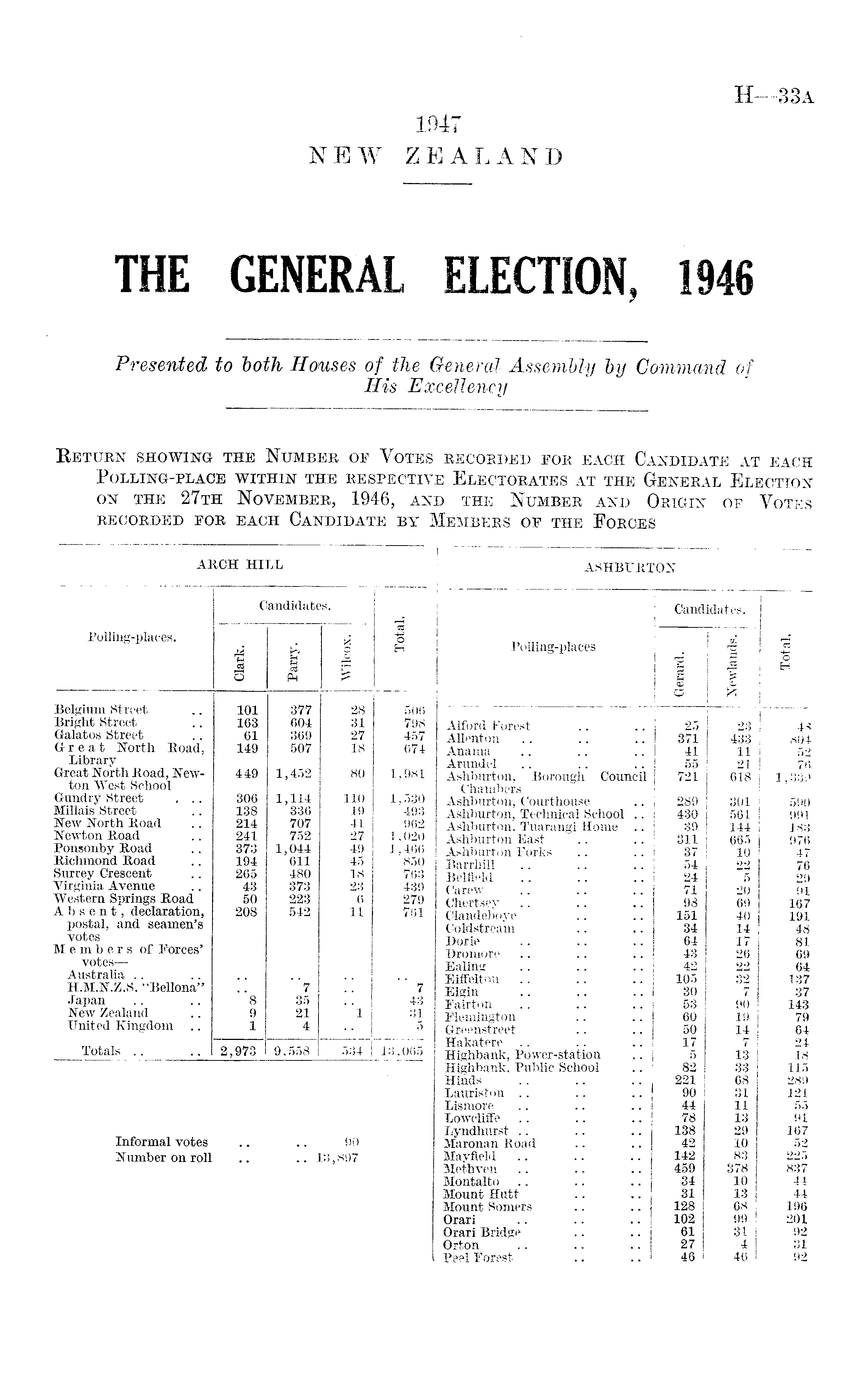 Return showing the Number of Votes recorded for each Candidate at each Polling-place within the respective Electorates at the General Election on the 27th November, 1946, and the Number and Origin of Votes recorded for each Candidate by Members of the Forces