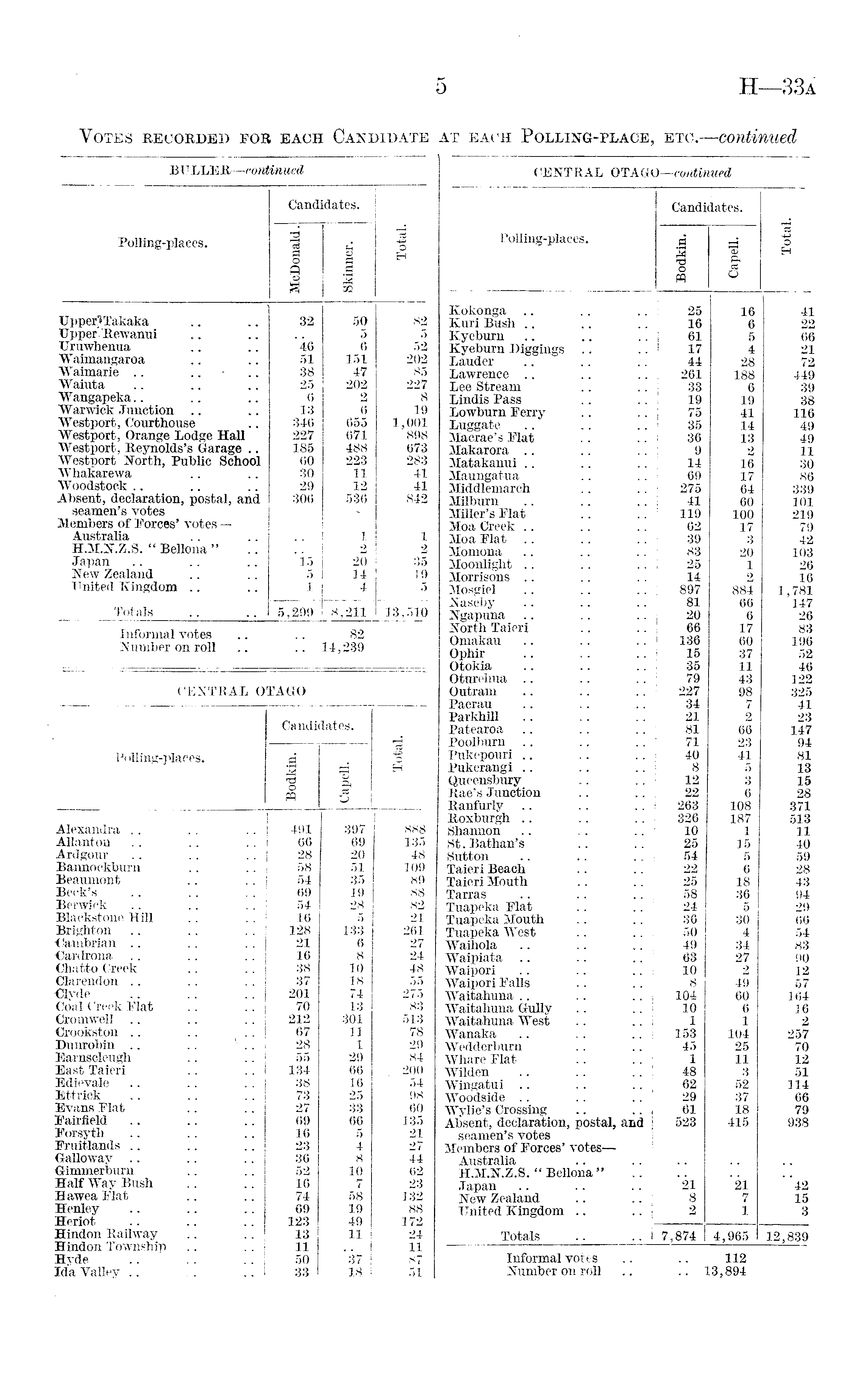 BULLER —continued Candidates. Polling-places. 2 o Q a § 3 CO J o H UppetfSTakaka Upper.Rewanui Uruwhenua Waimangaroa Waimarie .. Waiuta 32 '46 51 38 25 6 13 346 227 185 60 30 29 306 'is 5 1 50 5 6 151 47 202 82 5 52 202 85 227 Q Warwick Junction Westport, Courthouse "Westport, Orange Lodge Hall Westport, Reynolds's Garage .. Westport North, Public School Whakarewa Woodstock Absent, declaration, postal, and seamen's votes Members of Forces' votes— Australia H.M.N.Z.S. " Bellona " Japan New Zealand United Kingdom 6 655 671 488 223 11 12 536 1 2 20 14 4 <5 19 1,001 898 673 283 41 41 842 1 2 35 19 5 Totals 5,299 8,211 13,510 Informal votes Number on roll 82 14,239 CENTRAL OTAGO Candidates. Polling-places. sj S "g o 1 IH Alexandra Allanton Ardgour Bannockburn Beaumont Beck's Berwick Blackstone Hill Brighton Cambrian Cardrona Chatto Creek Clarendon Clyde Coal Creek Flat Cromwell Crookston Dunrobin .. .. v .. Earnscleugh East Taieri Edievale Ettrick Evans Flat Fairfield Forsyth Fruitlands Galloway Gimmerburn Half Way Bush Hawea Flat Henley Heriot Hindon Railway Hindon Township Hyde Ida Valley .. 491 66 28 58 54 69 54 16 128 21 16 38 37 201 70 212 67 28 55 134 38 73 27 69 16 23 36 52 16 74 69 123 13 11 50 33 397 69 20 51 35 19 28 5 133 6 8 10 18 74 13 301 11 1 29 66 16 25 33 66 5 4 8 10 7 58 19 49 11 *37 18 888 135 48 109 89 88 82 21 261 27 24 48 55 275 83 513 78 29 84 200 54 98 60 135 21 27 44 62 23 132 88 172 24 11 87 51