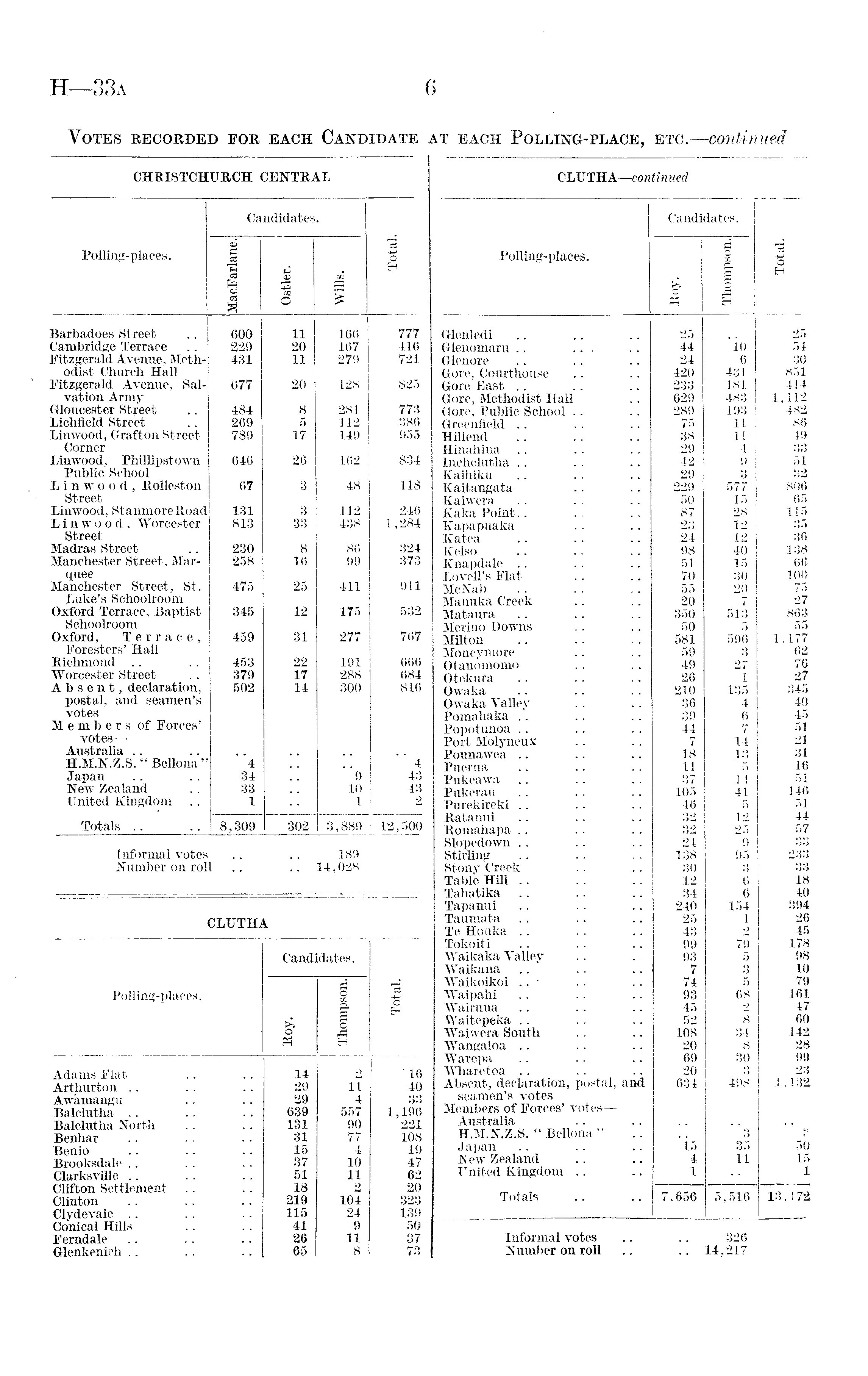 CHRISTCHURCH CENTRAL Candidates. Polling-places. 1 "3 0 1 05 03 H S3 I O fS Barbadoes Street 600 11 166 777 Cambridge Terrace 229 20 167 416 Fitzgerald Avenue, Meth431 11 279 721 odist Church Hall Fitzgerald Avenue, Sal677 20 128 825 vation Army Gloucester Street 484 8 281 773 Lichfield Street 269 5 112 386 Lin wood, Grafton Street 789 17 149 955 Corner Linwood, Phillipstown 646 26 162 834 Public School Linwood, Rolleston 67 3 48 118 Street Linwood, StanmoreRoad 131 3 112 246 Linwood, Worcester 818 33 438 1,284 Street Madras Street 230 8 86 324 Manchester Street, Mar258 16 99 373 qucc Manchester Street, St. 475 25 411 911 Luke's Schoolroom Oxford Terrace, Baptist 345 12 175 532 Schoolroom Oxford, Terrace, 459 31 277 767 Foresters' Hall Richmond 453 22 191 666 Worcester Street 379 17 288 684 Absent, declaration, 502 14 300 816 postal, and seamen's votes Members of Forces' votes — Australia .. H.M.N.Z.S." Bellona " "4 4 Japan 34 ' 9 43 New Zealand 33 10 43 United Kingdom .. 1 1 2 Totals 8,309 302 3,889 12,500 Informal votes 189 Number on roll 14,028 CLUTHA Candidates. Polling-places. ri 0 ft 0 & 1 6-1 P3 EH Adorns Flat 14 2 ' 16 Arthurton 29 11 40 Awamangu 29 4 33 Balclutha 639 557 1,196 Balclutha North 131 90 221 Benhar 31 77 108 Benio 15 4 19 Brooksdale 37 10 47 Clarksville 51 11 62 Clifton Settlement .. 18 2 20 Clinton 219 104 323 Clydevale 115 24 139 Conical Hills 41 9 50 Ferndale 26 11 37 Glenkenich 65 8 73