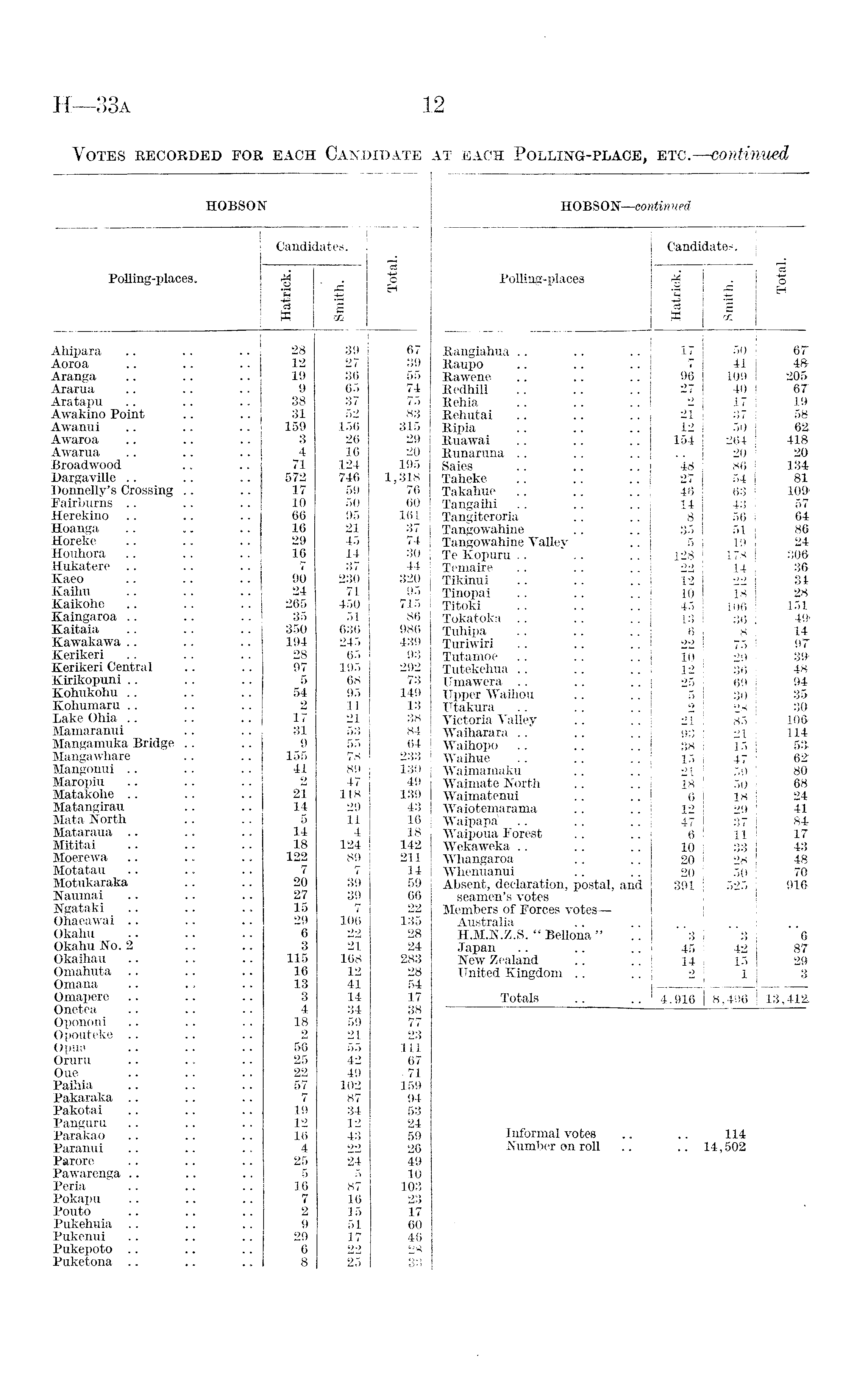 HOBSON PoEing-places. Candidates. Total. Hatrick. Smith. Ahipara 28 39 67 Aoroa 12 27 39 Aranga 19 36 55 Ararua 9 65 74 Aratapu 38 37 75 Awakino Point 31 52 83 Awanui 159 156 315 Awaroa 3 26 29 Awarua 4 16 20 Broadwood 71 124 195 Dargaville 572 746 1,318 Donnelly's Crossing .. 17 59 76 Fairburns 10 50 60 Herekino 66 95 161 Hoanga 16 21 37 Horeke 29 45 74 Houhora 16 14 30 Hnkatere .. 7 37 44 Kaeo 90 230 320 Kaihu 24 71 95 Kaikohe 265 450 715 Kaingaroa 35 51 86 Kaitaia 350 636 986 Kawakawa .. .. 194 245 439 Kerikeri 28 65 93 Kerikeri Central 97 195 292 Kirikopuni .. 5 68 73 Kohukohu 54 95 149 Kohumaru 2 11 13 Lake Ohia 17 21 38 Mamaranui 31 53 84 Mangamuka Bridge 9 55 64 Manga whare 155 78 233 Mangonui .. .. 41 89 130 Maropiu 2 47 49 Matakohe 21 118 139 Matangirau 14 29 43 Mata North 5 11 16 Mataraua 14 4 18 Mititai 18 124 142 Moerewa 122 89 211 Motatau 7 7 14 Motukaraka 20 39 59 Kaumai 27 39 66 ISTgataki 15 7 22 Ohaeawai 29 106 135 Okahu 6 22 28 Okahu No. 2 3 21 24 Okaihau 115 168 283 Omahuta 16 12 28 Omana . 13 41 54 Omapere 3 14 17 Onetea 4 34 38 Opononi 18 59 77 Opouteke 2 21 23 Opua 56 55 111 Oruru 25 42 67 Oue 22 49 • 71 Paihia 57 102 159 Pakaraka 7 87 94 Pakotai 19 34 53 Panguru 12 12 24 Parakao 16 43 59 Paranui 4 22 26 Parore 25 24 49 Pawarenga 5 5 10 Peria 16 87 103 Pokapu 7 16 23 Pouto 2 15 17 Pukehuia 9 51 60 Pukenui 29 17 46 Pukepoto 6 22 28 Puketona 8 25 33