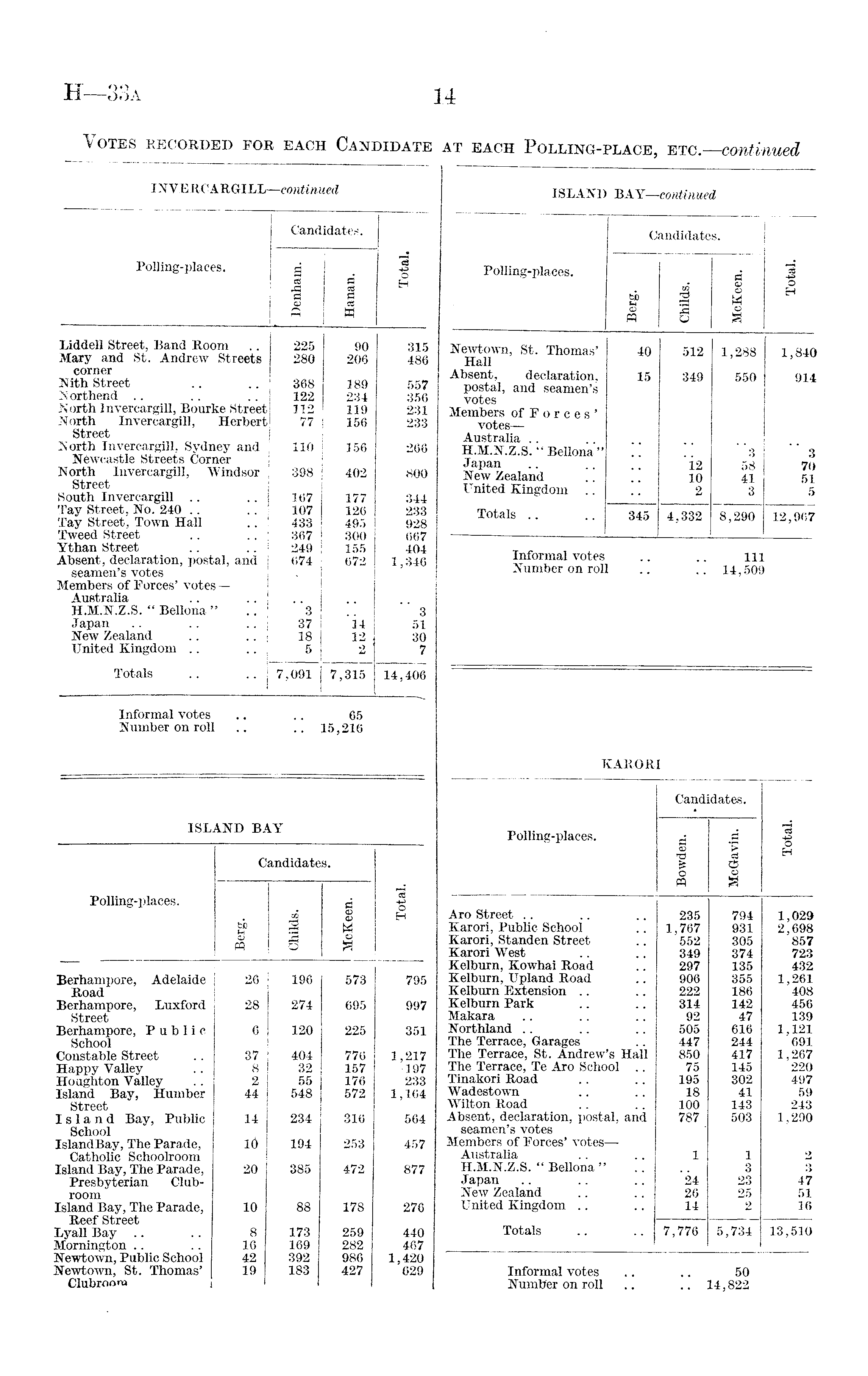 INVERCARGILL—continued Candidates. Polling-places. a cS a o £ B fi c6 w Liddell Street, Band Room Mary and St. Andrew Streets corner Nith Street Northend North Invercargill, Bourke Street North Invercargill, Herbert Street North Invercargill, Sydney and Newcastle Streets Corner North Invercargill, Windsor Street South Invercargill Tay Street, No. 240 Tay Street, Town Hall Tweed Street Ythan Street Absent, declaration, postal, and seamen's votes Members of Forces' votes— Australia H.M.N.Z.S. " Bellona " Japan New Zealand United Kingdom 225 280 368 122 112 77 90 206 189 234 119 156 315 486 557 356 231 233 110 398 156 402 266 800 167 107 433 367 249 674 ' 3 37 18 5 177 126 495 300 155 672 i4 12 2 344 233 928 667 404 1,346 3 51 30 7 Totals 7,091 7,315 14,406 Informal votes Number on roll 65 15,216 ISLAND BAY Candidates. Polling-places. to (h <D ffl 2 2 o i i a "3 H Berhampore, Adelaide Road Berhampore, Luxford Street Berhampore, Public School Constable Street Happy Valley Houghton Valley Island Bay, Humber Street Island Bay, Public School IslandBay, The Parade, Catholic Schoolroom Island Bay, The Parade, Presbyterian Clubroom Island Bay, The Parade, Reef Street Lyall Bay Mornington Newtown, Public School Newtown, St. Thomas' Clubroona 1 26 196 573 795 28 6 37 8 2 44 14 id 20 10 8 16 42 19 274 120 404 32 55 548 234 194 385 88 173 169 392 183 695 225 776 157 176 572 316 253 472 178 259 282 986 427 997 351 1,217 197 233 1,164 564 457 877 276 440 467 1,420 629