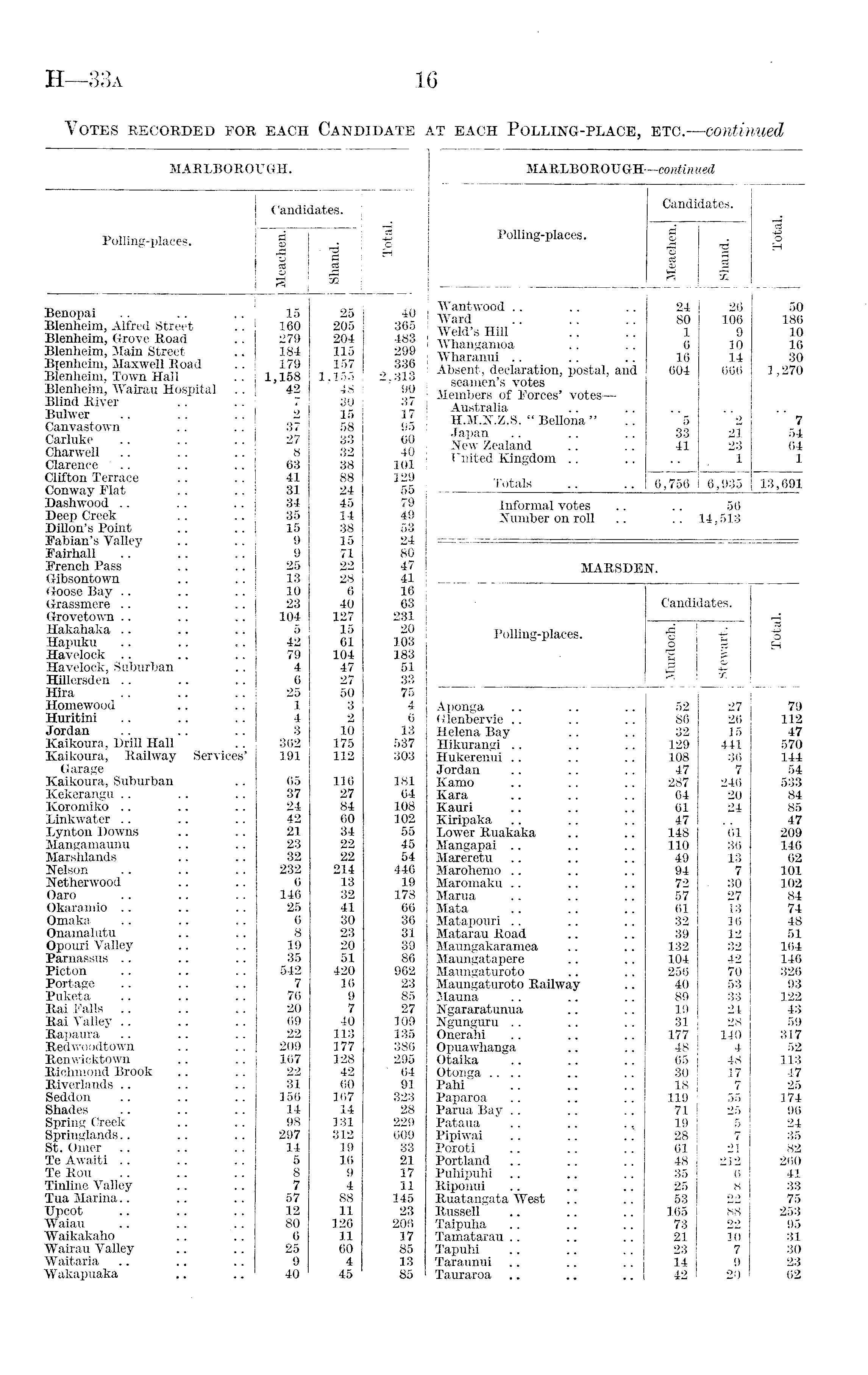 MARLBOROUGH. Candidates. Polling-places. a "3 o 1 § Shand H Benopai 15 25 40 •• Blenheim, Alfred Street 160 205 365 Blenheim, Grove Road 279 204 483 Blenheim, Main Street 184 115 299 Blenheim, Maxwell Road 179 157 336 Blenheim, Town Hall 1,158 1,155 2,313 Blenheim, Wairau Hospital .. 42 48 90 Blind River 7 30 37 Bulwer 2 15 17 Canvastown 37 58 95 Carluke 27 33 60 Charwell 8 32 40 | Clarence 63 38 101 Clifton Terrace 41 88 129 | Conway Flat 31 24 55 Dashwood 34 45 79 Deep Creek 35 14 49 Dillon's Point 15 38 53 Fabian's Valley 9 15 24 Fairhall 9 71 80 French Pass 25 22 47 Gibsontown 13 28 41 Goose Bay 10 6 16 Grassmere 23 40 63 Grovetown 104 127 231 Hakahaka 5 15 20 Hapuku 42 61 103 Havelock 79 104 183 Havelock, Suburban 4 47 51 Hillersden 6 27 33 Hira 25 50 75 Homewood 1 3 4 Huritini 4 2 6 Jordan 3 10 13 Kaikoura, Drill Hall 362 175 537 Kaikoura, Railway Services' 191 112 303 Garage Kaikoura, Suburban Kekerangu 65 116 181 37 27 64 Koromiko 24 84 108 linkwater 42 60 102 Lynton Downs 21 34 55 Mangamaunu 23 22 45 Marshlands 32 22 54 Nelson 232 214 446 Netherwood 6 13 19 Oaro 146 32 178 Okarainio 25 41 66 Omaka 6 30 36 Onamalutu 8 23 31 Opouri Valley 19 20 39 Parnassus 35 51 86 Picton 542 420 962 Portage 7 16 23 Puketa 76 9 85 Rai Falls 20 7 27 Rai Valley Rapaura 69 40 109 22 113 135 Redwoodtown 209 177 386 Renwicktown 167 128 295 Richmond Brook 22 42 ' 64 Riverlands 31 60 91 Seddon 156 167 323 Shades 14 14 28 Spring Creek 98 131 229 Springlands.. 297 312 609 St. Omer 14 19 33 Te Awaiti 5 16 21 Te Rou 8 9 17 Tinline Valley 7 4 11 Tua Marina 57 88 145 Upcot 12 11 23 Waiau 80 126 206 Waikakaho 6 11 17 "Wairau Valley 25 60 85 Waitaria 9 4 13 Wakapuaka 40 45 85