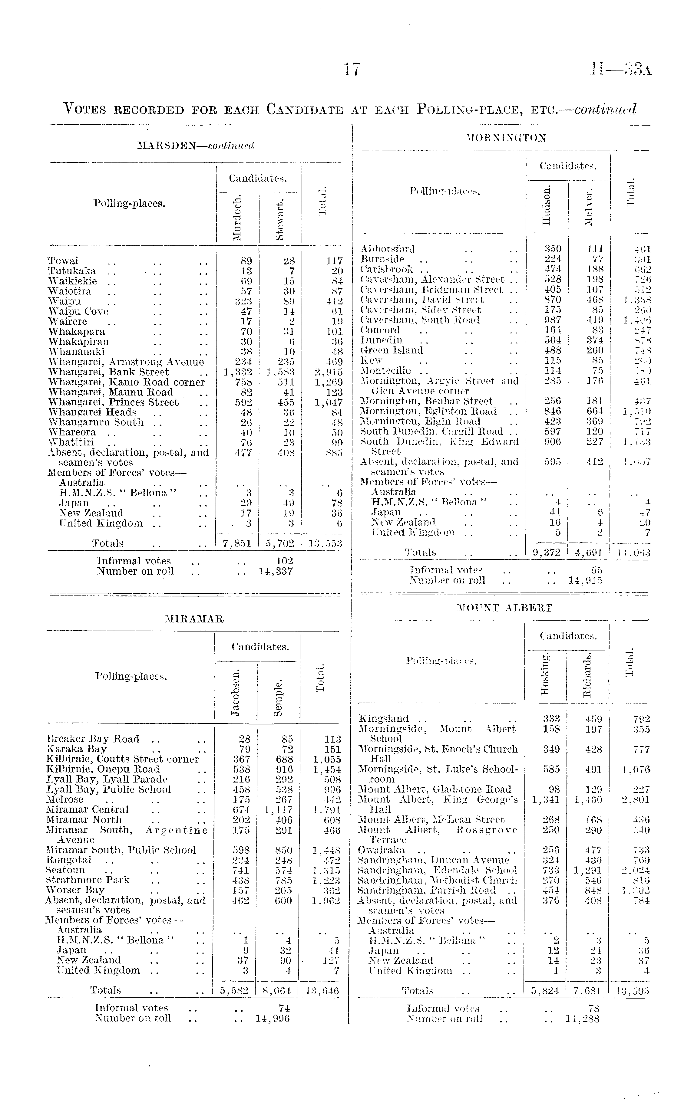 MORNINGTON Candidates. Polling-places. a P 3 H CD > 1 0 H Abbotsford Burnside Carisbrook .. Caversham, Alexander Street .. Caversham, Bridgman Street .. Caversham, David Street Caversham, Sidey Street Caversham, South Road Concord Dunedin Green Island Kew Montecillo Mornington, Argyle Street and Glen Avenue corner Mornington, Benhar Street Mornington, Eglinton Road .. Mornington, Elgin Road South Dunedin, Cargill Road .. South Dunedin, King Edward Street Absent, declaration, postal, and seamen's votes Members of Forces' votes — Australia H.M.N.Z.S. " Bellona " Japan New Zealand United Kingdom 350 224 474 528 405 870 175 987 164 504 488 115 114 285 256 846 423 597 906 595 ' 4 41 16 5 111 77 188 198 107 468 85 419 83 374 260 85 75 176 181 664 369 120 227 412 ' 6 4 2 461 301 662 726 512 1,338 260 1,406 247 878 748 200 189 461 437 1,510 792 717 1,133 1,007 4 47 20 7 Totals 9,372 4,691 14,063 Informal votes Number on roll 14 55 ,915 MOUNT ALBERT Candidates. Polling-places. 60 g 3 0 H ■3 C3 .g PH ~3 Kingsland Morningside, Mount Albert School Morningside, St. Enoch's Church Hall Morningside, St. Luke's Schoolroom Mount Albert, Gladstone Road Mount Albert, King George's Hall Mount Albert, McLean Street Mount Albert, Rossgrove Terrace Owairaka Sandringham, Duncan Avenue Sandringham, Edendale School Sandringham, Methodist Church Sandringham, Parrish Road .. Absent, declaration, postal, and seamen's votes Members of Forces' votes— Australia H.M.N.Z.S. " Bellona " Japan New Zealand United Kingdom 333 158 459 197 792 355 349 428 777 585 98 1,341 1 491 129 ,460 1,076 227 2,801 268 250 256 324 733 270 454 376 "2 12 14 1 1 168 290 477 436 ,291 546 848 408 "3 24 23 3 436 540 733 760 2,024 816 1,302 • 784 5 36 37 4 Totals 5,824 7 ,681 13,505 Informal votes Number on roll !! 14, 78 288