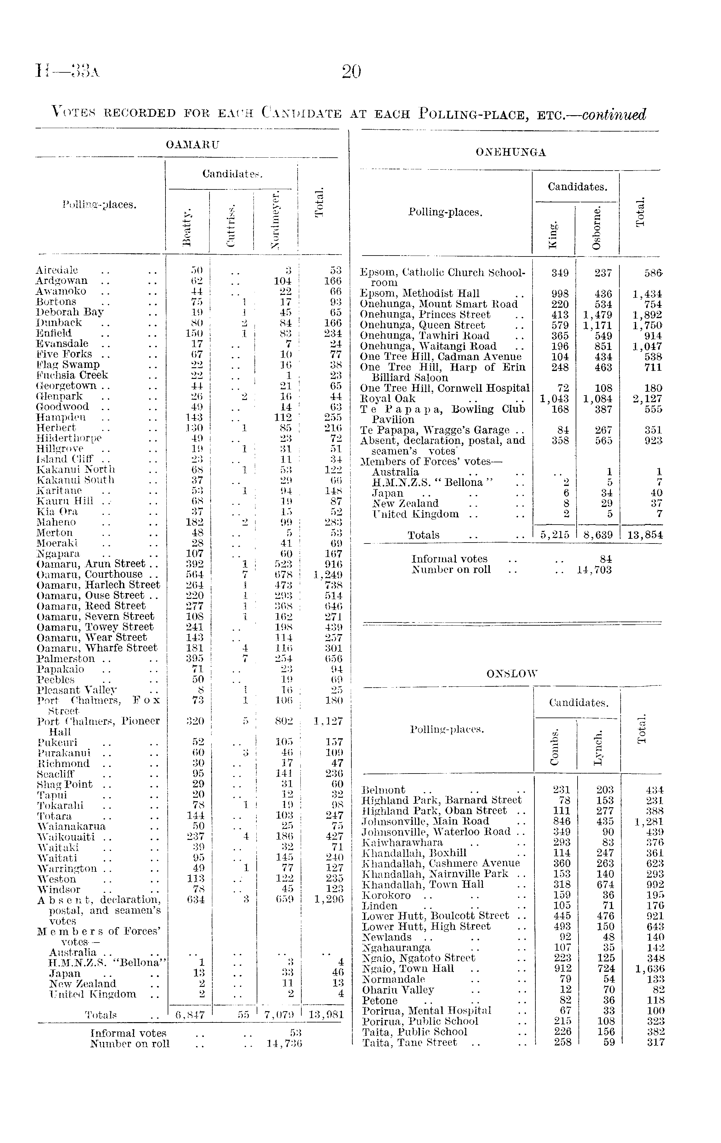 ONEHUNGA Candidates. Polling-places. S "3 0 ti c 0 XI H 3 O Epsom, Catholic Church School349 237 586 room Epsom, Methodist Hall 998 436 1,434 Onehunga, Mount Smart Road 220 534 754 Onehunga, Princes Street 413 1,479 1,892 Onehunga, Queen Street 579 1,171 1,750 Onehunga, Tawhiri Road 365 549 914 Onehunga, Waitangi Road 196 851 1,047 One Tree Hill, Cadman Avenue 104 434 538 One Tree Hill, Harp of Erin 248 463 711 Billiard Saloon One Tfee Hill, Cornwell Hospital 72 108 180 Royal Oak 1,043 1,084 2,127 Te Papapa, Bowling Club 168 387 555 Pavilion Te Papapa, Wragge's Garage .. 84 267 351 Absent, declaration, postal, and 358 565 923 seamen's votes' Members of Forces' votes — Australia 1 1 H.M.N.Z.S." Bellona " "2 5 7 Japan 6 34 40 New Zealand 8 29 37 United Kingdom 2 5 7 Totals 5,215 8,639 13,854 Informal votes 84 Number on roll 14,703 ONSLOW Candidates. Polling-places. 1 0 2 § H 0 0 $ Belmont 231 203 434 Highland Park, Barnard Street 78 153 231 Highland Park, Oban Street .. 111 277 388 Johnsonville, Main Road 846 435 1,281 Johnsonville, Waterloo Road .. 349 90 439 Kaiwharawhara 293 83 376 Khandallah, Boxhill 114 247 361 Khandallah, Cashmere Avenue 360 263 623 Khandallah, Nairnville Park .. 153 140 293 Khandallah, Town Hall 318 674 992 Korokoro 159 36 195 Linden 105 71 176 Lower Hutt, Boulcott Street .. 445 476 921 Lower Hutt, High Street 493 150 643 Newlands 92 48 140 Ngahauranga 107 35 142 Ngaio, Ngatoto Street 223 125 348 Ngaio, Town Hall 912 724 1,636 Normandale 79 54 133 Ohariu Valley 12 70 82 Petone .. .. 82 36 118 Porirua, Mental Hospital 67 33 100 Porirua, Public School 215 108 323 Taita, Public School 226 156 382 1 Taita, Tane Street 258 59 317