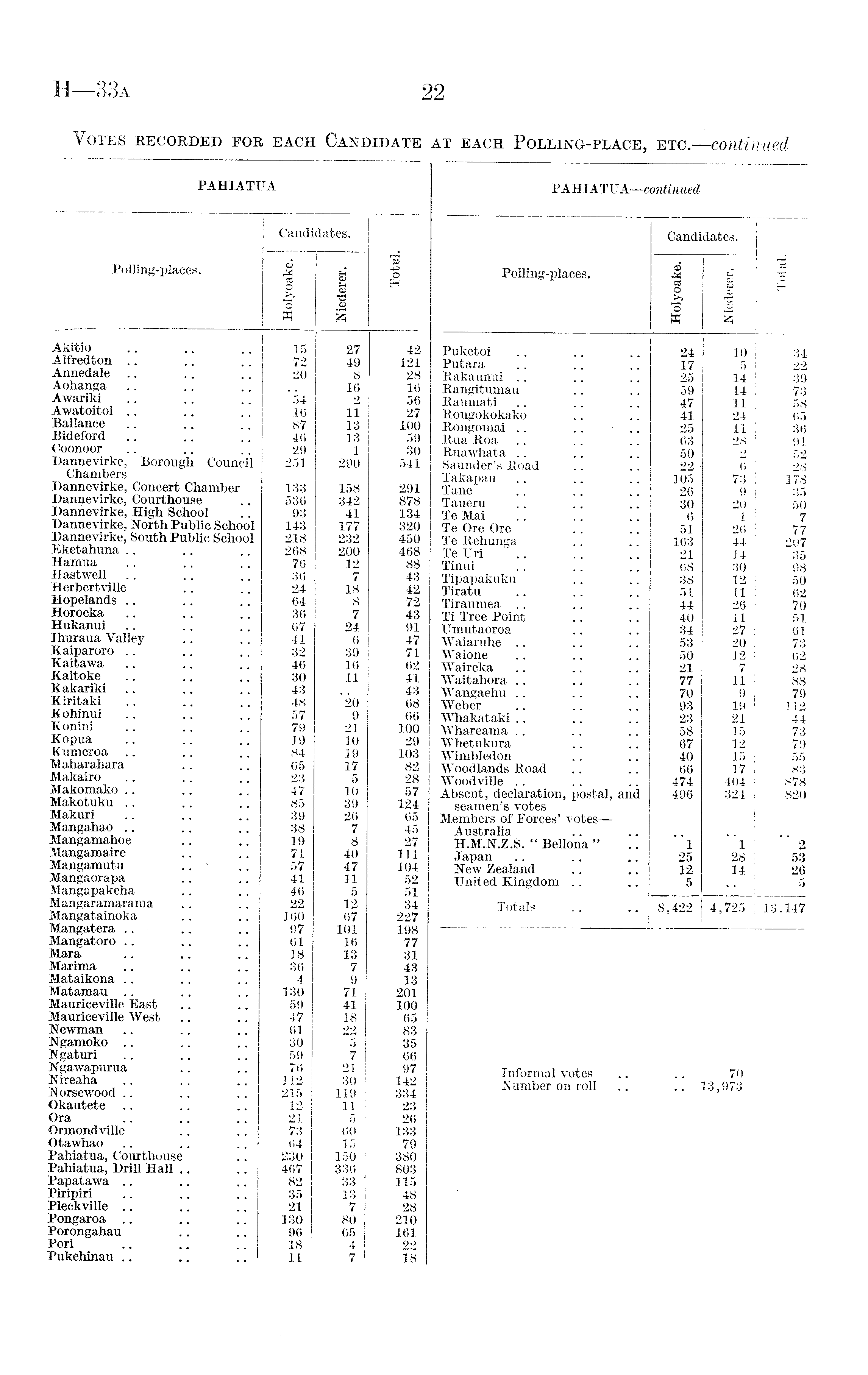 PAHIATUA Polling-places. Candidates. H o H Holyoake. Niederer. Akitio 15 27 42 Alfredton 72 49 121 Annedale 20 8 28 Aohanga 16 16 Awariki 54 2 56 Awatoitoi 16 11 27 Ballance 87 13 100 Bideford 46 13 59 Coonoor 29 1 30 Dannevirke, Borough Council 251 290 541 Chambers Dannevirke, Concert Chamber 133 158 291 Dannevirke, Courthouse 536 342 878 Dannevirke, High School 93 41 134 Dannevirke, North Public School 143 177 320 Dannevirke, South Public School 218 232 450 468 Eketahuna 268 200 Hamua 76 12 88 Hastwell 36 7 43 Herbert ville 24 18 42 Hopelands 64 8 72 Horoeka 36 7 43 Hukanui 67 24 91 Jhuraua Valley 41 6 47 Kaiparoro 32 39 71 Kaitawa 46 16 62 Kaitoke 30 11 41 Kakariki 43 43 Kiritaki 48 20 68 Kohinui 57 9 66 Konini 79 21 100 Kopua 19 10 29 Kumeroa 84 19 103 Maharahara 65 17 82 Makairo 23 5 28 Makomako 47 10 57 Makotuku 85 39 124 Makuri 39 26 65 Mangahao 38 7 45 Mangamahoe 19 8 27 Mangamaire 71 40 111 Mangamutu .. - 57 47 1.04 Mangaorapa 41 11 52 Mangapakeha 46 5 51 Mangaramarama 22 12 34 Mangatainoka 160 67 227 Mangatera .. • 97 101 198 Mangatoro 61 16 77 Mara 18 13 31 Marima 36 7 43 Mataikona 4 9 13 Matamau .. 130 71 201 Mauriceville East 59 41 100 Mauriceville West 47 18 65 Newman 61 22 83 Ngamoko .. 30 5 35 Ngaturi 59 7 66 Ngawapurua 76 21 97 Nireaha .. 112 30 142 Norsewood 215119 334 Okautete 12 11 23 Ora 21 5 26 Ormondville 73 60 133 Otawhao 64 15 79 Pahiatua, Courthouse 230 150 380 Pahiatua, Drill Hall 467 336 803 Papatawa 82 33 115 Piripiri 35 13 48 Pleckville 21 7 28. Pongaroa 130 80 210 Porongahau 96 65 161 Pori 18 4 22 Pukehinau .. .. .. ' • 11 7 18