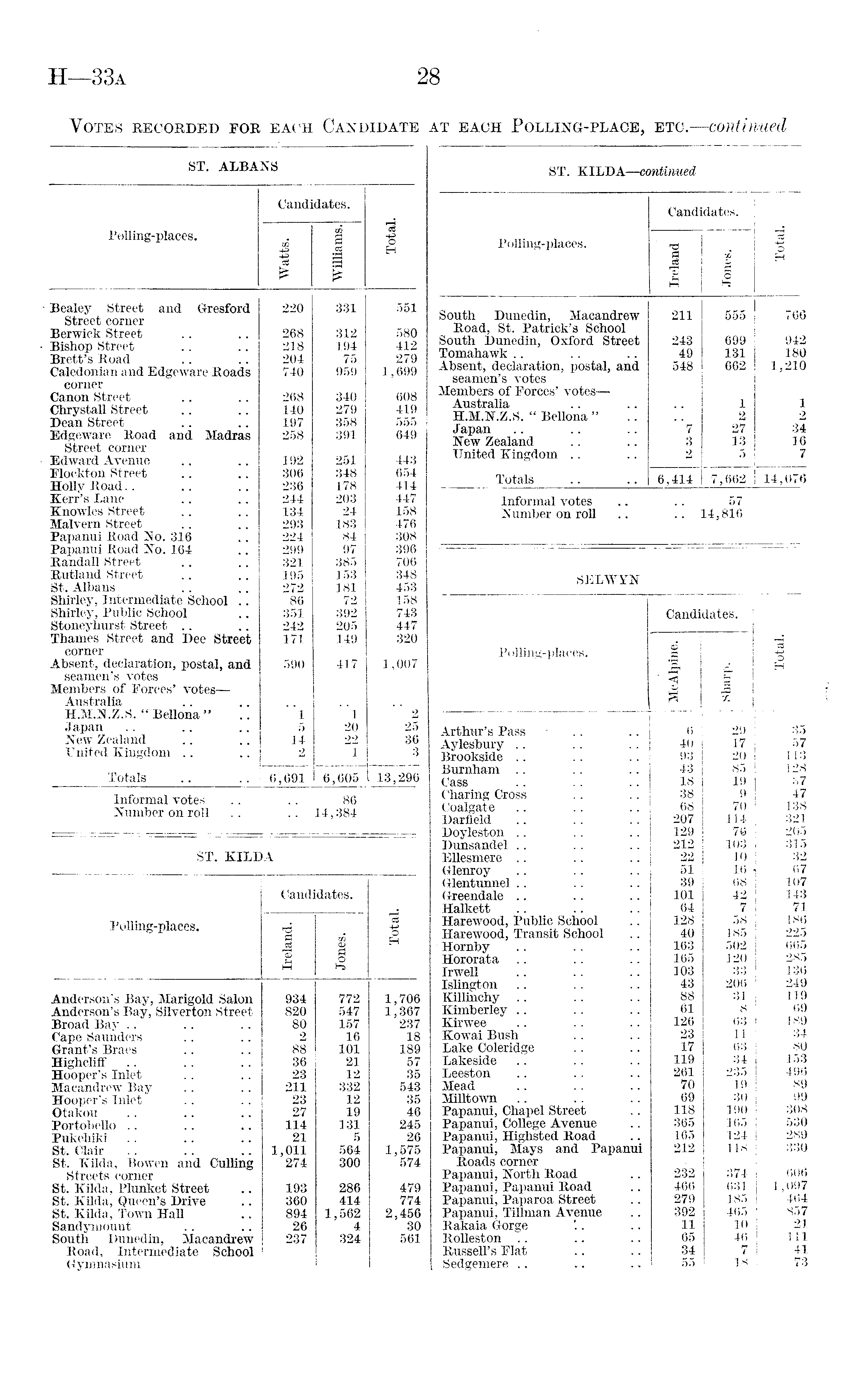 ST. ALBANS Candidates. Polling-places. £ 1 g % "3 -§ H £ -* Bealey Street and Gresford Street corner — Berwick Street —"Bishop Street Brett's Road Caledonian and Edgeware Roads corner Canon Street Chrystall Street Dean Street Edgeware Road and Madras Street corner ■ Edward Avenue Elockton Street Holly Road.. Kerr's Lane Knowles Street Malvern Street Papanui Road No. 316 Papanui Road No. 164 Randall Street Rutland Street St. Albans .. Shirley, Intermediate School .. Shirley, Public School Stoneyhnrst Street Thames Street and Dee Street corner Absent, declaration, postal, and seamen's votes Members of Forces' votes— Australia H.M.N.Z.S. " Bellona " Japan New Zealand United Kingdom 220 268 218 204 740 268 140 197 258 192 306 236 244 134 293 224 299 321 195 272 86 351 242 171 590 ' 1 5 14 2 331 312 194 75 959 340 279 358 391 251 348 178 203 24 183 84 97 385 153 181 72 392 205 149 417 ' 1 20 22 1 551 580 412 279 1,699 608 419 555 649 443 654 414 447 158 476 308 396 706 348 453 158 743 447 320 1,007 2 25 36 3 Totals 6,691 6,605 13,296 Informal votes Number on roll 86 14,384 ST. KILDA Candidates. Polling-places. % CZ2 "cS i "3 M § o Hs tn Anderson's Bay, Marigold Salon Anderson's Bay, Silverton Street Broad Bay Cape Saunders Grant's Braes Highcliff Hooper's Inlet Macandrew Bay Hooper's Inlet Otakou Portobello Pukehiki St. Clair St. Kilda, Bowen and Culling Streets corner St. Kilda, Plunket Street St. Kilda, Queen's Drive St. Kilda, Town Hall Sandymount South Dunedin, Macandrew Road, Intermediate School Gymnasium 934 820 80 2 88 36 23 211 23 27 114 21 1,011 274 193 360 894 26 237 772 547 157 16 101 21 12 332 12 19 131 5 564 300 286 414 1,562 4 324 1,706 1,367 237 18 189 57 35 543 35 46 245 26 1,575 574 479 774 2,456 30 561