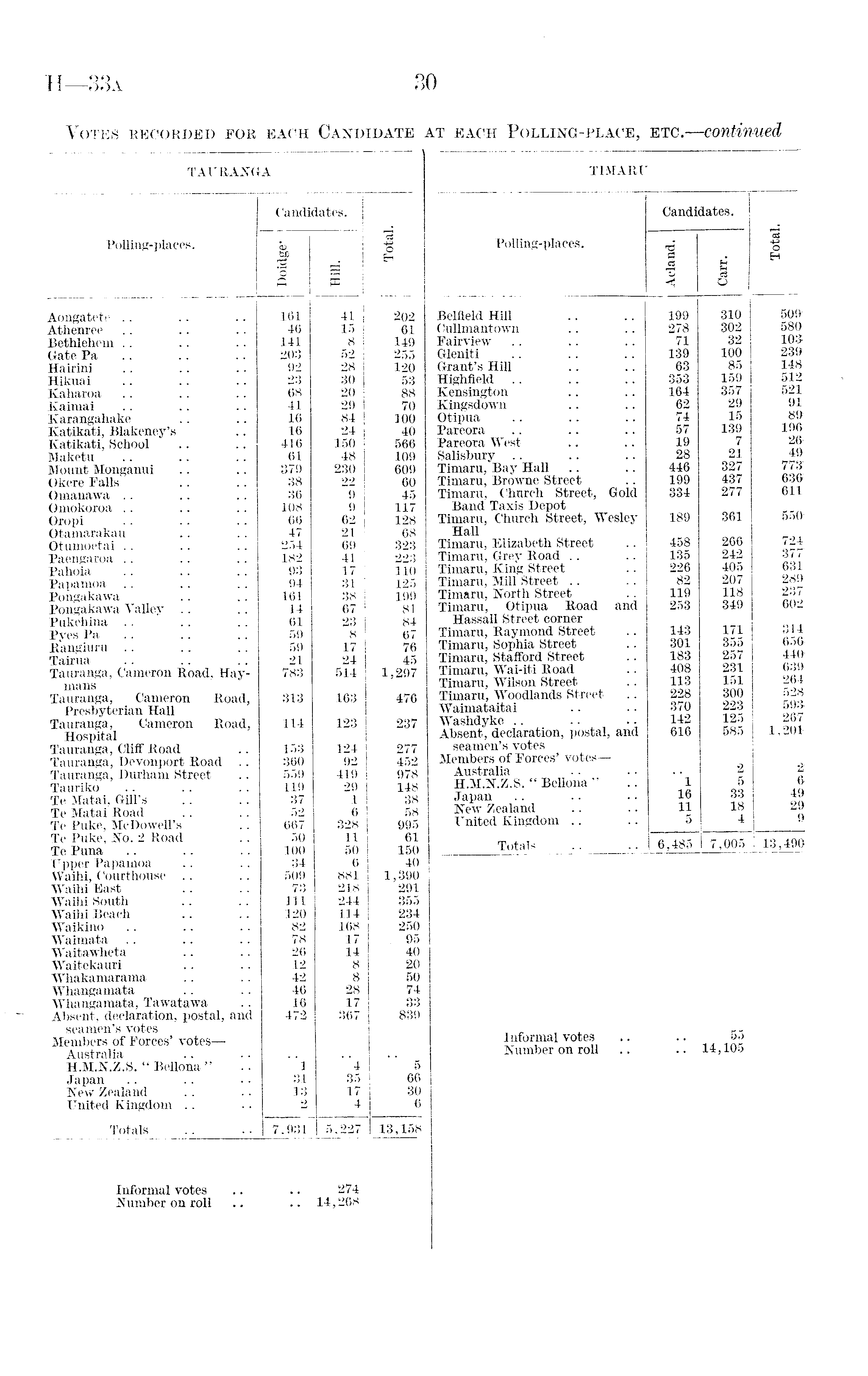 TIMARU Candidates. Polling-places. T3 3 o fl H o C3 «! O Belfleld Hill 199 310 509 Cullmantown 278 302 580' Fair view 71 32 10$ Gleniti 139 100 239 Grant's Hill 63 85 148 Highfleld 353 159 512 Kensington 164 357 521 Kingstown 62 29 91 Otipua 74 15 89 196 Pareora 57 139 Pareora West 19 7 26Salisbury 28 21 49 Timaru, Bay Hall 446 327 773' Timaru, Browne Street 199 437 636 Timaru, Church Street, Gold 334 277 611 Band Taxis Depot 550 Timaru, Church Street, Wesley 189 361 Hall Timaru, Elizabeth Street 458 266 724 Timaru, Grey Road 135 242 377 Timaru, King Street 226 405 631 Timaru, Mill Street 82 207 289 Timaru, North Street 119 118 237 Timaru, Otipua Road and 253 349 602 Hassall Street corner 314 Timaru, Raymond Street 143 171 Timaru, Sophia Street 301 355 656Timaru, Stafford Street 183 257 440 Timaru, Wai-iti Road 408 231 639 Timaru, Wilson Street 113 151 264 Timaru, Woodlands Street 228 300 528 Waimataitai 370 223 59$ Washdyke 142 125 267 Absent, declaration, postal, and 616 585 1,201 seamen's votes Members of Forces' votes — Australia 2 2 H.M.N.Z.S. " Bellona " ' 1 5 6> 49 Japan 16 33 New Zealand 11 18 29 United Kingdom 5 4 9 Totals 6,485 7,005 1 13,490 Informal votes 55 Number on roll 14,105