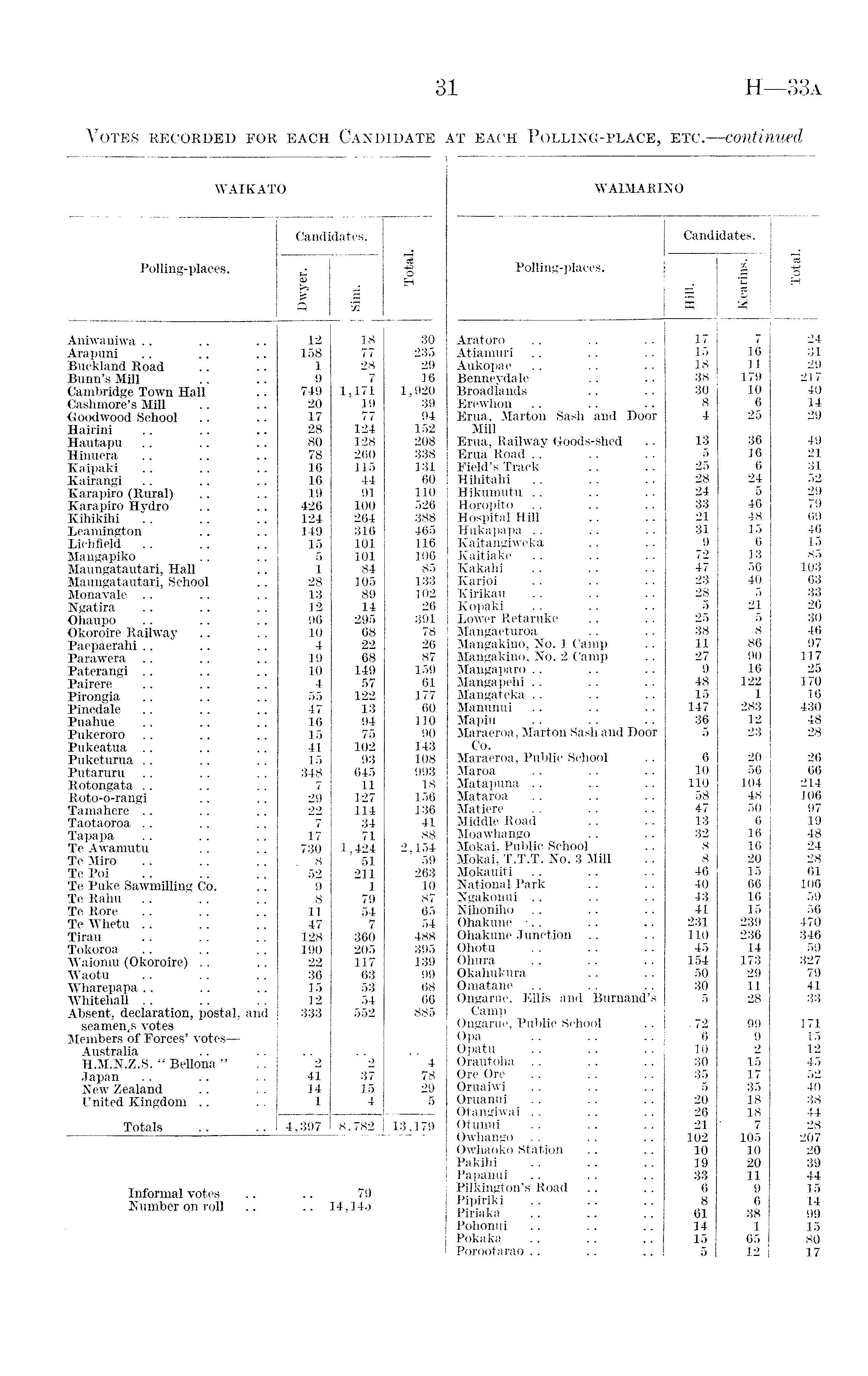 WAIKATO Candidates. Polling-places. b P S3 3" EH Aniwaniwa Arapuni Buckland Road Bunn's Mill Cambridge Town Hall ■Cashmore's Mill Goodwood School Hairini Hautapu Hinuera Kaipaki Kairangi Karapiro (Rural) Karapiro Hydro Kihikihi Leamington Lichfield Mangapiko Maungatautari, Hall Maungatautari, School Monavale Ngatira Ohaupo Okoroire Railway Paepaerahi Parawera Paterangi Pairere Pirongia Pinedale Puahue Pukeroro Pukeatua Puketurua Putaruru Rotongata Roto-o-rangi Tamahere Taotaoroa Tapapa Te Awamutu Te Miro Te Poi Te Puke Sawmilling Co. Te Rahu Te Rore Te Whetu Tirau Tokoroa Waiomu (Okoroire) Waotu .. Wharepapa Whitehall .. Absent, declaration, postal, and seamen.s votes Members of Forces' votes— Australia H.M.N.Z.S. " Bellona " Japan New Zealand United Kingdom 12 158 1 9 749 20 17 28 80 78 16 16 19 426 124 149 15 5 1 28 13 12 96 10 4 19 10 4 55 47 16 15 41 15 348 7 29 22 7 17 730 . 8 52 9 8 11 47 128 190 22 36 15 12 333 2 41 14 1 1 1 18 77 28 7 ,171 19 77 124 128 260 115 44 91 100 264 316 101 101 84 105 89 14 295 68 22 68 149 57 122 13 94 75 102 93 645 11 127 114 34 71 ,424 51 211 1 79 54 7 360 205 117 63 53 54 552 ' 2 37 15 4 30 235 29 16 1,920 39 94 152 208 338 131 60 110 526 388 465 116 106 85 133 102 26 391 78 26 87 159 61 177 60 110 90 143 108 993 18 156 136 41 88 2,154 59 263 10 87 65 54 488 395 139 99 68 66 885 4 78 29 5 Totals 4,397 8. ,782 13,179 Informal votes Number on roll ! 14, 79 145