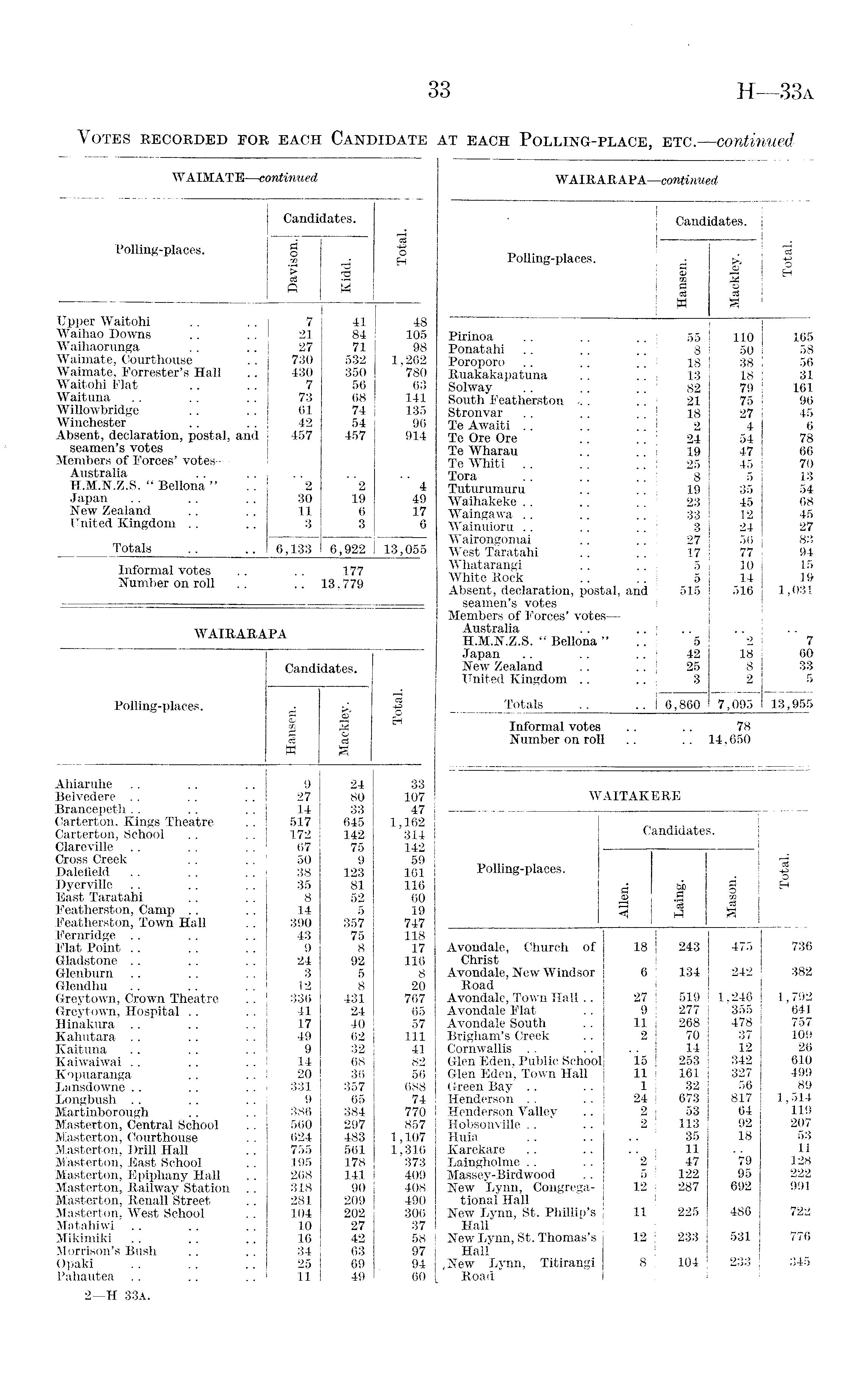 WAIRARAPA--continued Candidates. Polling-places. "3 0 <0 § 3 Eh 03 08 W a Pirinoa 55 no 165 Ponatahi 8 50 58 Poroporo 18 38 56 Ruakakapatuna 13 18 31 Solway 82 79 161 South Featherston ... 21 75 96 Stronvar 18 27 45 Te Awaiti 2 4 6 Te Ore Ore 24 54 78 Te Wharau 19 47 66 Te Whiti 25 45 70 Tora 8 5 13 Tuturumuru 19 35 54 Waihakeke 23 45 68 Waingawa 33 12 45 Wainuioru 3 24 27 Wairongomai 27 56 83 West Taratahi 17 77 94 Whatarangi 5 10 15 White Rock 5 14 19 Absent, declaration, pos .al, and 515 516 1,031 seamen's votes Members of Forces' votes — Australia H.M.N.Z.S. " Bellona " "5 2 7 Japan 42 18 60 New Zealand 25 8 33 United Kingdom .. 3 2 5 Totals 6,860 7,095 13,955 Informal votes 78 Number on roll 14,650 WAITAKERE Candidates. Polling-places. "3 § f § H < "3 t-3 1 Avondale, Church of 18 243 475 736 Christ Avondale, New Windsor 6 134 242 382 Road Avondale, Town Hall.. 27 519 1,246 1,792 Avondale Plat 9 277 355 641 Avondale South 11 268 478 757 Brigham's Creek 2 70 37 109 Cornwallis 14 12 26 Glen Eden, Public School is 253 342 610 Glen Eden, Town Hall 11 161 327 499 Green Bay 1 32 56 89 Henderson 24 673 817 1,514 Henderson Valley 2 53 64 119 Hobsonville 2 113 92 207 Huia 35 18 53 Karekare 11 11 Laingholme ' '2 47 '79 128 Massey-Birdwood 5 122 95 222 New Lynn, Congrega12 287 692 991 tional Hall New Lynn, St. Phillip's 11 225 486 722 Hall New Lynn, St. Thomas's 12 233 531 776 Hall ,New Lynn, Titirangi 8 104 233 345 Road