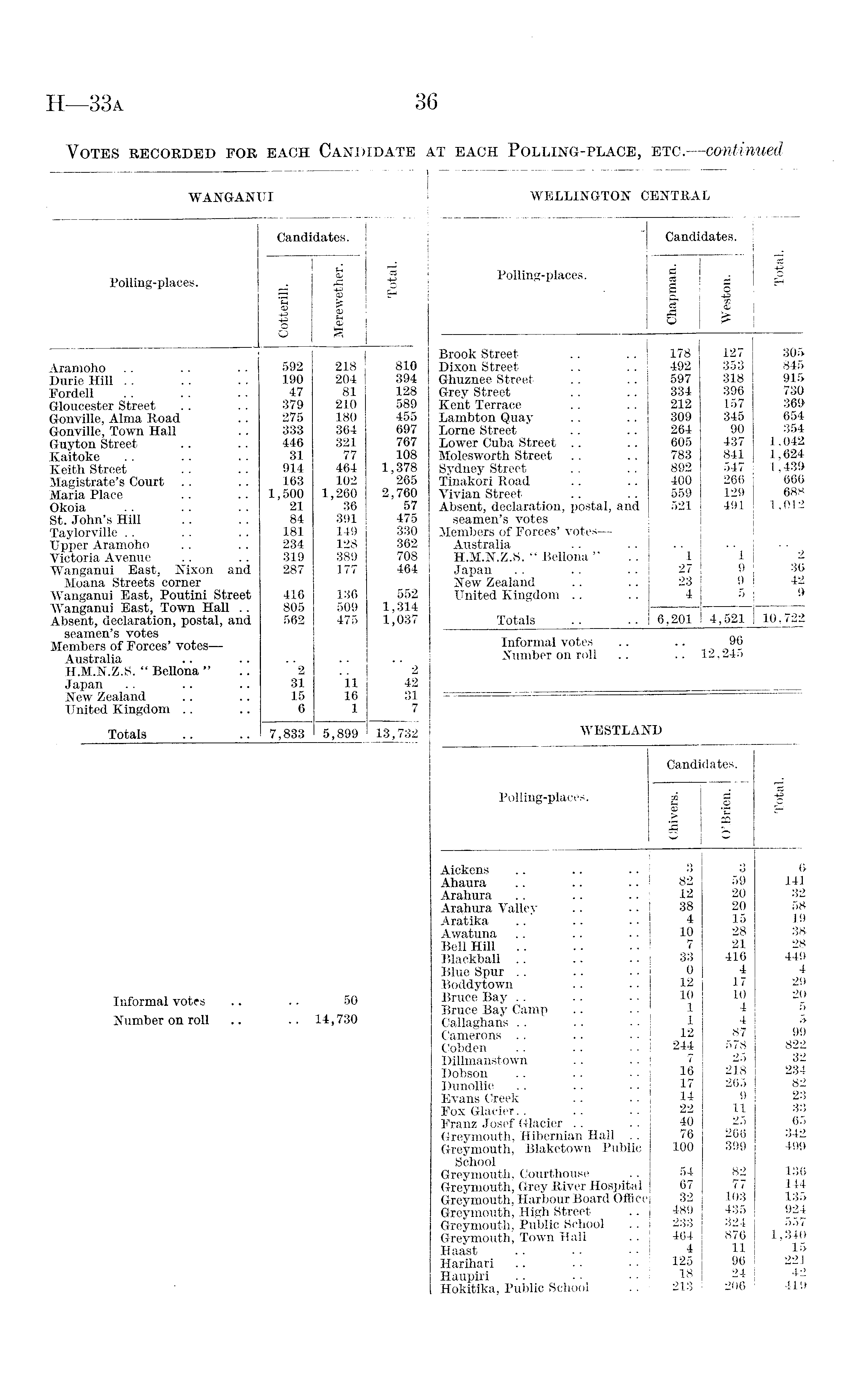 WELLINGTON CENTRAL - Candidates. Polling-places. s s & g 1 pi "3 H Brook Street Dixon Street Ghuznee Street Grey Street Kent Terrace Lambton Quay Lome Street Lower Cuba Street .. Molesworth Street Sydney Street Tinakori Road Vivian Street Absent, declaration, postal, and seamen's votes Members of Forces' votes — Australia H.M.N.Z.S. " Bellona " Japan New Zealand United Kingdom 178 492 597 334 212 309 264 605 783 892 400 559 521 1 27 23 4 127 353 318 396 157 345 90 437 841 547 266 129 491 ' 1 9 9" 5 305 845 915 730 369 654 354 1,042 1,624 1,439 666 688 1,012 2 36 42 9 Totals 6,201 4,521 10,722 Informal votes Number on roll 96 12,245 WESTLAND Candidates. Polling-places. 1 _>> ffl "3 "§ Aickens Ahaura Arahura Arahura Valley Aratika Awatuna Bell Hill Blackball Blue Spur Boddytown Bruce Bay Bruce Bay Camp Callaghans Camerons Cobden Dillmanstown Dobson Dunollie Evans Creek Fox Glacier.. Franz Josef Glacier Greymouth, Hibernian Hall .. Greymouth, Blaketown Public School Greymouth, Courthouse Greymouth, Grey River Hospital Greymouth, Harbour Board Office Greymouth, High Street Greymouth, Public School Greymouth, Town Hall Haast Harihari Haupiri Hokitika, Public School 3 82 12 38 4 10 7 33 0 12 10 1 1 12 244 16 17 14 22 40 76 100 54 67 32 489 233 464 4 125 18 213 3 59 20 20 15 28 21 416 4 17 10 4 4 87 578 25 218 265 9 11 25 266 399 82 77 103 435 324 876 11 96 24 206 6 141 32 58 19 38 28 449 4 29 20 5 6 99 822 32 234 82 23 33 65 342 499 136 144 135 924 557 1,340 15 221 42 419