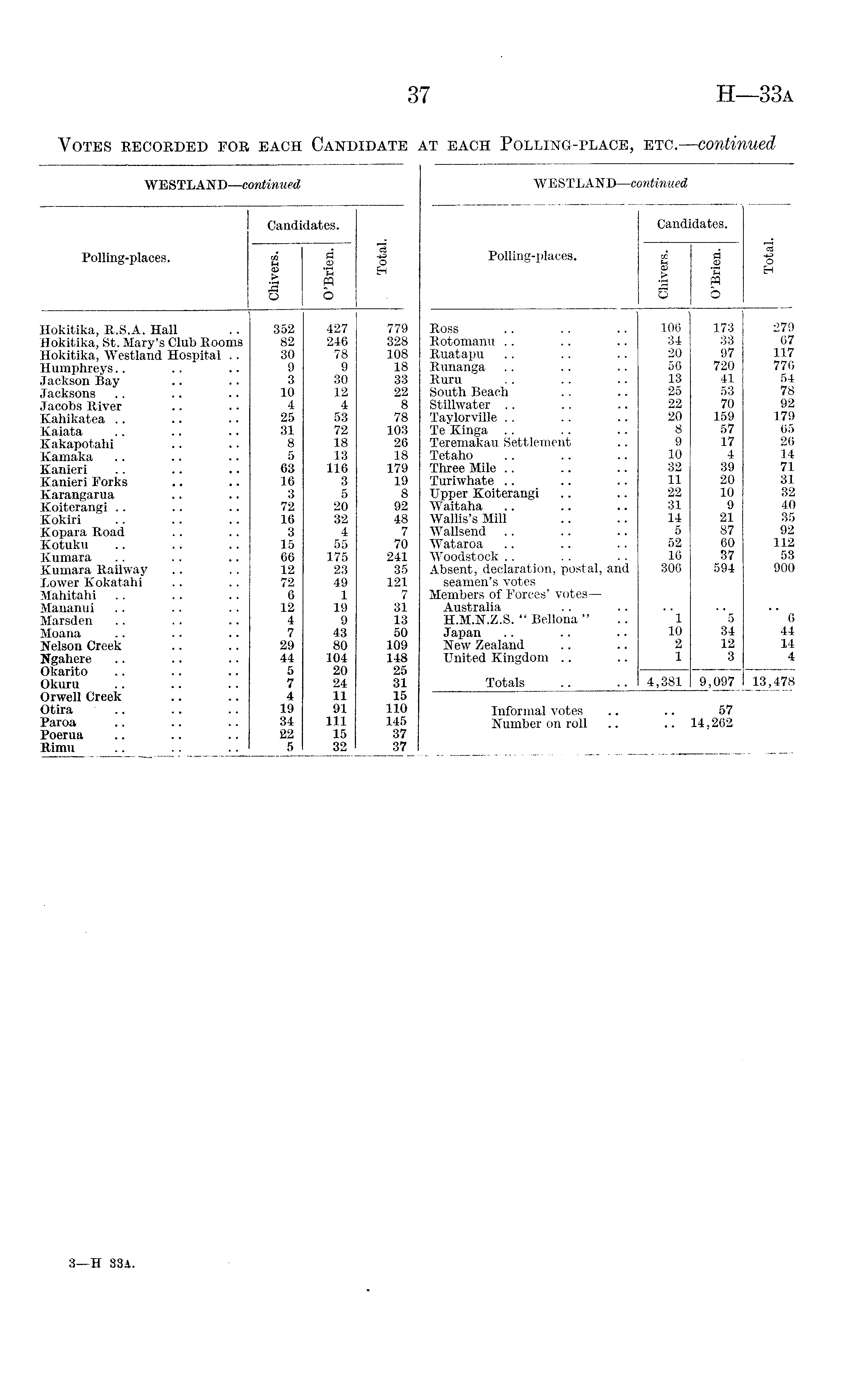 WESTLAND —continued Candidates. Polling-places. FH 1 "3 0 ® > 2 « EH o o Ross 106 173 279 Hotomanu .. 34 33 67 Ruatapu 20 97 117 Runanga .. 56 720 776 Ruru 13 41 54 South Beach 25 53 78 Stillwater 22 70 92 Taylorville 20 159 179 Te Kinga 8 57 65 Teremakau Settlement 9 17 26 Tetaho 10 4 14 Three Mile 32 39 71 Turiwhate 11 20 31 Upper Koiterangi 22 10 32 Waitaha 31 9 40 Wallis's Mill 14 21 35 Wallsend 5 87 92 Wataroa 52 60 112 Woodstock 16 37 58 Absent, declaration, postal, and 306 594 900 seamen's votes Members of Forces' votes — Australia H.M.N.Z.S. " Bellona " "l "5 " 6 Japan 10 34 44 New Zealand 2 12 14 United Kingdom 1 3 4 Totals 4,381 9,097 13,478 Informal votes 57 Number on roll 14,262
