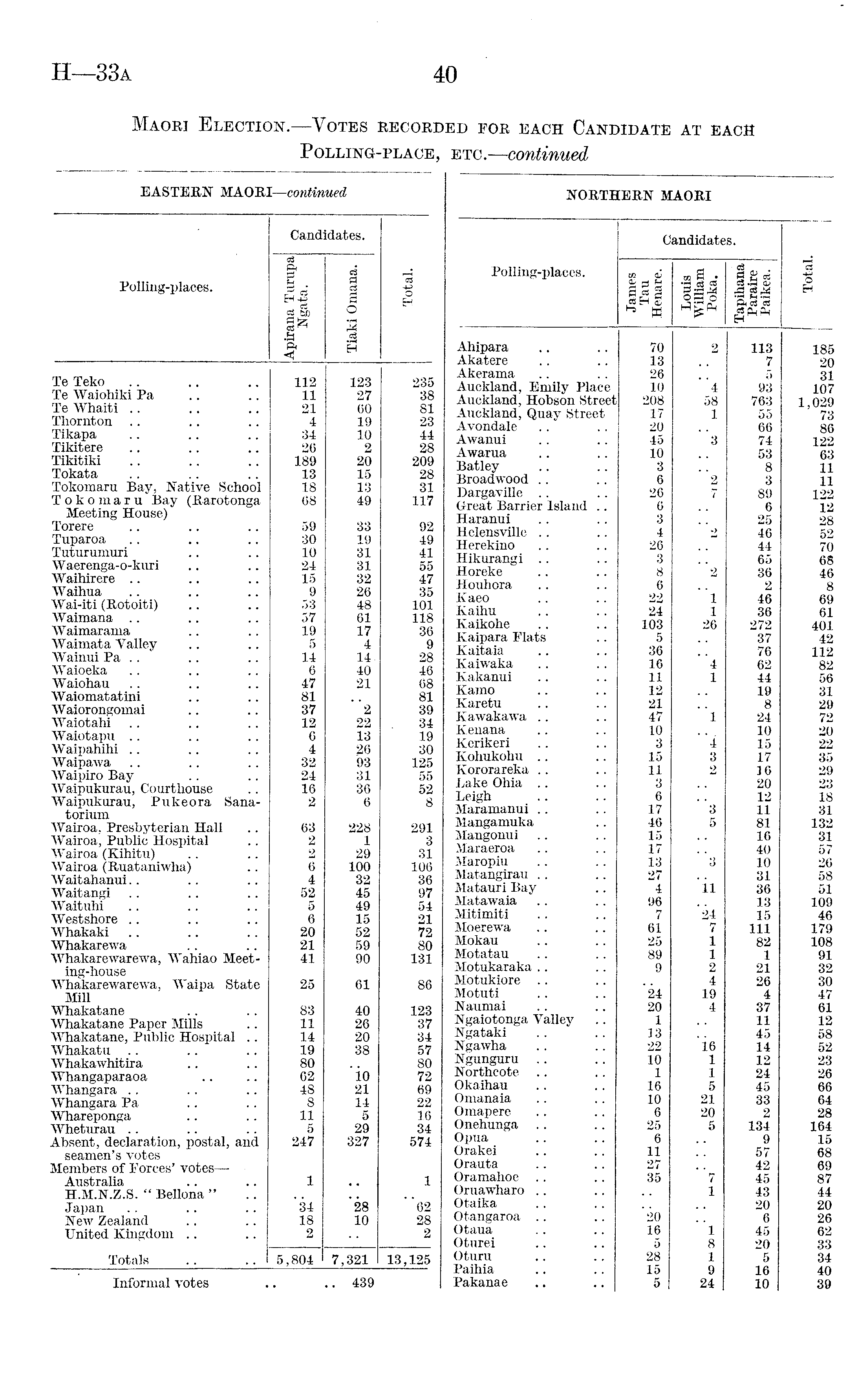 Maori Election.—Votes recorded for each Candidate at each Polling-place, etc.—continued