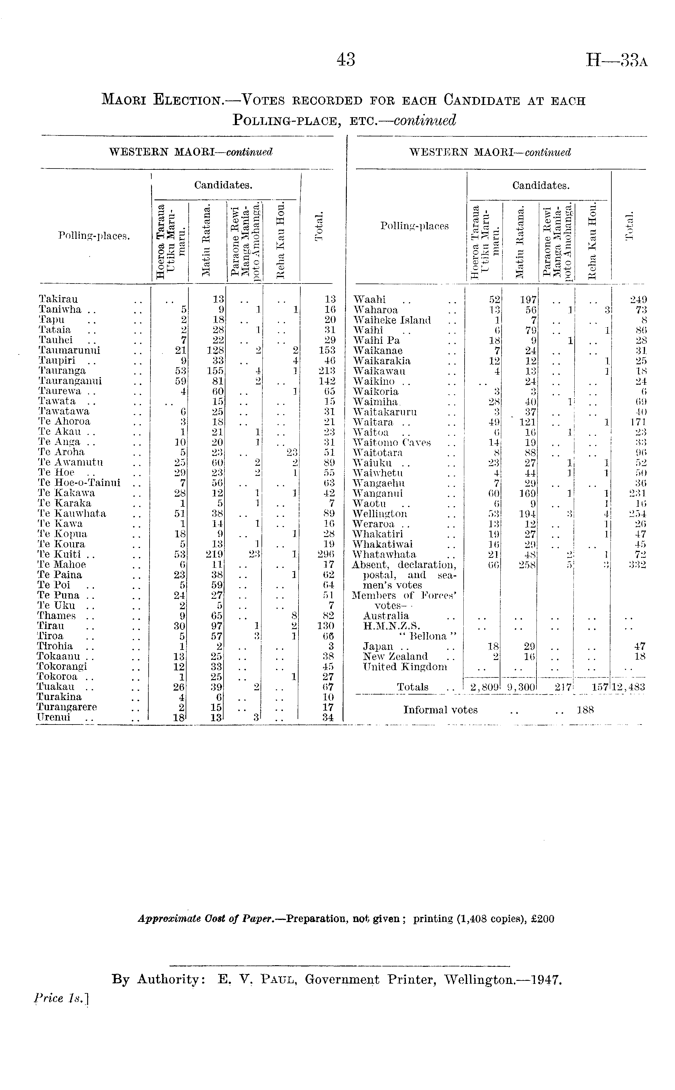Maori Election.—Votes recorded for each Candidate at each Polling-place, etc. —continued