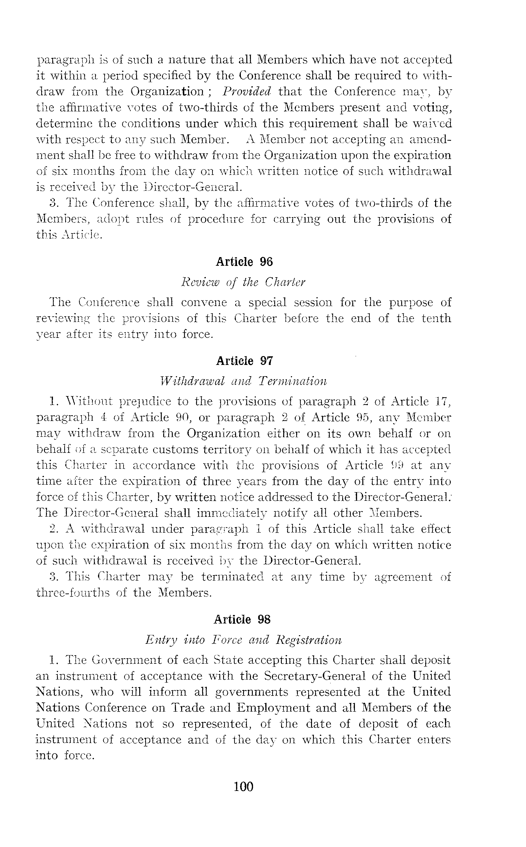 paragraph is of such a nature that all Members which have not accepted it within a period specified by the Conference shall be required to withdraw from the Organization ; Provided that the Conference may, by the affirmative votes of two-thirds of the Members present and voting, determine the conditions under which this requirement shall be waived with respect to any such Member. A Member not accepting an amendment shall be free to withdraw from the Organization upon the expiration of six months from the day on which written notice of such withdrawal is received by the Director-General. 3. The Conference shall, by the affirmative votes of two-thirds of the Members, adopt rules of procedure for carrying out the provisions of this Article. Article 96 Review of the Charter The Conference shall convene a special session for the purpose of reviewing the provisions of this Charter before the end of the tenth year after its entry into force. Article 97 Withdrawal and Termination 1. Without prejudice to the provisions of paragraph 2 of Article 17, paragraph 4 of Article 90, or paragraph 2 of Article 95, any Member may withdraw from the Organization either on its own behalf or on behalf of a separate customs territory on behalf of which it has accepted this Charter in accordance with the provisions of Article 99 at any time after the expiration of three years from the day of the entry into force of this Charter, by written notice addressed to the Director-General: The Director-General shall immediately notify all other Members. 2. A withdrawal under paragraph 1 of this Article shall take effect upon the expiration of six months from the day on which written notice of such withdrawal is received by the Director-General. 3. This Charter may be terminated at any time by agreement of three-fourths of the Members. Article 98 Entry into Force and Registration 1. The Government of each State accepting this Charter shall deposit an instrument of acceptance with the Secretary-General of the United Nations, who will inform all governments represented at the United Nations Conference on Trade and Employment and all Members of the United Nations not so represented, of the date of deposit of each instrument of acceptance and of the day on which this Charter enters into force.