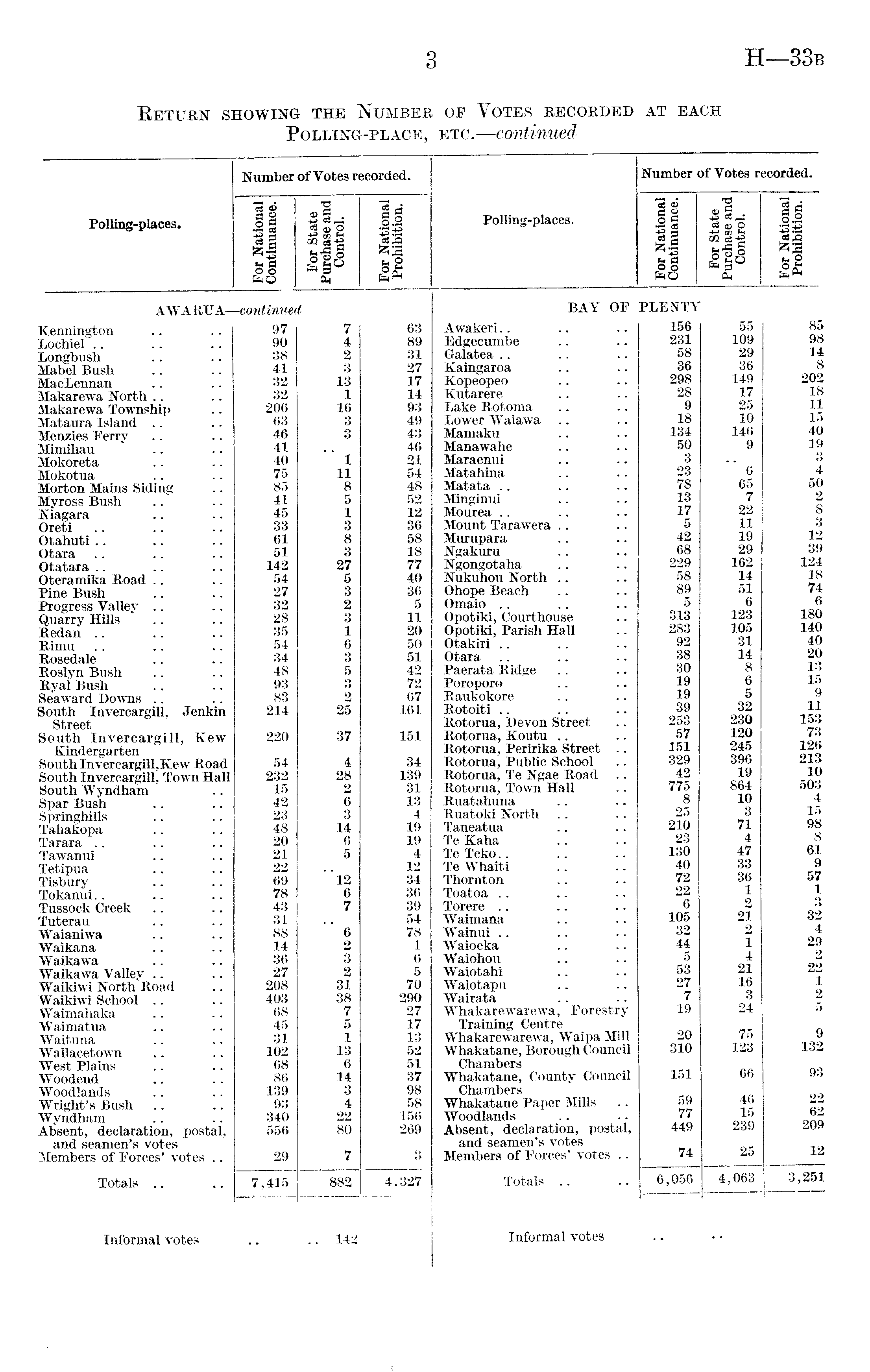 Number of Votes recorded. Number of Votes recorded. "S "3 • "3 jJ Polling-places. |I II II ill lis Ph II eSXi Polling-places. o g 21 II S ® 2 ®J-s I|a Cn II a 2 Eft" AWAK.XTA —contimied BAY OF PLENTY Kennington Lochiel Longbush Mabel Bush MacLennan Makarewa North Makarewa Township Mataura Island Menzies Ferry Mimihau Mokoreta Mokotua Morton Mains Siding Myross Bush Niagara Oreti Otahuti Otara Otatara Oteramika Road Pine Bush Progress Valley Quarry Hills Bedan .. Rimu Rosedale Boslyn Bush Ryal Bush Seaward Downs South Invercargill, Jenkin Street South Invercargill, Kew Kindergarten South Invercargill,Kew Boad South Invercargill, Town Hall South Wyndham Spar Bush Springhills Tahakopa Tarara Tawanui Tetipua .. Tisbury Tokanui Tussock Creek Tuterau Waianiwa Waikana Waikawa Waikawa Valley Waikiwi North Boad Waikiwi School Waimahaka Waimatua Waituna Wallacetown West Plains Woodend Woodlands Wright's Bush Wyndham Absent, declaration, postal, and seamen's votes Members of Forces' votes .. 97 90 38 41 32 32 206 63 46 41 40 75 85 41 45 33 61 51 142 54 27 32 28 35 54 34 48 93 83 214 220 54 232 15 42 23 48 20 21 22 69 78 43 31 88 14 36 27 208 403 68 45 31 102 68 86 139 93 340 556 29 7 4 2 3 13 1 16 3 3 " 1 11 8 5 1 3 8 3 27 5 3 2 3 1 6 3 5 3 2 25 37 4 28 2 6 3 14 6 5 ' 12 6 7 6 2 3 2 31 38 7 1 13 6 14 3 4 22 80 7 63 89 31 27 17 14 93 49 43 46 21 54 48 52 12 36 58 18 77 40 36 5 11 20 50 51 42 72 67 161 151 34 139 31 13 4 19 19 4 12 34 36 39 54 78 1 6 5 70 290 27 17 13 52 51 37 98 58 156 269 3 Awakeri.. Edgecumbe Galatea Kaingaroa Kopeopeo Kutarere Lake Botoma Lower Waiawa Mamaku Manawahe Maraenui Matahina Matata Minginui Mourea Mount Tarawera Murupara Ngakuru Ngongotaha Nukuhou North Ohope Beach Omaio Opotiki, Courthouse Opotiki, Parish Hall Otakiri Otara Paerata Bidge Poroporo Raukokore Rotoiti Rotorua, Devon Street Rotorua, Koutu Rotorua, Peririka Street .. Rotorua, Public School Rotorua, Te Ngae Road .. Rotorua, Town Hall Ruatahuna Ruatoki North Taneatua Te Kaha TeTeko.. Te Whaiti Thornton Toatoa Torere .. .. Waimana Wainui Waioeka Waiohou Waiotahi Waiotapu Wairata Whakarewarewa, Forestry Training Centre Whakarewarewa, Waipa Mill Whakatane, Borough Council Chambers Whakatane, County Council Chambers Whakatane Paper Mills Woodlands Absent, declaration, postal, and seamen's votes Members of Forces' votes .. 156 231 58 36 298 28 9 18 134 50 3 23 78 13 17 5 42 68 229 58 89 5 313 283 92 38 30 19 19 39 253 57 151 329 42 775 8 25 210 23 130 40 72 22 6 105 32 44 5 53 27 7 19 20 310 151 59 77 449 74 55 109 29 36 149 17 25 10 146 9 " 6 65 7 22 11 19 29 162 14 51 6 123 105 31 14 8 6 5 32 230 120 245 396 19 864 10 3 71 4 47 33 36 1 2 21 2 1 4 21 16 3 24 75 123 66 46 15 239 25 85 98 14 8 202 18 11 15 40 19 4 50 2 8 3 12 39 124 18 74 6 180 140 40 20 13 15 9 11 153 73 126 213 10 503 4 15 98 8 61 9 57 1 3 32 4 29 2 22 1 2 5 9 132 93 22 62 209 12 Totals 7,415 882 4,327 Totals 6,056 4,063 3,251 Informal votes .. 142 Informal votes ••