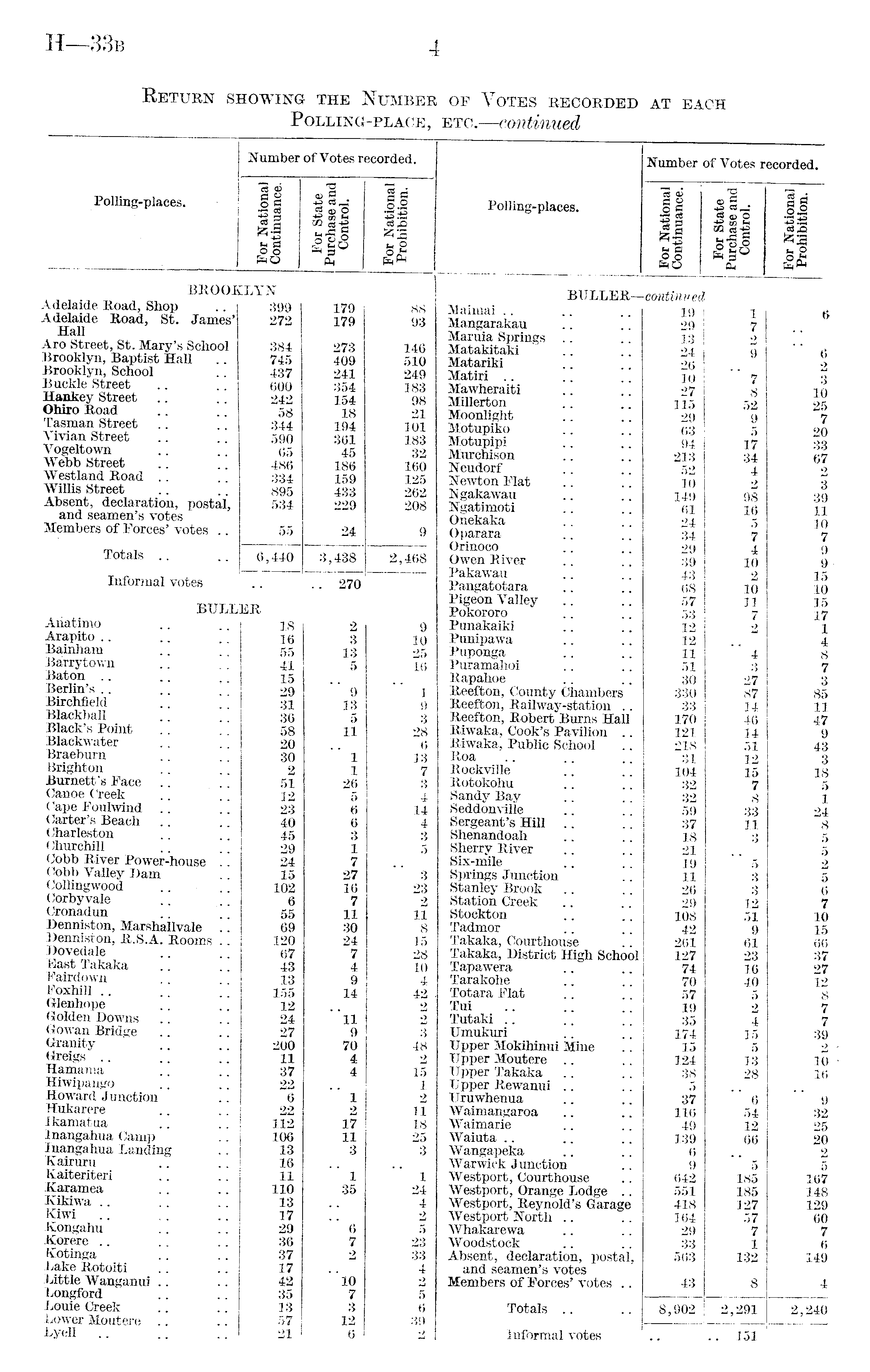 Number of Votes recorded. Number of Votes recorded. Polling-places. For National Continuance. For State Purchase and Control. For National Prohibition. Polling-places. For National Continuance. For State Purchase and Control. For National Prohibition. BROOKLYN BULLER■continued Adelaide Road, Shop Adelaide Road, St. James' Hall Aro Street, St. Mary's School 399 272 179 179 88 93 Maimai Mangarakau 19 29 1 7 6 384 273 146 Maruia Springs Matakitaki 13 24 26 10 27 115 29 63 94 213 9 6 2 Q Brooklyn, Baptist Hall 745 409 510 Matariki Brooklyn, School 437 241 249 Matiri fy Buckle Street Hankey Street Ohiro Road Tasman Street .. . j Vivian Street 600 242 58 344 590 354 154 18 194 361 183 98 21 101 183 Mawheraiti .. ! j Millerton Moonlight Motupiko Motupipi Murchison Neudorf i 8 52 9 17 34 i o 10 25 7 20 Vogeltown Webb Street .. 65 486 45 186 32 160 33 67 Westland Road Willis Street Absent, declaration, postal, and seamen's votes 334 895 534 159 433 229 125 262 208 Newton Flat .. !. Ngakawau Ngatimoti Onekaka Oparara 10 149 61 24 34 -± 98 16 3 39 11 10 7 Members of Forces' votes .. 55 24 9 5 7 Orinoco .. .' Owen River .. Totals 6,440 3,438 2,468 29 39 4 10 9 9 Pakawau Pangatotara .. . j Informal votes .. 270 43 68 2 10 15 10 BULLER Pigeon Valley Pokororo 57 53 11 7 15 17 Anatimo 18 2 9 Punakaiki 12 2 1 Arapito .. .. '' 16 3 10 Punipawa 12 4 Bainham .. ' j 55 13 25 Puponga 11 4 8 Barrytown .. 41 5 16 Puramahoi 51 3 7 Baton .. .. 15 Rapahoe 30 27 3 Berlin's .. .. '" 29 9 1 Reefton, County Chambers 330 87 85 Birchfleld 31 13 9 Reefton, Railway-station .. 33 14 11 Blackball .. "" 36 5 3 Reefton, Robert Burns Hall 170 46 47 Black's Point 58 11 28 Riwaka, Cook's Pavilion .. 121 14 9 Blackwater 20 6 Riwaka, Public School 218 51 43 Braeburn .. *' 30 1 13 Roa 31 12 3 Brighton .. '' 2 1 7 Rockville 104 32 15 18 Burnett's Face .. .! 51 26 3 liotokohu 7 5 Canoe Creek 12 5 4 Sandy Bay .. .' 32 8 1 Cape Foulwind .. ." 23 6 14 Seddonville 59 33 24 Carter's Beach .. .' 40 6 4 Sergeant's Hill .. .! 37 11 3 8 Charleston .. , \ 45 3 3 Shenandoah 18 Churchill .. " 29 1 5 Sherry River 21 5 Cobb River Power-house .. 24 7 Six-mile 19 2 Cobb Valley Dam 15 27 3 Springs Junction 11 3 5 Collingwood .. . ] 102 16 23 Stanley Brook 26 3 6 Corby vale "" '* 6 7 2 Station Creek 29 12 7 Cronadun 55 11 11 Stockton 108 51 10 Denniston, Marshailvale !! 69 30 8 Tadmor 42 9 15 Denniston, R.S.A. Rooms .. 120 24 15 Takaka, Courthouse 261 61 66 Dovedale 67 7 28 Takaka, District High School 127 23 37 Bast Takaka .. '. 43 4 10 Tapawera 74 16 27 Fairdown 13 9 4 Tarakohe 70 40 12 Foxhill .. j j |) 155 14 42 . Totara Flat 57 5 8 Glenhope .. .' 12 2 Tui .. .. .; 19 7 Golden Downs 24 "ll 2 Tutaki 35 4 7 Gowan Bridge 27 9 3 Umukuri 174 15 39 Granity 200 70 48 Upper Mokihinui Mine 15 5 2 Greigs 11 4 2 Upper Moutere 124 13 10 Hamama 37 4 15 Upper Takaka 38 28 16 v Hiwiparigo .. . j 22 1 Upper Rewanui 5 Howard Junction 6 1 2 Uruwhenua 37 6 9 Hukarere 22 2 11 Waimangaroa 116 54 32 Ikamatua 112 17 18 Waimarie 49 12 25 Inangahua Camp 106 11 25 Waiuta 139 66 20 Inangahua Landing 13 3 3 Wangapeka 6 2 Kairuru 16 Warwick Junction 9 5 5 Kalteriteri 11 1 1 Westport, Courthouse 642 185 167 Karamea 110 35 24 Westport, Orange Lodge .. Westport, Reynold's Garage 551 185 148 Ivikiwa 13 4 418 127 129 Kiwi 17 2 Westport North 164 57 60 Kongahu 29 6 5 Whakarewa 29 7 7 Korere 36 7 23 Woodstock 33 1 6 Kotinga 37 2 33 Absent, declaration, postal, 563 132 149 Lake Rotoiti 17 4 and seamen's votes Little Wanganui 42 "10 2 Members of Forces' votes .. 43 8 4 Longford 35 7 c Louie Creek 13 3 6 Totals 8,902 2,291 2,240 Lower Moutere 57 12 39 Lyell 21 6 Informal votes .. 151