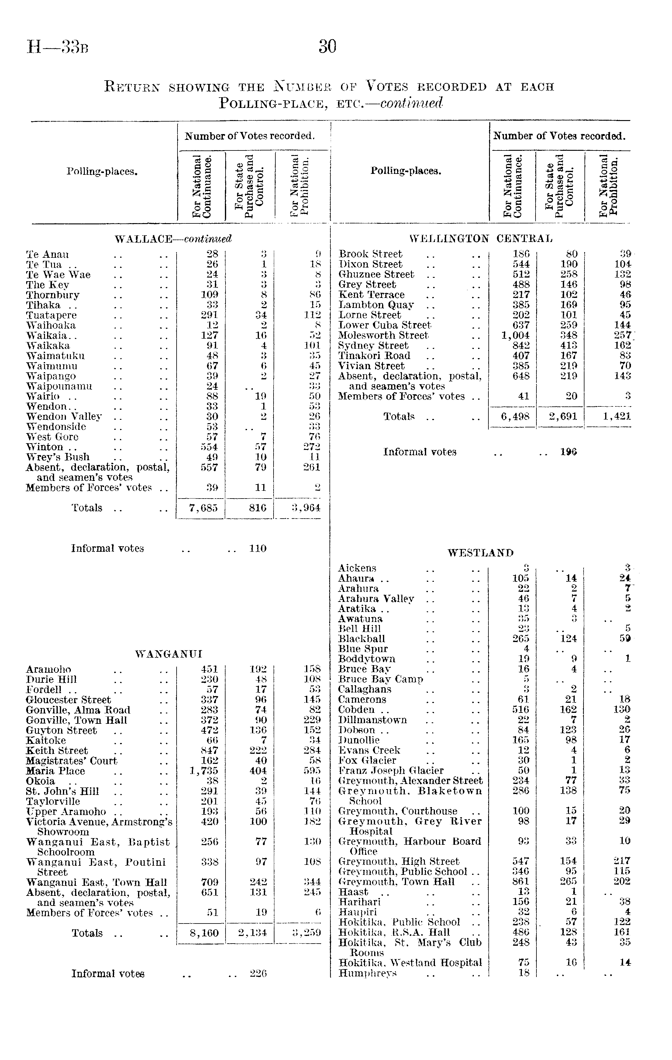 Number of Votes recorded. Number of Votes recorded. Polling-places. IS 1J s§ •a a a J ® 2 £ CM °> a J J *1 8| fc.Oi Polling-places. If H II •d 3 ® 2 *•§§ cu !i 11 l£ WALLACE—continued WELLINGTON CENTRAL Te Anau Te Tua Te Wae Wae The Key Thornbury Tihaka Tuatapere Waihoaka Waikaia.. Waikaka. Waimatuku Waimumu Waipango Waipotmamu Wairio .. Wendon.. Wendon Valley Wendonside West Gore Winton .. Wrey's Bush Absent, declaration, postal, and seamen's votes Members of Forces' votes .. 28 26 24, 31 109 33 291 12 127 91 48 67 39 24: 88 33 30 53 57 554 49 557 39 3 1 3 3 8 2 34 2 16 4 3 6 2 ' 19 1 2 9 18 8 3 86 15 112 8 101 35 45 27 33 50 53 26 33 76 272 11 261 2 Brook Street Dixon Street Ghuznee Street Grey Street Kent Terrace Lambton Quay Lome Street Lower Cuba Street Molesworth Street Sydney Street Tinakori Road Vivian Street Absent, declaration, postal, and seamen's votes Members of Forces' votes .. 186 544 512 488 217 385 202 637 1,004 842 407 385 648 41 80 190 258 146 102 169 101 259 348 413 167 219 219 20 39 104: 132 98 46 95 45 144 257 162" 83 70 143 3 Totals 6,498 2,691 1,421 7 57 10 79 11 Informal votes .. 196 Totals 7,685 816 3,964 Informal votes 110 WESTLAND WANGi! Aramoho Durie Hill Fordell Gloucester Street Gonville, Alma Road Gonville, Town Hall Guyton Street Kaitoke Keith Street Magistrates' Court Maria Place Okoia St. John's Hill Taylorville Upper Aramoho Victoria Avenue, Armstrong's Showroom Wanganui East, Baptist Schoolroom Wanganui East, Poutini Street Wanganui East, Town Hall Absent, declaration, postal, and seamen's votes Members of Forces' votes .. lNTJI 451 230 57 337 283 372 472 66 847 162 1,735 38 291 201 193 420 256 338 709 651 51 192 48 17 96 74 90 136 7 222 40 404 2 39 45 56 100 77 97 242 131 19 158 108 53 145 82 229 152 34 284 58 595 16 144 76 110 182 130 108 344 245 6 Aickens Ahaura Arahura Arahura Valley Aratika .. .. Awatuna Bell Hill Blackball Blue Spur Boddytown Bruce Bay Bruce Bay Camp Callaghans Camerons Cobden Dillmanstown Dobson Dunollie Evans Creek Fox Glacier Franz Joseph Glacier Greymouth, Alexander Street Greymouth, Blaketown School Greymouth, Courthouse Greymouth, Grey River Hospital Greymouth, Harbour Board Office Greymouth, High Street Greymouth, Public School.. Greymouth, Town Hall Haast Harihari Haupiri Hokitika, Public School .. Hokitika, R.S.A. Hall Hokitika, St. Mary's Club Rooms Hokitika, West land Hospital Humphreys 105 22 46 13 35 23 265 4 19 16 5 3 61 516 22 84 165 12 30 50 234 286 100 98 93 547 346 861 13 156 32 238 486 248 75 18 ' 14 2 7 4 i.24 9 4 " 2 21 162 7 123 98 4 1 1 77 138 15 17 33 154 95 265 1 21 6 57 128 43 16 3 24 7" 5 2 5 591 18 130 2 26 17 6 2 13 33 75 20 29 10 217 115 202 38 4 122 161 35 14: Totals 8,160 2 ,134 3,259 Informal votes 226
