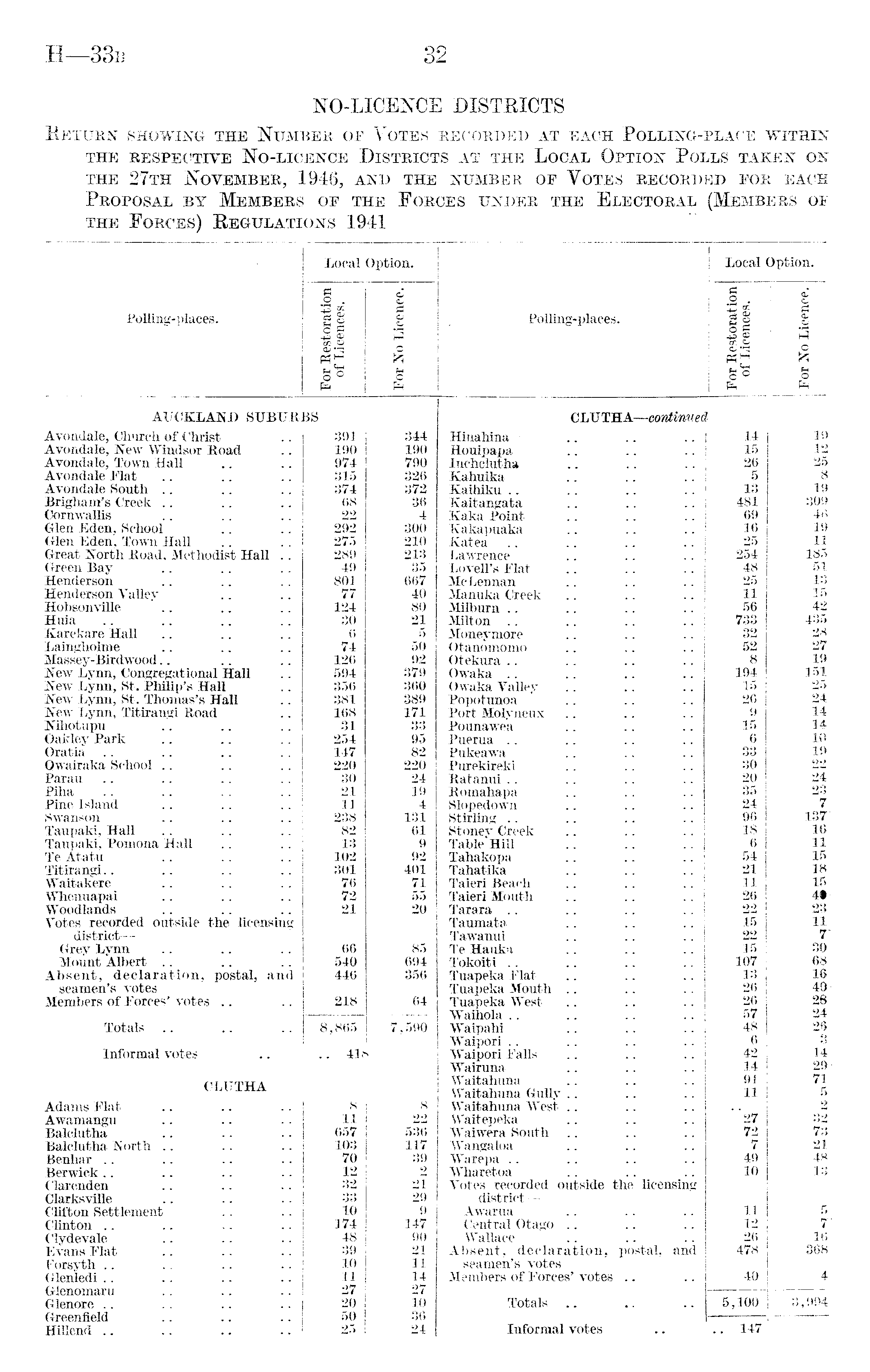 NO-LICENCE DISTRICTS Return showing the Number of Votes recorded at each Polling-place within the respective No-Licence Districts at the Local Option Polls taken on the 27th November, 1946, and the number of Votes recorded for each Proposal by Members of the Forces under the Electoral (Members of the Forces) Regulations 1941