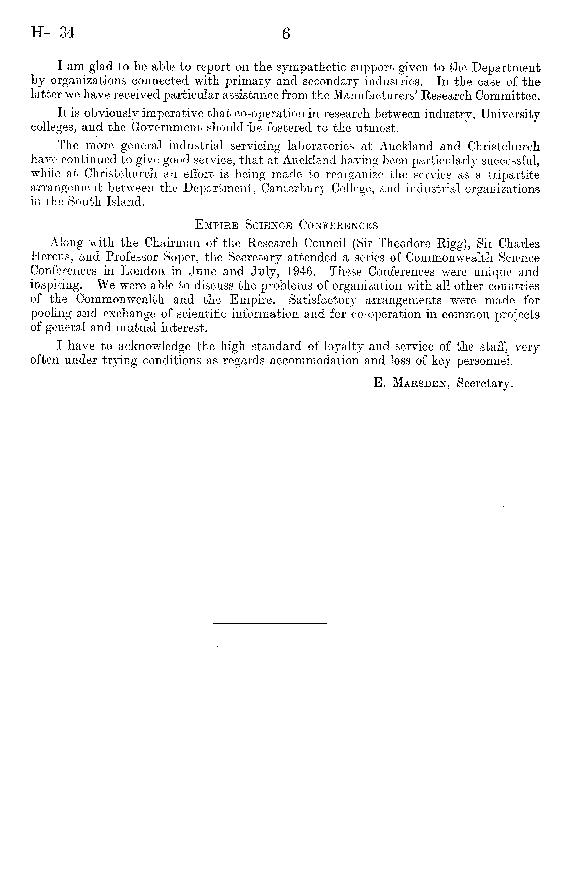 I am glad to be able to report on the sympathetic support given to the Department by organizations connected with primary and secondary industries. In the case of the latter we have received particular assistance from the Manufacturers' Research Committee. It is obviously imperative that co-operation in research between industry, University colleges, and the Government should "be fostered to the utmost. The more general industrial servicing laboratories at Auckland and Christchurch have continued to give good service, that at Auckland having been particularly successful,, while at Christchurch an effort is being made to reorganize the service as a tripartite arrangement between the Department, Canterbury College, and industrial organizations in the South Island. Empire Science Conferences Along with the Chairman of the Research Council (Sir Theodore Rigg), Sir Charles Hercus, and Professor Soper, the Secretary attended a series of Commonwealth Science Conferences in London in June and July, 1946. These Conferences were unique and inspiring. We were able to discuss the problems of organization with all other countries of the Commonwealth and the Empire. Satisfactory arrangements were made for pooling and exchange of scientific information and for co-operation in common projects of general and mutual interest. I have to acknowledge the high standard of loyalty and service of the staff, very often under trying conditions as regards accommodation and loss of key personnel. E. Marsden, Secretary.