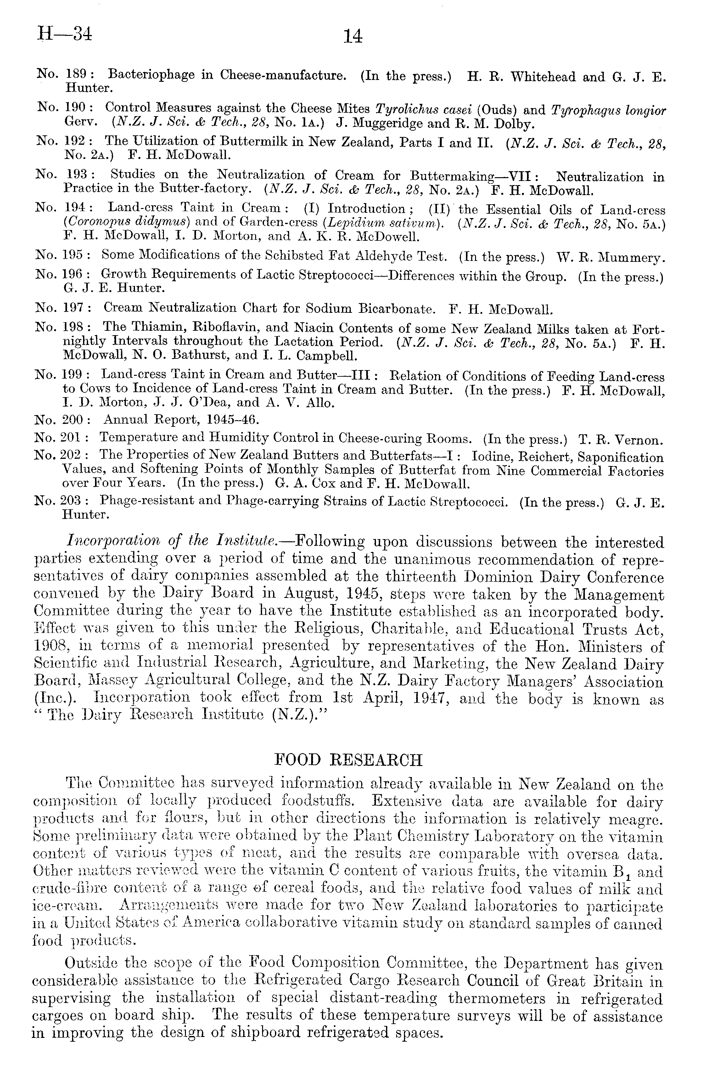 No. 189: Bacteriophage in Cheese-manufacture. (In the press.) H. R. Whitehead and G. J. E. Hunter. No. 190 : Control Measures against the Cheese Mites Tyrolichus casei (Ouds) and Tyyophagus longior Gerv. (N.Z. J. Sci. & Tech., 28, No. la.) J. Muggeridge and R. M. Dolby. No. 192 : The Utilization of Buttermilk in New Zealand, Parts I and 11. (N.Z. J. Sci. & Tech., 28. No. 2a.) F. H. McDowall. No. 193 : Studies on the Neutralization of Cream for Buttermaking—Vll: Neutralization in Practice in the Butter-factory. (N.Z. J. Sci. & Tech., 28, No. 2a.) F. H. McDowall. No. 194 : Land-cress Taint in Cream : (I) Introduction; (II) the Essential Oijs of Land-cress (Coronopus didymus) and of Garden-cress (Lepidium sativum). (N.Z. J. Sci. & Tech., 28, No. 5a.) F. H. McDowall, I. D. Morton, and A. K. R. McDowell. No. 195 : Some Modifications of the Schibsted Fat Aldehyde Test. (In the press.) W. R. Mummery. No. 196 : Growth Requirements of Lactic Streptococci—Differences within the Group. (In the press.) G. J. E. Hunter. v ' No. 197 : Cream Neutralization Chart for Sodium Bicarbonate. F. H. McDowall. No. 198 : The Thiamin, Riboflavin, and Niacin Contents of some New Zealand Milks taken at Fortnightly Intervals throughout the Lactation Period. (N.Z. J. Sci. & Tech., 28, No. 5a.) F. H. McDowall, N. O. Bathurst, and I. L. Campbell. No. 199 : Land-cress Taint in Cream and Butter—lll: Relation of Conditions of Feeding Land-cress to Cows to Incidence of Land-cress Taint in Cream and Butter. (In the press.) F. H. McDowall, I. D. Morton, J. J. O'Dea, and A. V. Alio. No. 200 : Annual Report, 1945-46. No. 201 : Temperature and Humidity Control in Cheese-curing Rooms. (In the press.) T. R. Vernon. No. 202 : The Properties of New Zealand Butters and Butterfats—l: lodine, Reichert, Saponification Values, and Softening Points of Monthly Samples of Butterfat from Nine Commercial Factories over Four Years. (In the press.) G. A. Cox and F. H. McDowall. No. 203 : Phage-resistant and Phage-carrying Strains of Lactic Streptococci. (In the press.) G. J. E. Hunter. Incorporation of the Institute.—Following upon discussions between the interested parties extending over a period of time and the unanimous recommendation of representatives of dairy companies assembled at the thirteenth Dominion Dairy Conference convened by the Dairy Board in August, 1945, steps were taken by the Management Committee during the year to have the Institute established as an incorporated body. Effect was given to this under the Religious, Charitable, and Educational Trusts Act, 1908, in terms of a memorial presented by representatives of the Hon. Ministers of Scientific and Industrial Research, Agriculture, and Marketing, the New Zealand Dairy Board, Massey Agricultural College, and the N.Z. Dairy Factory Managers' Association (Inc.). Incorporation took effect from Ist April, 1947, and the body is known as " The Dairy Research Institute (N.Z.)." FOOD RESEARCH The Committee has surveyed information already available in New Zealand on the composition of locally produced foodstuffs. Extensive data are available for dairy products and for flours, but in other directions the information is relatively meagre. Some preliminary data were obtained by the Plant Chemistry Laboratory on the vitamin content of various types of meat, and the results are comparable with oversea data. Other matters reviewed were the vitamin C content of various fruits, the vitamin B x and crude-fibre content of a range of cereal foods, and the relative food values of milk and ice-cream. Arrangements were made for two New Zealand laboratories to participate in a United States of America collaborative vitamin study on standard samples of canned food products. Outside the scope of the Food Composition Committee, the Department has given considerable assistance to the Refrigerated Cargo Research Council of Great Britain in supervising the installation of special distant-reading thermometers in refrigerated cargoes on board ship. The results of these temperature surveys will be of assistance in improving the design of shipboard refrigerated spaces.