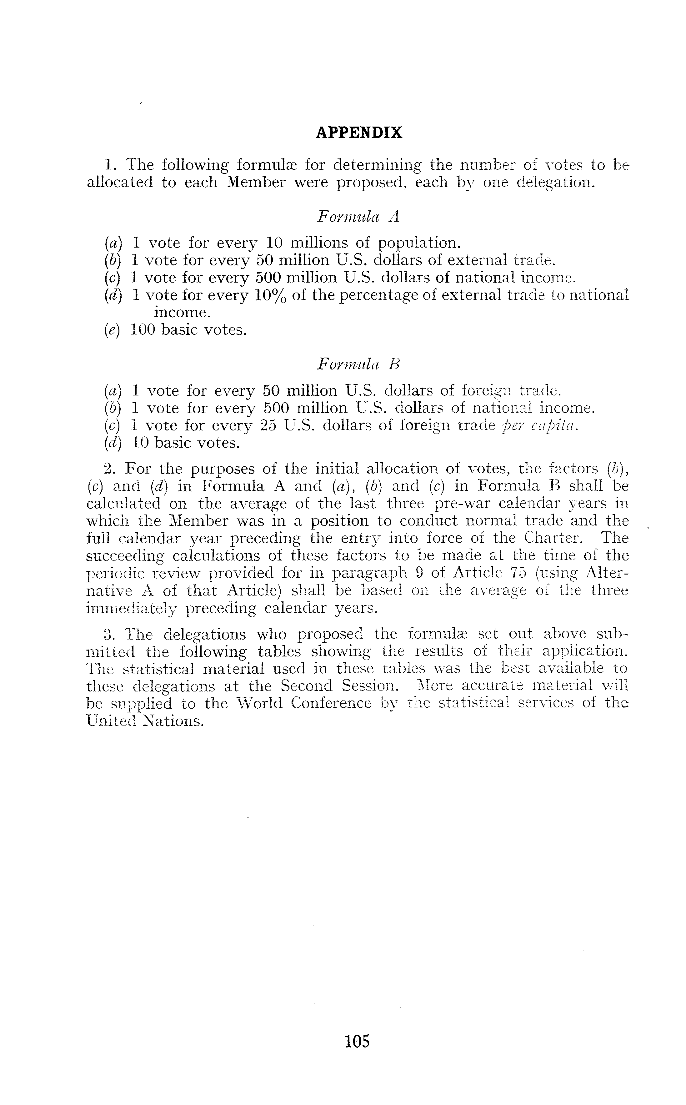 APPENDIX 1. The following formulae for determining the number of votes to be allocated to each Member were proposed, each by one delegation. Formula A (a) 1 vote for every 10 millions of population. (b) 1 vote for every 50 million U.S. dollars of external trade. (c) 1 vote for every 500 million U.S. dollars of national income. (d) 1 vote for every 10% of the percentage of external trade to national income. (e) 100 basic votes. Formula B (a) 1 vote for every 50 million U.S. dollars of foreign trade. (&) 1 vote for every 500 million U.S. dollars of national income. (c) 1 vote for every 25 U.S. dollars of foreign trade per capita. (d) 10 basic votes. 2. For the purposes of the initial allocation of votes, the factors (b), (c) and (d) in Formula A and (a), (b) and (c) in Formula B shall be calculated on the average of the last three pre-war calendar years in which the Member was in a position to conduct normal trade and the full calendar year preceding the entry into force of the Charter. The succeeding calculations of these factors to be made at the time of the periodic review provided for in paragraph 9 of Article 75 (using Alternative A of that Article) shall be based on the average of the three immediately preceding calendar years. 3. The delegations who proposed the formulae set out above submitted the following tables showing the results of their application. The statistical material used in these tables was the best available to these delegations at the Second Session. More accurate material will be supplied to the World Conference by the statistical services of the United Nations.
