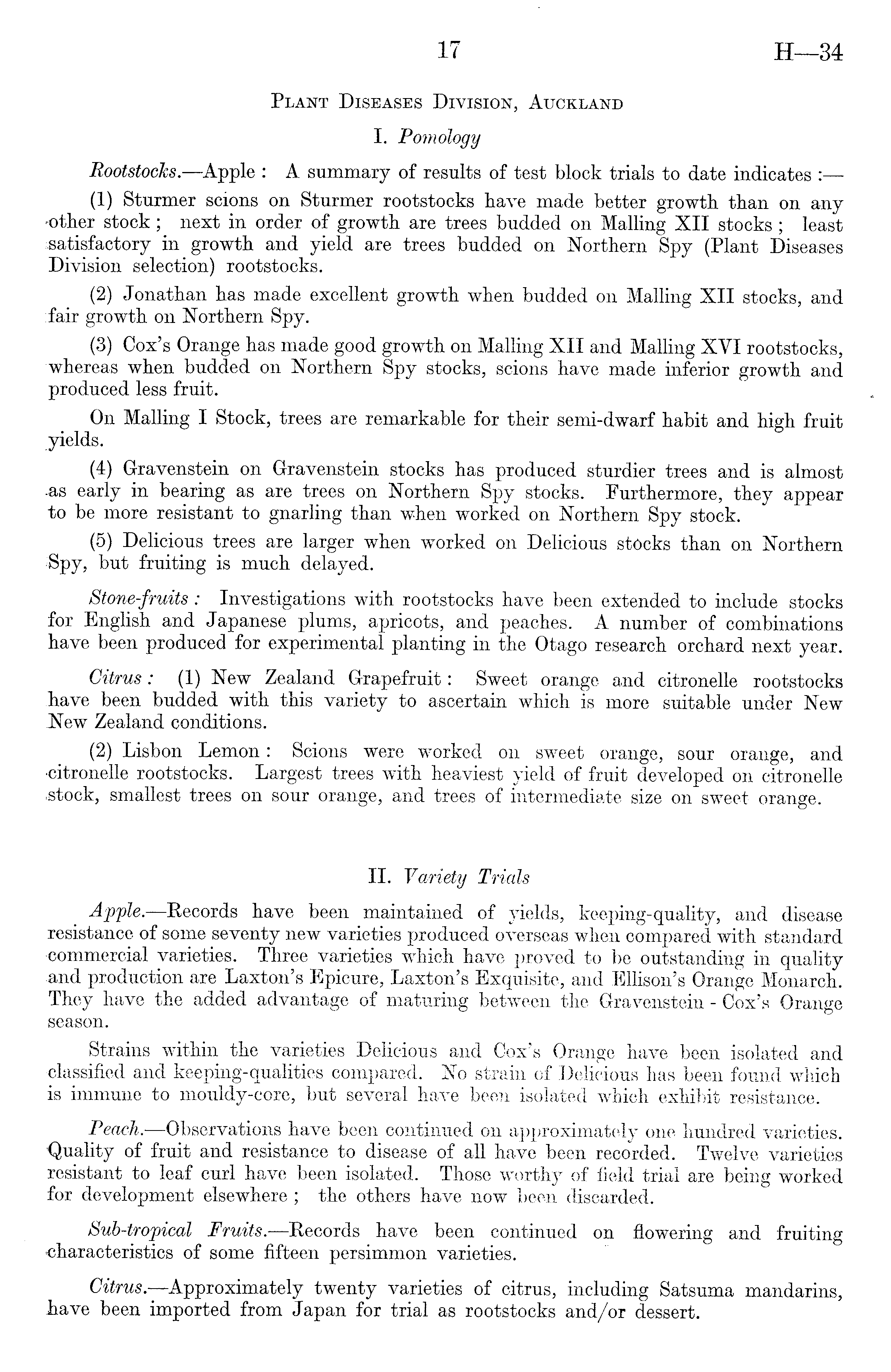 Plant Diseases Division, Auckland I. Pomology RootstocJcs.—Apple : A summary of results of test block trials to date indicates : (1) Sturmer scions on Sturmer rootstocks have made better growth, than on any -other stock; next in order of growth are trees budded on Mailing XII stocks; least satisfactory in growth and yield are trees budded on Northern Spy (Plant Diseases Division selection) rootstocks. (2) Jonathan has made excellent growth when budded on Mailing XII stocks, and fair growth on Northern Spy. (3) Cox's Orange has made good growth on Mailing XII and Mailing XVI rootstocks, whereas when budded on Northern Spy stocks, scions have made inferior growth and produced less fruit. On Mailing I Stock, trees are remarkable for their semi-dwarf habit and high fruit yields. (4) Gravenstein on Gravenstein stocks has produced sturdier trees and is almost •as early in bearing as are trees on Northern Spy stocks. Furthermore, they appear to be more resistant to gnarling than when worked on Northern Spy stock. (5) Delicious trees are larger when worked on Delicious stocks than on Northern Spy, but fruiting is much delayed. Stone-fruits: Investigations with rootstocks have been extended to include stocks for English and Japanese plums, apricots, and peaches. A number of combinations have been produced for experimental planting in the Otago research orchard next year. Citrus: (1) New Zealand Grapefruit: Sweet orange and citronelle rootstocks .have been budded with this variety to ascertain which is more suitable under New New Zealand conditions. (2) Lisbon Lemon: Scions were worked on sweet orange, sour orange, and ■citronelle rootstocks. Largest trees with heaviest yield of fruit developed on citronelle stock, smallest trees on sour orange, and trees of intermediate size on sweet orange. 11. Variety Trials Apple.—Records have been maintained of yields, keeping-quality, and disease resistance of some seventy new varieties produced overseas when compared with standard -commercial varieties. Three varieties which have proved to be outstanding in quality and production are Laxton's Epicure, Laxton's Exquisite, and Ellison's Orange Monarch. They have the added advantage of maturing between the Gravenstein - Cox's Orange season. Strains within the varieties Delicious and Cox's Orange have been isolated and •classified and keeping-qualities compared. No strain of Delicious has been found which is immune to mouldy-core, but several have been isolated which exhibit resistance. Peach. —Observations have been continued on approximately one hundred varieties. ■Quality 0 f fruit and resistance to disease of all have been recorded. Twelve varieties resistant to leaf curl have been isolated. Those worthy of field trial are being worked for development elsewhere ; the others have now been discarded. Sub-tropical Fruits. —Records have been continued on flowering and fruiting characteristics of some fifteen persimmon varieties. Citrus—Approximately twenty varieties of citrus, including Satsuma mandarins, have been imported from Japan for trial as rootstocks and/or dessert.