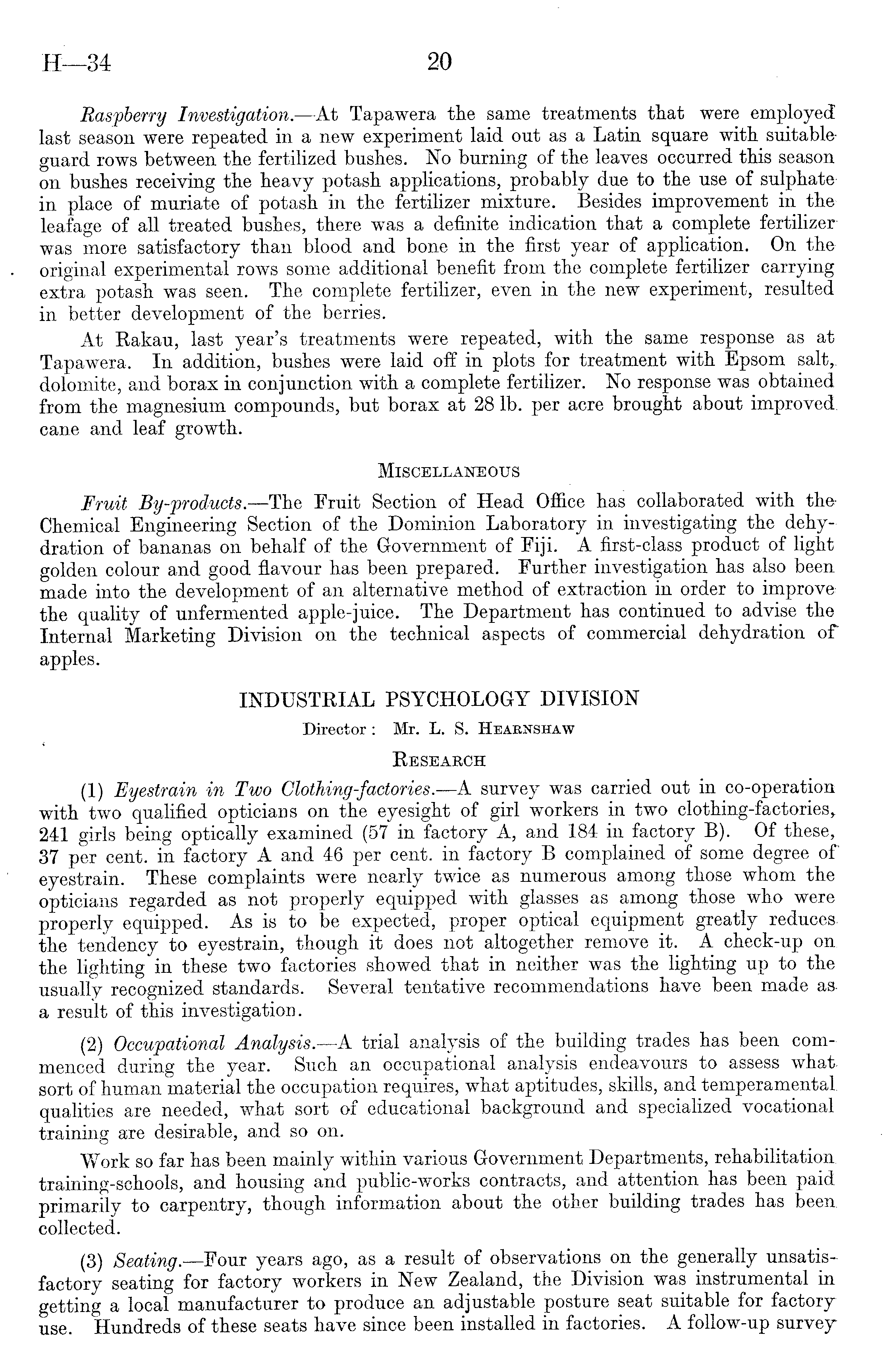Raspberry Investigation.—At Tapawera the same treatments that were employed last season were repeated in a new experiment laid out as a Latin square with, suitableguard rows between the fertilized bushes. No burning of the leaves occurred this season on bushes receiving the heavy potash applications, probably due to the use of sulphate in place of muriate of potash in the fertilizer mixture. Besides improvement in theleafage of all treated bushes, there was a definite indication that a complete fertilizerwas more satisfactory than blood and bone in the first year of application. On the original experimental rows some additional benefit from the complete fertilizer carrying extra potash was seen. The complete fertilizer, even in the new experiment, resulted in better development of the berries. At Rakau, last year's treatments were repeated, with the same response as atTapawera. In addition, bushes were laid off in plots for treatment with Epsom salt,, dolomite, and borax in conjunction with a complete fertilizer. No response was obtained from the magnesium compounds, but borax at 28 lb. per acre brought about improved, cane and leaf growth. Miscellaneous Fruit By-products. —The Fruit Section of Head Office has collaborated with the Chemical Engineering Section of the Dominion Laboratory in investigating the dehydration of bananas on behalf of the Government of Fiji. A first-class product of light golden colour and good flavour has been prepared. Further investigation has also been made into the development of an alternative method of extraction in order to improve the quality of unfermented apple-juice. The Department has continued to advise the Internal Marketing Division on the technical aspects of commercial dehydration of apples. INDUSTRIAL PSYCHOLOGY DIVISION Director : Mr. L. S. Hearnshaw Research (1) Eyestrain in Two Clothing-factories. —A survey was carried out in co-operation with two qualified opticians on the eyesight of girl workers in two clothing-factories, 241 girls being optically examined (57 in factory A, and 184 in factory B). Of these, 37 per cent, in factory A and 46 per cent, in factory B complained of some degree of eyestrain. These complaints were nearly twice as numerous among those whom the opticians regarded as not properly equipped with glasses as among those who were properly equipped. As is to be expected, proper optical equipment greatly reduces the tendency to eyestrain, though it does not altogether remove it. A check-up on. the lighting in these two factories showed that in neither was the lighting up to the usually recognized standards. Several tentative recommendations have been made asa result of this investigation. (2) Occupational Analysis.—A trial analysis of the building trades has been commenced during the year. Such an occupational analysis endeavours to assess what sort of human material the occupation requires, what aptitudes, skills, and temperamental qualities are needed, what sort of educational background and specialized vocational training are desirable, and so on. Work so far has been mainly within various Government Departments, rehabilitation, training-schools, and housing and public-works contracts, and attention has been paid primarily to carpentry, though information about the other building trades has been, collected. (3) Seating.—Four years ago, as a result of observations on the generally unsatisfactory seating for factory workers in New Zealand, the Division was instrumental in getting a local manufacturer to produce an adjustable posture seat suitable for factory use. Hundreds of these seats have since been installed in factories. A follow-up survey