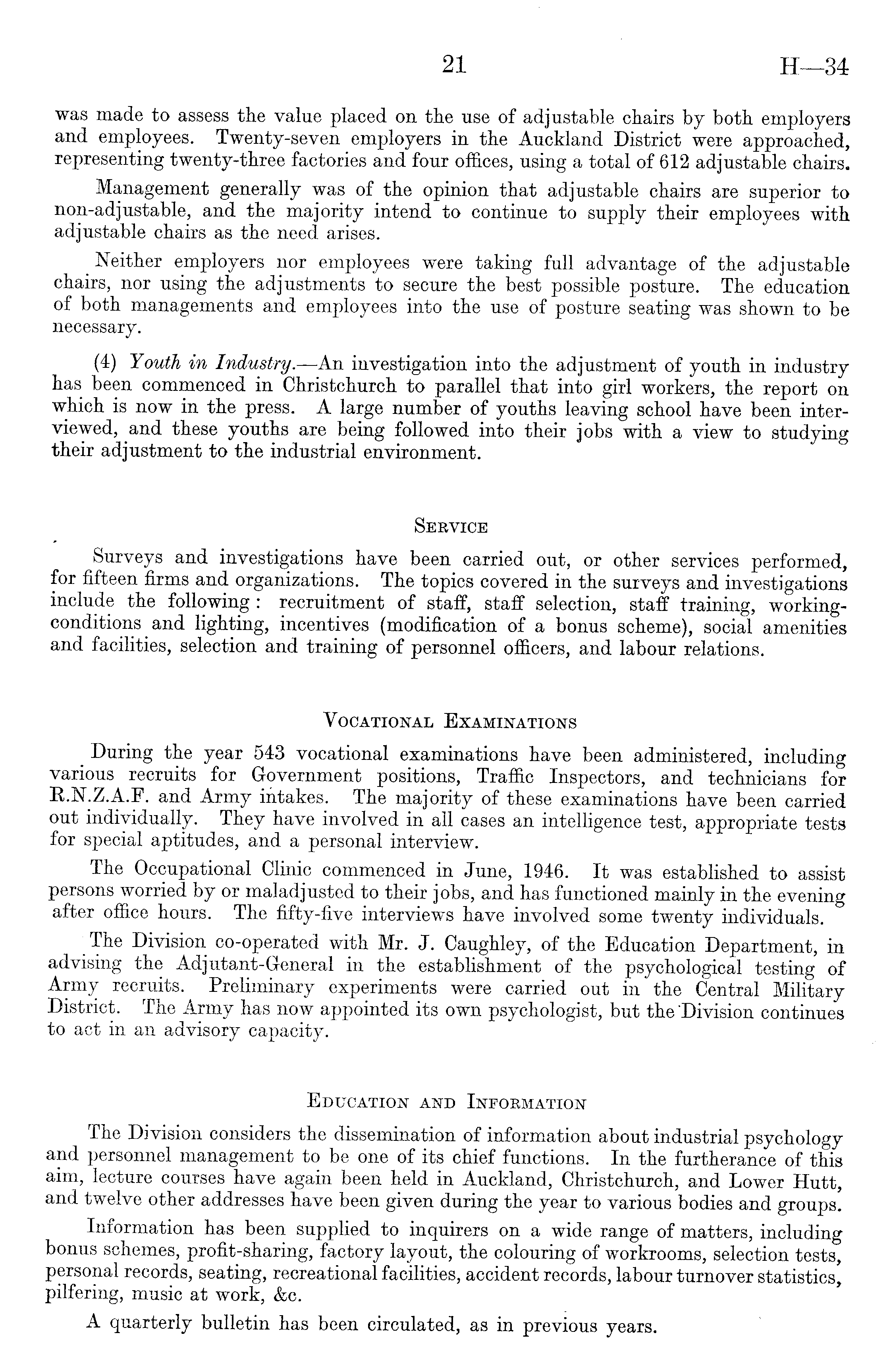 was made to assess the value placed on the use of adjustable chairs by both employers and employees. Twenty-seven employers in the Auckland District were approached, representing twenty-three factories and four offices, using a total of 612 adjustable chairs. Management generally was of the opinion that adjustable chairs are superior to non-adjustable, and the majority intend to continue to supply their employees with adjustable chairs as the need arises. Neither employers nor employees were taking full advantage of the adjustable chairs, nor using the adjustments to secure the best possible posture. The education of both managements and employees into the use of posture seating was shown to be necessary. i (4) Youth in Industry.—An investigation into the adjustment of youth in industry has been commenced in Christchurch to parallel that into girl workers, the report on which is now in the press. A large number of youths leaving school have been interviewed, and these youths are being followed into their jobs with a view to studying their adjustment to the industrial environment. Service Surveys and investigations have been carried out, or other services performed, for fifteen firms and organizations. The topics covered in the surveys and investigations include the following : recruitment of staff, staff selection, staff training, workingconditions and lighting, incentives (modification of a bonus scheme), social amenities and facilities, selection and training of personnel officers, and labour relations. Vocational Examinations During the year 543 vocational examinations have been administered, including various recruits for Government positions, Traffic Inspectors, and technicians for E.N.Z.A.F. and Army intakes. The majority of these examinations have been carried out individually. They have involved in all cases an intelligence test, appropriate tests for special aptitudes, and a personal interview. The Occupational Clinic commenced in June, 1946. It was established to assist persons worried by or maladjusted to their jobs, and has functioned mainly in the evening after office hours. The fifty-five interviews have involved some twenty individuals. The Division co-operated with Mr. J. Caughley, of the Education Department, in advising the Adjutant-General in the establishment of the psychological testing of Army recruits. Preliminary experiments were carried out in the Central Military District. The Army has now appointed its own psychologist, but the "Division continues to act in an advisory capacity. Education and Information The Division considers the dissemination of information about industrial psychology and personnel management to be one of its chief functions. In the furtherance of this aim, lecture courses have again been held in Auckland, Christchurch, and Lower Hutt, and twelve other addresses have been given during the year to various bodies and groups. Information has been supplied to inquirers on a wide range of matters, including bonus schemes, profit-sharing, factory layout, the colouring of workrooms, selection tests, personal records, seating, recreational facilities, accident records, labour turnover statistics* pilfering, music at work, &c. A quarterly bulletin has been circulated, as in previous years.