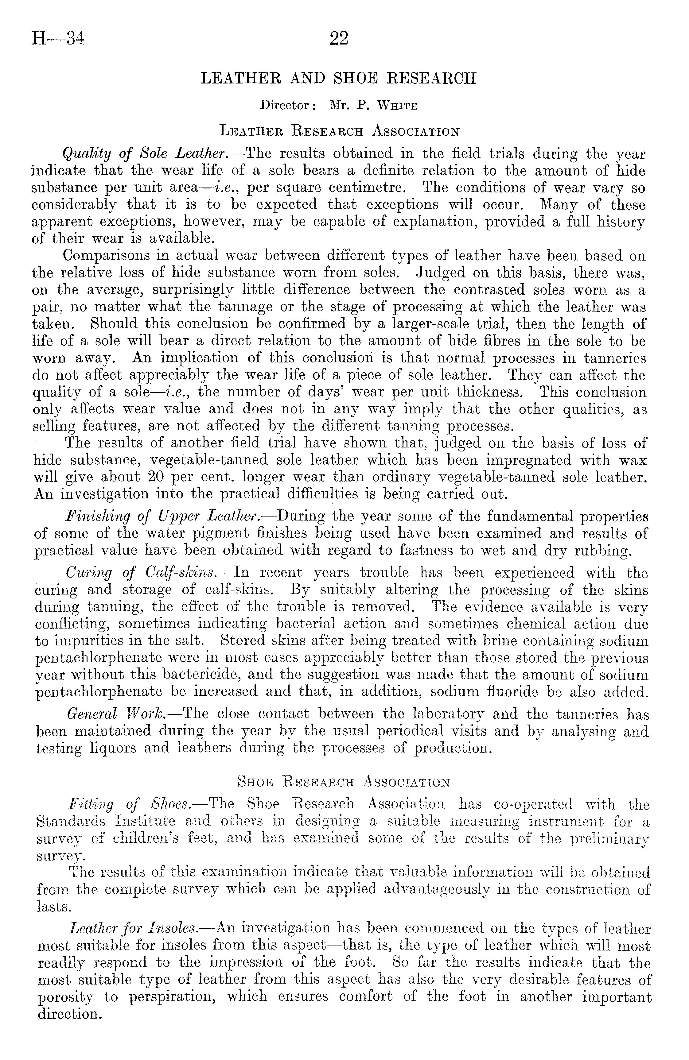 LEATHER AND SHOE RESEARCH Director: Mr. P. White Leather Research Association Quality of Sole Leather. —The results obtained in the field trials during the year indicate that the wear life of a sole bears a definite relation to the amount of hide substance per unit area —i.e., per square centimetre. The conditions of wear vary so considerably that it is to be expected that exceptions will occur. Many of these apparent exceptions, however, may be capable of explanation, provided a full history of their wear is available. Comparisons in actual wear between different types of leather have been based on the relative loss of hide substance worn from soles. Judged on this basis, there was, on the average, surprisingly little difference between the contrasted soles worn as a pair, no matter what the tannage or the stage of processing at which the leather was taken. Should this conclusion be confirmed by a larger-scale trial, then the length of life of a sole will bear a direct relation to the amount of hide fibres in the sole to be worn away. An implication of this conclusion is that normal processes in tanneries do not affect appreciably the wear life of a piece of sole leather. They can affect the quality of a sole —i.e., the number of days' wear per unit thickness. This conclusion only affects wear value and does not in any way imply that the other qualities, as selling features, are not affected by the different tanning processes. The results of another field trial have shown that, judged on the basis of loss of hide substance, vegetable-tanned sole leather which has been impregnated with wax will give about 20 per cent, longer wear than ordinary vegetable-tanned sole leather. An investigation into the practical difficulties is being carried out. Finishing of Upper Leather. —During the year some of the fundamental properties of some of the water pigment finishes being used have been examined and results of practical value have been obtained with regard to fastness to wet and dry rubbing. Curing of Calf-skins. —In recent years trouble has been experienced with the curing and storage of calf-skins. By suitably altering the processing of the skins during tanning, the effect of the trouble is removed. The evidence available is very conflicting, sometimes indicating bacterial action and sometimes chemical action due to impurities in the salt. Stored skins after being treated with brine containing sodium pentachlorphenate were in most cases appreciably better than those stored the previous year without this bactericide, and the suggestion was made that the amount of sodium pentachlorphenate be increased and that, in addition, sodium fluoride be also added. General Work. —The close contact between the laboratory and the tanneries has been maintained during the year by the usual periodical visits and by analysing and testing liquors and leathers during the processes of production. Shoe Research Association Fitting of Shoes. —The Shoe Research Association has co-operated with the Standards Institute and others in designing a suitable measuring instrument for a survey of children's feet, and has examined some of the results of the preliminary survey. The results of this examination indicate that valuable information will be obtained from the complete survey which can be applied advantageously in the construction of lasts. Leather for Insoles. —An investigation has been commenced on the types of leather most suitable for insoles from this aspect —that is, the type of leather which will most readily respond to the impression of the foot. So far the results indicate that the most suitable type of leather from this aspect has also the very desirable features of porosity to perspiration, which ensures comfort of the foot in another important direction.