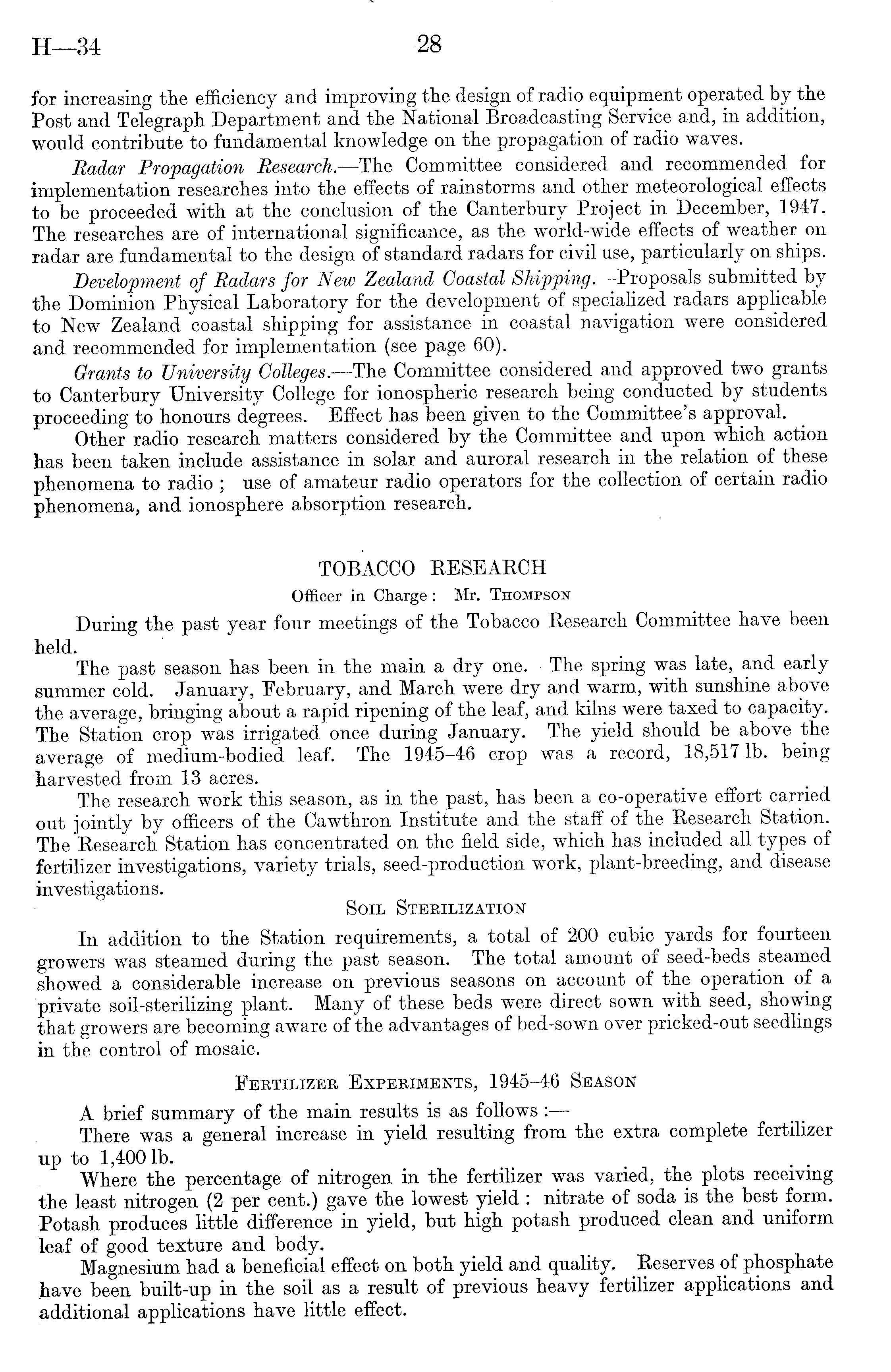 for increasing the efficiency and improving the design of radio equipment operated by the Post and Telegraph Department and the National Broadcasting Service and, in addition, would contribute to fundamental knowledge on the propagation of radio waves. Radar Propagation Research. —The Committee considered and recommended for implementation researches into the effects of rainstorms and other meteorological effects to be proceeded with at the conclusion of the Canterbury Project in December, 1947. The researches are of international significance, as the world-wide effects of weather on radar are fundamental to the design of standard radars for civil use, particularly on ships. Development of Radars for New Zealand Coastal Shipping—Proposals submitted by the Dominion Physical Laboratory for the development of specialized radars applicable to New Zealand coastal shipping for assistance in coastal navigation were considered and recommended for implementation (see page 60). Grants to University Colleges— The Committee considered and approved two grants to Canterbury University College for ionospheric research being conducted by students proceeding to honours degrees. Effect has been given to the Committee's approval. Other radio research matters considered by the Committee and upon which action has been taken include assistance in solar and auroral research in the relation of these phenomena to radio ; use of amateur radio operators for the collection of certain radio phenomena, and ionosphere absorption research. TOBACCO RESEARCH Officer in Charge : Mr. Thompson During the past year four meetings of the Tobacco Research Committee have been held. The past season has been in the main a dry one. The spring was late, and early summer cold. January, February, and March were dry and warm, with sunshine above the average, bringing about a rapid ripening of the leaf, and kilns were taxed to capacity. The Station crop was irrigated once during January. The yield should be above the average of medium-bodied leaf. The 1945-46 crop was a record, 18,517 lb. being harvested from 13 acres. The research work this season, as in the past, has been a co-operative effort carried out jointly by officers of the Cawthron Institute and the staff of the Research Station. The Research Station has concentrated on the field side, which has included all types of fertilizer investigations, variety trials, seed-production work, plant-breeding, and disease investigations. Soil Sterilization In addition to the Station requirements, a total of 200 cubic yards for fourteen growers was steamed during the past season. The total amount of seed-beds steamed showed a considerable increase on previous seasons on account of the operation of a private soil-sterilizing plant. Many of these beds were direct sown with seed, showing that growers are becoming aware of the advantages of bed-sown over pricked-out seedlings in the control of mosaic. Fertilizer Experiments, 1945-46 Season A brief summary of the main results is as follows : There was a general increase in yield resulting from the extra complete fertilizer up to 1,400 lb. Where the percentage of nitrogen in the fertilizer was varied, the plots receiving the least nitrogen (2 per cent.) gave the lowest yield : nitrate of soda is the best form. Potash produces little difference in yield, but high potash produced clean and uniform leaf of good texture and body. Magnesium had a beneficial effect on both yield and quality. Reserves of phosphate have been built-up in the soil as a result of previous heavy fertilizer applications and additional applications have little effect.