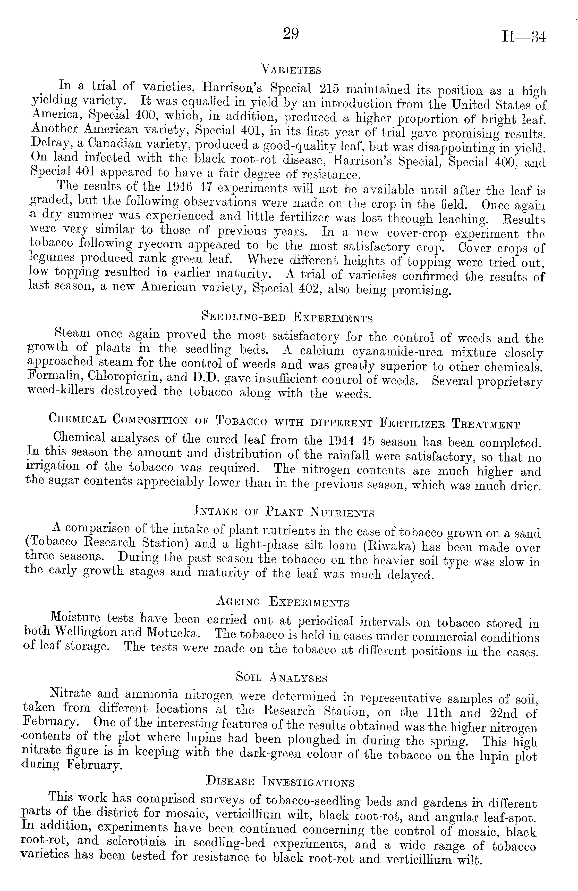 Varieties • ut^ n a var ieties, Harrison's Special 215 maintained its position as a high yielding variety. It was equalled in yield by an introduction from the United States of America, Special 400, which, in addition, produced a higher proportion of bright leaf. Another American variety, Special 401, in its first year of trial gave promising results. Delray, a Canadian variety, produced a good-quality leaf, but was disappointing in yield. On land infected with the black root-rot disease, Harrison's Special, Special 400, and Special 401 appeared to have a fair degree of resistance. The results of the 1946-47 experiments will not be available until after the leaf is graded, but the following observations were made on the crop in the field. Once again a dry summer was experienced and little fertilizer was lost through leaching. Results were very similar to those of previous years. In a new cover-crop experiment the tobacco following ryecorn appeared to be the most satisfactory crop.' Cover crops of legumes produced rank green leaf. Where different heights of topping were tried out, low topping resulted in earlier maturity. A trial of varieties confirmed the results of last season, a new American variety, Special 402, also being promising. Seedling-bed Experiments Steam once again proved the most satisfactory for the control of weeds and the growth of plants in the seedling beds. A calcium cyanamide-urea mixture closely approached steam for the control of weeds and was greatly superior to other chemicals, formalin, Chloropicrin, and D.D. gave insufficient control of weeds. Several proprietary weed-killers destroyed the tobacco along with the weeds. Chemical Composition op Tobacco with dipperent Fertilizer Treatment Chemical analyses of the cured leaf from the 1944-45 season has been completed. In this season the amount and distribution of the rainfall were satisfactory, so that no irrigation of the tobacco was required. The nitrogen contents are much higher and the sugar contents appreciably lower than in the previous season, which was much drier. Intake op Plant Nutrients comparison of the intake of plant nutrients in the case of tobacco grown on a sand < JLobacco Research Station) and a light-phase silt loam (Riwaka) has been made over three seasons. During the past season the tobacco on the heavier soil type was slow in the early growth stages and maturity of the leaf was much delayed. Ageing Experiments v xx. ] S i ff Ure tests k ave been carried out at periodical intervals on tobacco stored in oh Wellington and Motueka. The tobacco is held in cases under commercial conditions ot leal storage. The tests were made on the tobacco at different positions in the cases. Soil Analyses Nitrate and ammonia nitrogen were determined in representative samples of soil, taken from different locations at the Research Station, on the 11th and 22nd of February. One of the interesting features of the results obtained was the higher nitrogen •contents of the plot where lupins had been ploughed in during the spring. This high nitrate figure is m keeping with the dark-green colour of the tobacco on the lupin plot •during February. 1 1 Disease Investigations This work has comprised surveys of tobacco-seedling beds and gardens in different parts ot the district for mosaic, verticillium wilt, black root-rot, and angular leaf-spot. In addition, experiments have been continued concerning the control of mosaic, black xoot-rot, and sclerotinia in seedling-bed experiments, and a wide range of tobacco varieties has been tested for resistance to black root-rot and verticillium wilt.