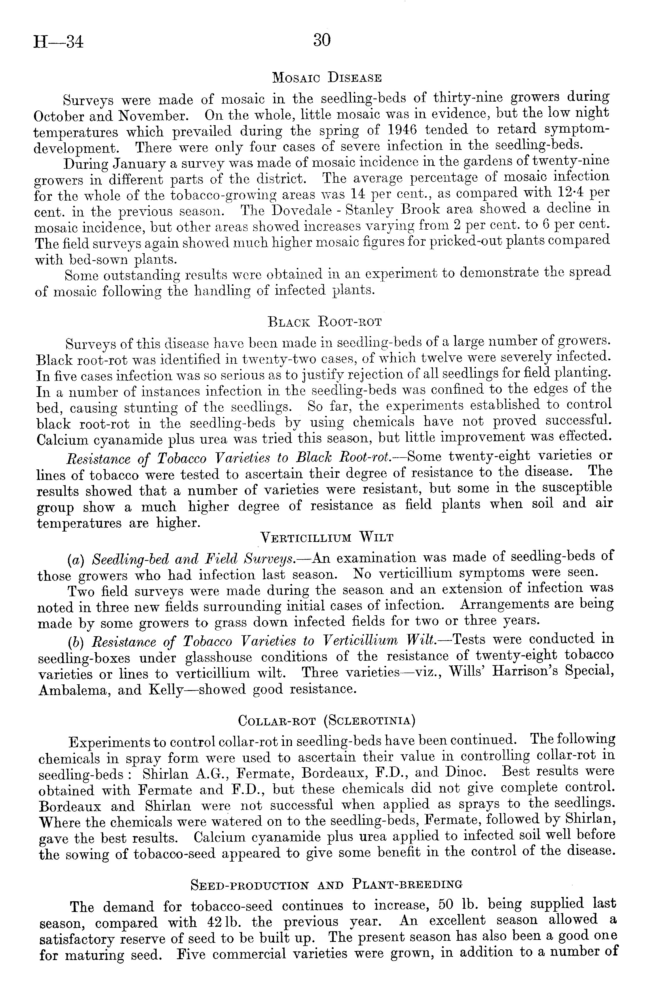 Mosaic Disease Surveys were made of mosaic in. the seedling-beds of thirty-nine growers during October and November. On the whole, little mosaic was in evidence, but the low night temperatures which prevailed during the spring of 1946 tended to retard symptomdevelopment. There were only four cases of severe infection in the seedling-beds. During January a survey was made of mosaic incidence in the gardens of twenty-nine growers in different parts of the district. The average percentage of mosaic infection for the whole of the tobacco-growing areas was 14 per cent., as compared with 12-4 per cent, in the previous season. The Dovedale - Stanley Brook area showed a decline in mosaic incidence, but other areas showed increases varying from 2 per cent, to 6 per cent. The field surveys again showed much higher mosaic figures for pricked-out plants compared with bed-sown plants. Some outstanding results were obtained in an experiment to demonstrate the spread of mosaic following the handling of infected plants. Black Root-rot Surveys-of this disease have been made in seedling-beds of a large number of growers. Black root-rot was identified in twenty-two cases, of which twelve were severely infected. In five cases infection was so serious as to justify rejection of all seedlings for field planting. In a number of instances infection in the seedling-beds was confined to the edges of the bed, causing stunting of the seedlings. So far, the experiments established to control black root-rot in the seedling-beds by using chemicals have not proved successful. Calcium cyanamide plus urea was tried this season, but little improvement was effected. Resistance of Tobacco Varieties to Black Root-rot. —Some twenty-eight varieties or lines of tobacco were tested to ascertain their degree of resistance to the disease. The results showed that a number of varieties were resistant, but some in the susceptible group show a much higher degree of resistance as field plants when soil and air temperatures are higher. Verticillium Wilt (а) Seedling-bed and Field Surveys. —An examination was made of seedling-beds of those growers who had infection last season. No verticillium symptoms were seen. Two field surveys were made during the season and an extension of infection was noted in three new fields surrounding initial cases of infection. Arrangements are being made by some growers to grass down infected fields for two or three years. (б) Resistance of Tobacco Varieties to Verticillium Wilt.—Tests were conducted in seedling-boxes under glasshouse conditions of the resistance of twenty-eight tobacco varieties or lines to verticillium wilt. Three varieties —viz., Wills' Harrison's Special, Ambalema, and Kelly —showed good resistance. Collar-rot (Sclerotinia) Experiments to control collar-rot in seedling-beds have been continued. The following chemicals in spray form were used to ascertain their value in controlling collar-rot in seedling-beds : Shirlan A.G., Fermate, Bordeaux, F.D., and Dinoc. Best results were obtained with Fermate and F.D., but these chemicals did not give complete control. Bordeaux and Shirlan were not successful when applied as sprays to the seedlings. Where the chemicals were watered on to the seedling-beds, Fermate, followed by Shirlan, gave the best results. Calcium cyanamide plus urea applied to infected soil well before the sowing of tobacco-seed appeared to give some benefit in the control of the disease. Seed-production and Plant-breeding The demand for tobacco-seed continues to increase, 50 lb. being supplied last season, compared with 42 lb. the previous year. An excellent season allowed a satisfactory reserve of seed to be built up. The present season has also been a good one for maturing seed. Five commercial varieties were grown, in addition to a number of