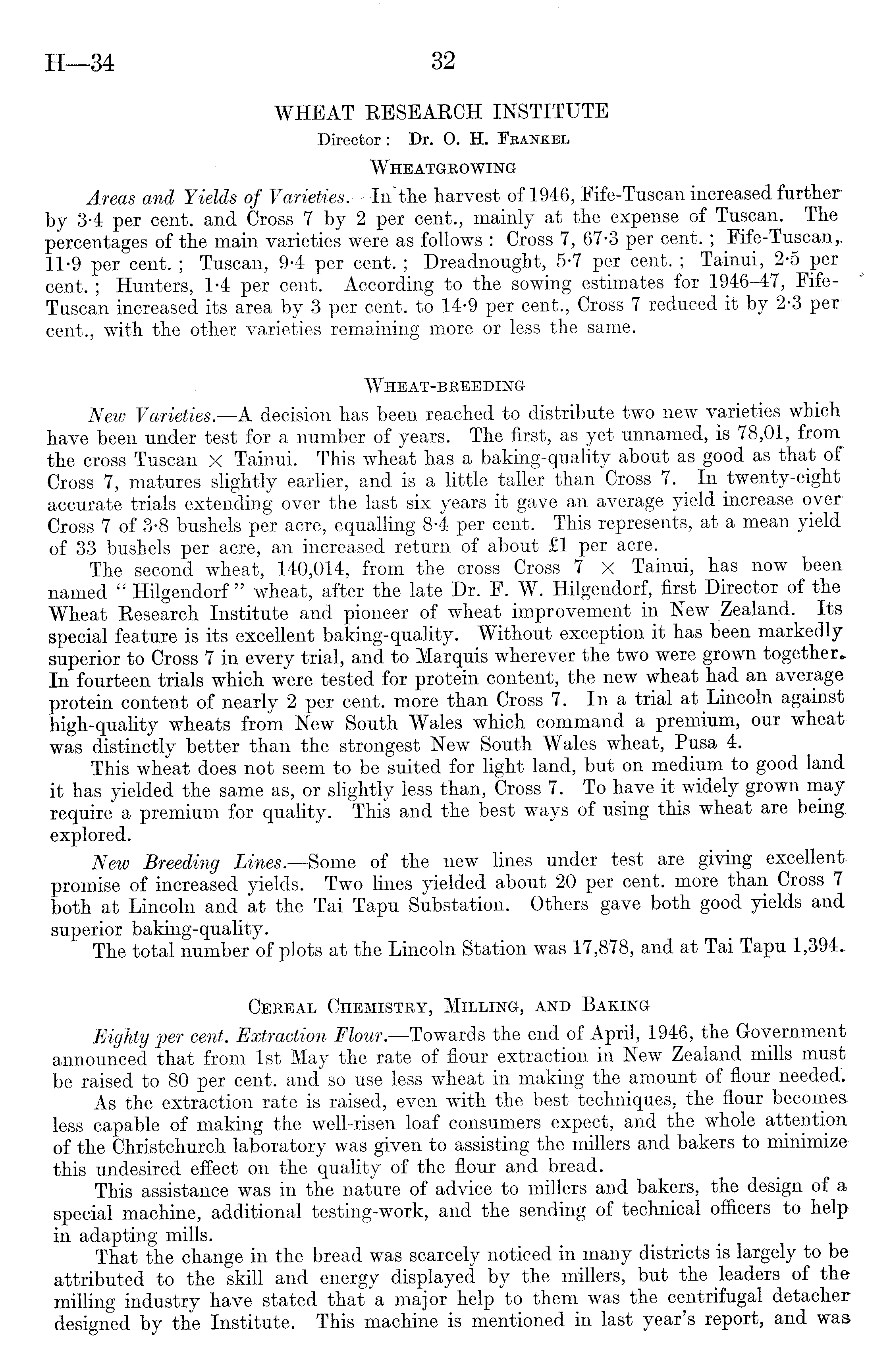 WHEAT RESEARCH INSTITUTE Director: Dr. 0. H. Frankel Wheatgrowing Areas and Yields of Varieties. —In*the harvest of 1946, Fife-Tuscan increased furtherby 34 per cent, and Cross 7 by 2 per cent., mainly at the expense of Tuscan. The percentages of the main varieties were as follows : Cross 7, 67-3 per cent.; Fife-Tuscan,. 11-9 per cent.; Tuscan, 9*4 per cent. ; Dreadnought, 5-7 per cent. ; Tainui, 2-5 per cent.; Hunters, I*4 per cent. According to the sowing estimates for 1946-47, FifeTuscan increased its area by 3 per cent, to 14-9 per cent., Cross 7 reduced it by 2-3 per cent., with the other varieties remaining more or less the same. Wheat-breeding New Varieties. —A decision has been reached to distribute two new varieties which have been under test for a number of years. The first, as yet unnamed, is 78,01, from the cross Tuscan X Tainui. This wheat has a baking-quality about as good as that of Cross 7, matures slightly earlier, and is a little taller than Cross 7. In twenty-eight accurate trials extending over the last six years it gave an average yield increase overCross 7of 3-8 bushels per acre, equalling 8-4 per cent. This represents, at a mean yield of 33 bushels per acre, an increased return of about £1 per acre. The second wheat, 140,014, from the cross Cross 7 X Tainui, has now been named " Hilgendorf " wheat, after the late Dr. F. W. Hilgendorf, first Director of the Wheat Research Institute and pioneer of wheat improvement in New Zealand. Its special feature is its excellent baking-quality. Without exception it has been markedly superior to Cross 7 in every trial, and to Marquis wherever the two were grown togetherIn fourteen trials which were tested for protein content, the new wheat had an average protein content of nearly 2 per cent, more than Cross 7. In a trial at Lincoln against high-quality wheats from New South Wales which command a premium, our wheat was distinctly better than the strongest New South Wales wheat, Pusa 4. This wheat does not seem to be suited for light land, but on medium to good land it has yielded the same as, or slightly less than, Cross 7. To have it widely grown may require a premium for quality. This and the best ways of using this wheat are being, explored. New Breeding Lines.—Some of the new lines under test are giving excellent, promise of increased yields. Two fines yielded about 20 per cent, more than Cross 7 both at Lincoln and at the Tai Tapu Substation. Others gave both good yields and superior baking-quality. The total number of plots at the Lincoln Station was 17,878, and at Tai Tapu 1,394. Cereal Chemistry, Milling, and Baking Eighty per cent. Extraction Flour. —Towards the end of April, 1946, the Government, announced that from Ist May the rate of flour extraction in New Zealand mills must be raised to 80 per cent, and so use less wheat in making the amount of flour needed. As the extraction rate is raised, even with the best techniques, the flour becomes less capable of making the well-risen loaf consumers expect, and the whole attention of the Christchurch laboratory was given to assisting the millers and bakers to minimize this undesired effect on the quality of the flour and bread. This assistance was in the nature of advice to millers and bakers, the design of a special machine, additional testing-work, and the sending of technical officers to help in adapting mills. That the change in the bread was scarcely noticed in many districts is largely to be attributed to the skill and energy displayed by the millers, but the leaders of the milling industry have stated that a major help to them was the centrifugal detacher designed by the Institute. This machine is mentioned in last year's report, and was